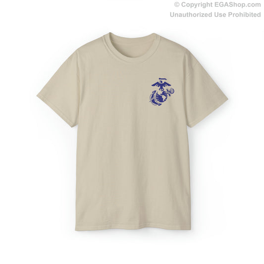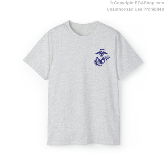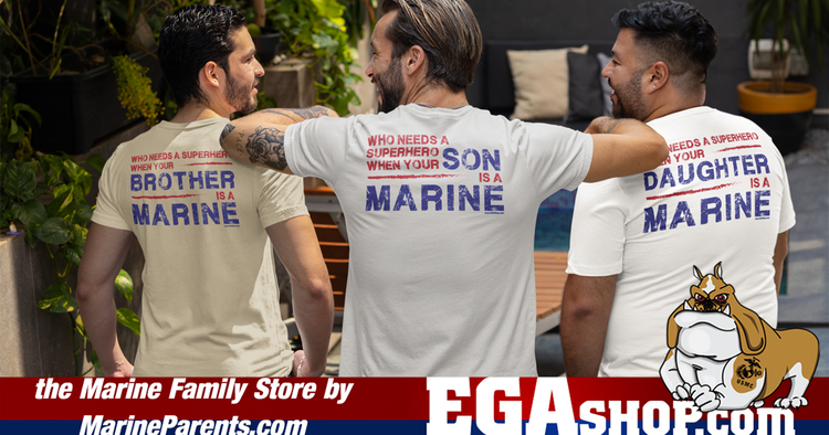 Patriotic design features the EGA on the front with back text "Who needs a superhero when your ____ is a Marine".