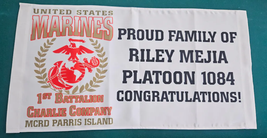 Made in the USA. This banner is easy to carry around while at graduation. It's foldable and packable, making it perfect for travel. One or two people can hold the banner at the moto run and graduation. The sides are hemmed with room for dowel rods (not included). Take it home after graduation and hang it at your Marine's graduation party!