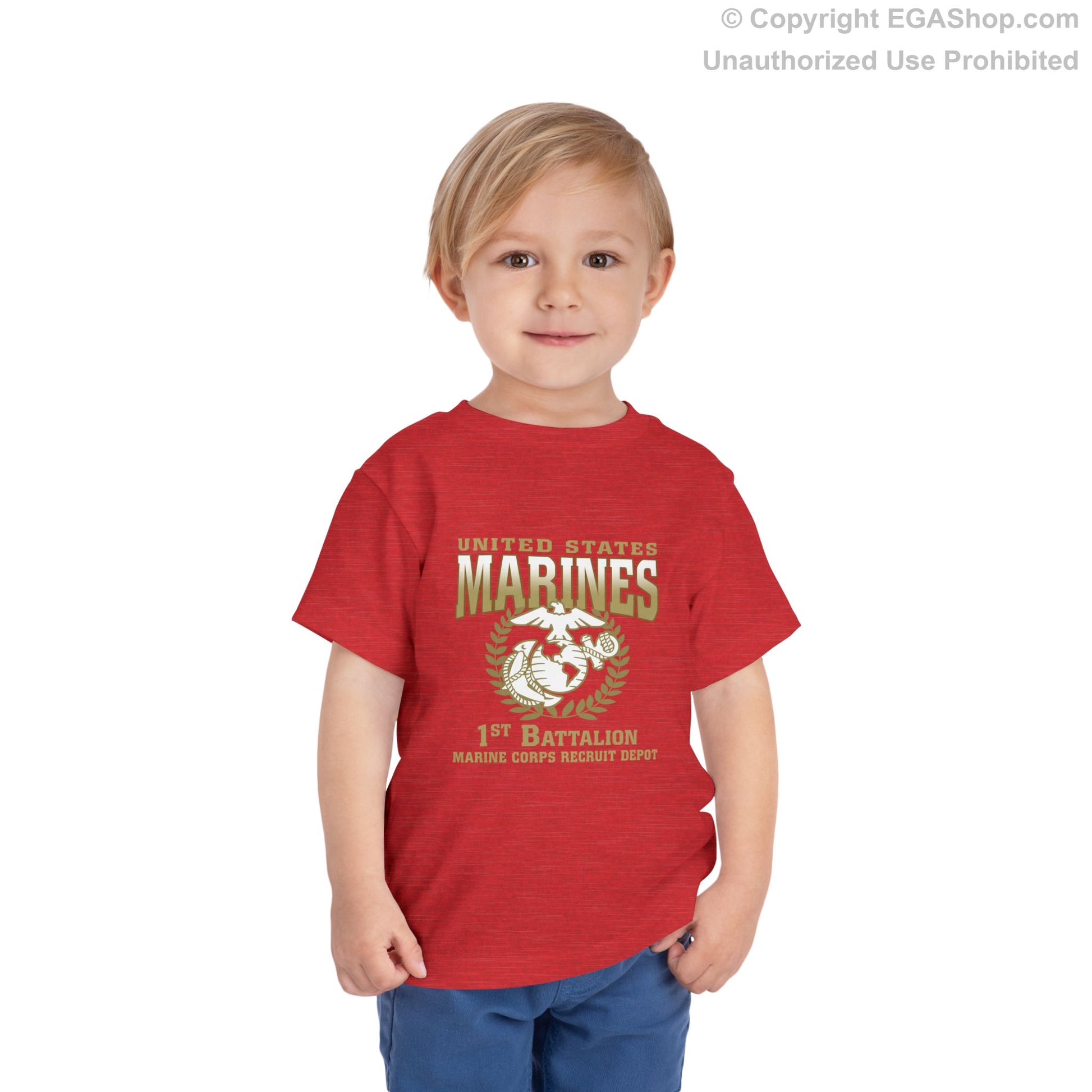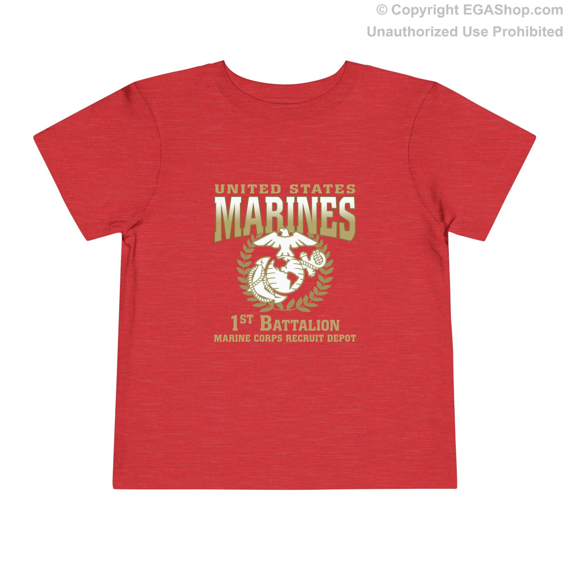 This is a TODDLER size shirt. This is our most affordable and popular Marine Corps boot camp T-shirt design. See our Toddler T-Shirt size charts.The front of the shirt features text United States Marines, the Eagle, Globe, and Anchor (EGA), and 1st Battalion Marine Corps Recruit Depot. The back is blank.