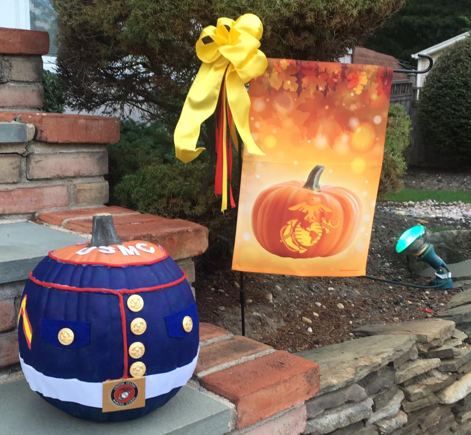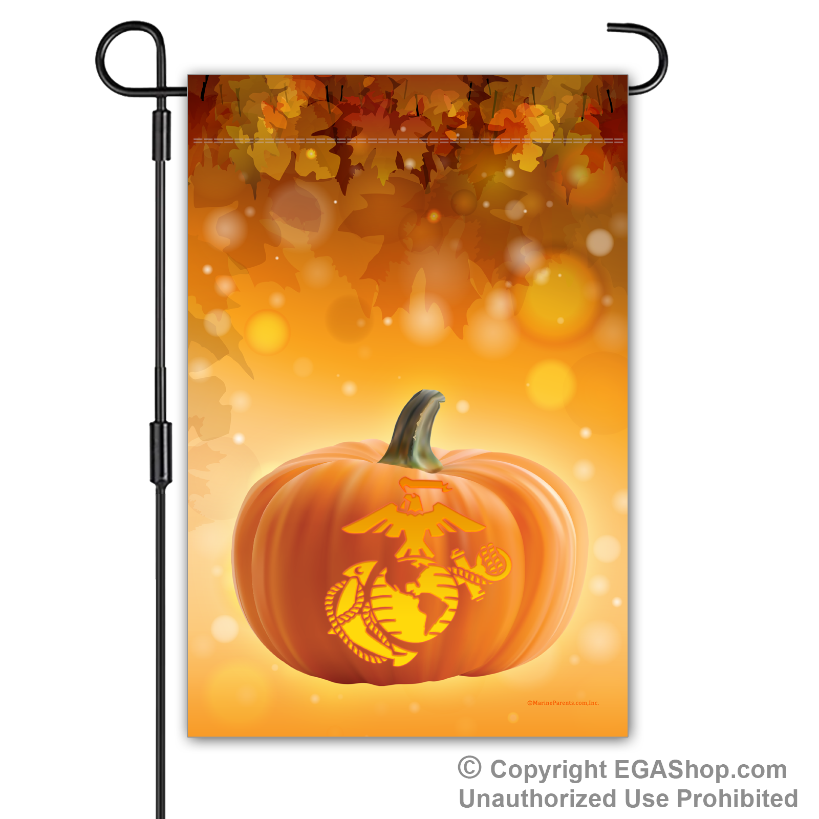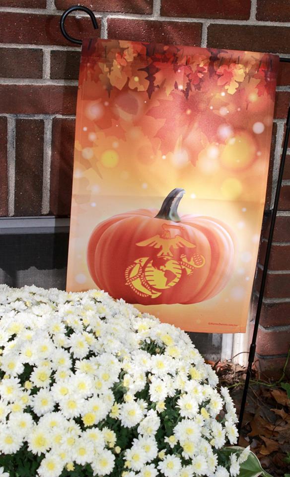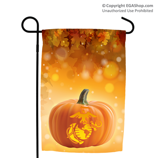 This flag features autumn leaves falling above a jack-o-lantern with an Eagle, Globe, and Anchor carved into it. The shape of the EGA is glowing inside the jack-o-lantern. Perfect for Halloween and Thanksgiving.