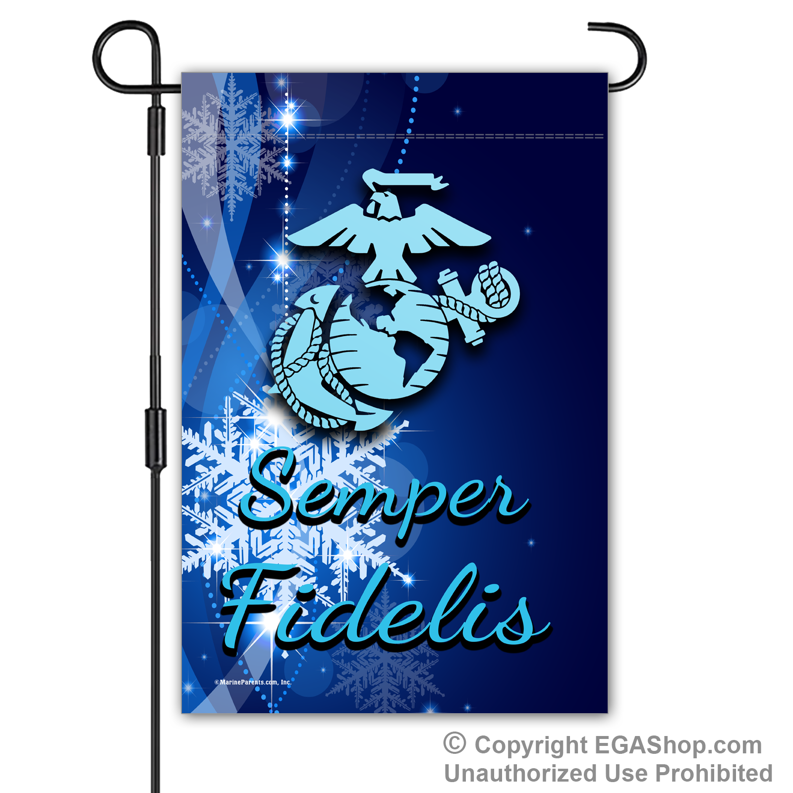 This flag features a blue snowflak background with the Marine Corps Eagle Globe, and Anchor and Semper Fidelis.