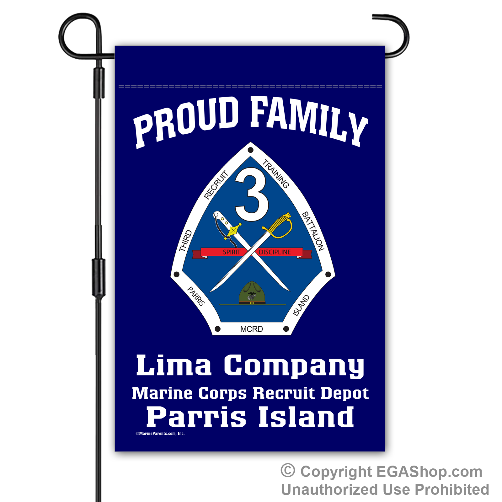 This garden flag represents 3rd Battalion PARRIS ISLAND LIMA COMPANY and includes the 3rd Recruit Training Battalion Crest with the text PROUD FAMILY at the top. Show your pride in your recruit for 13 weeks of boot camp!