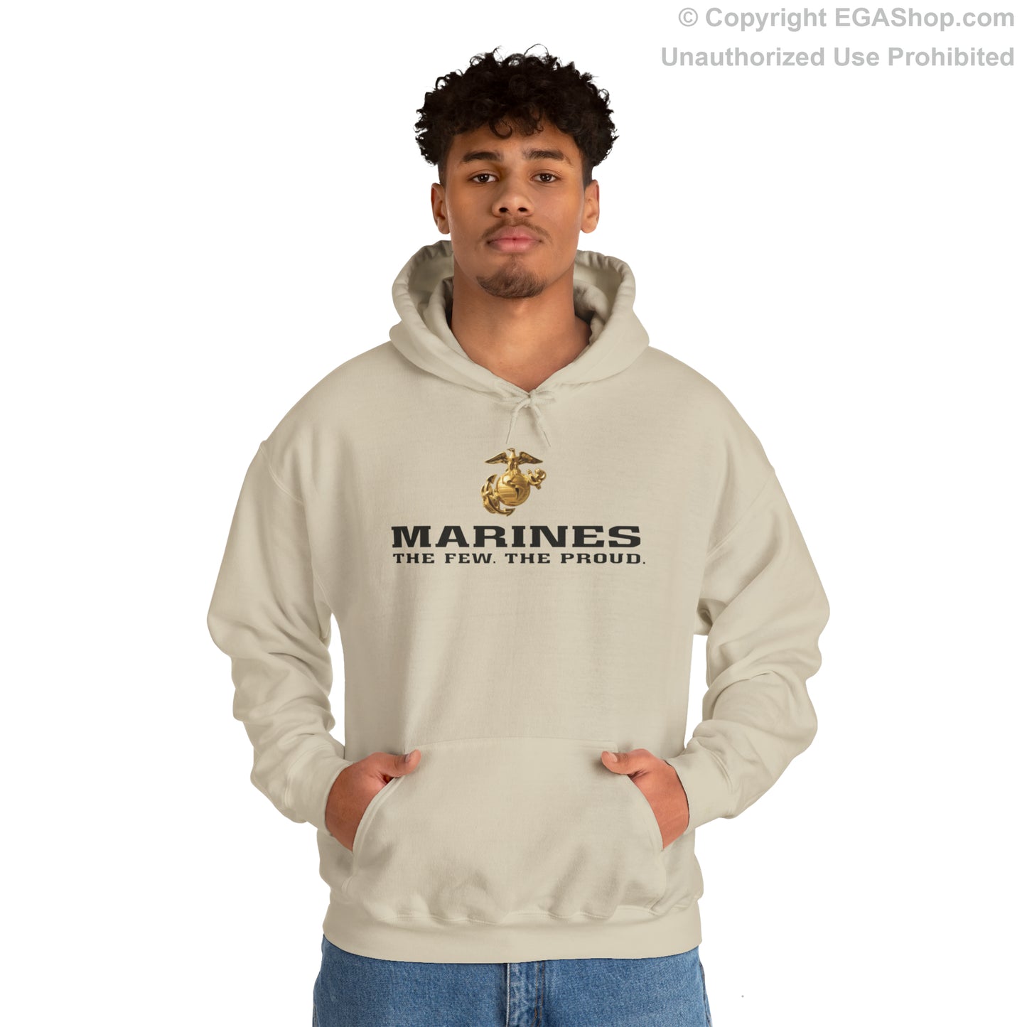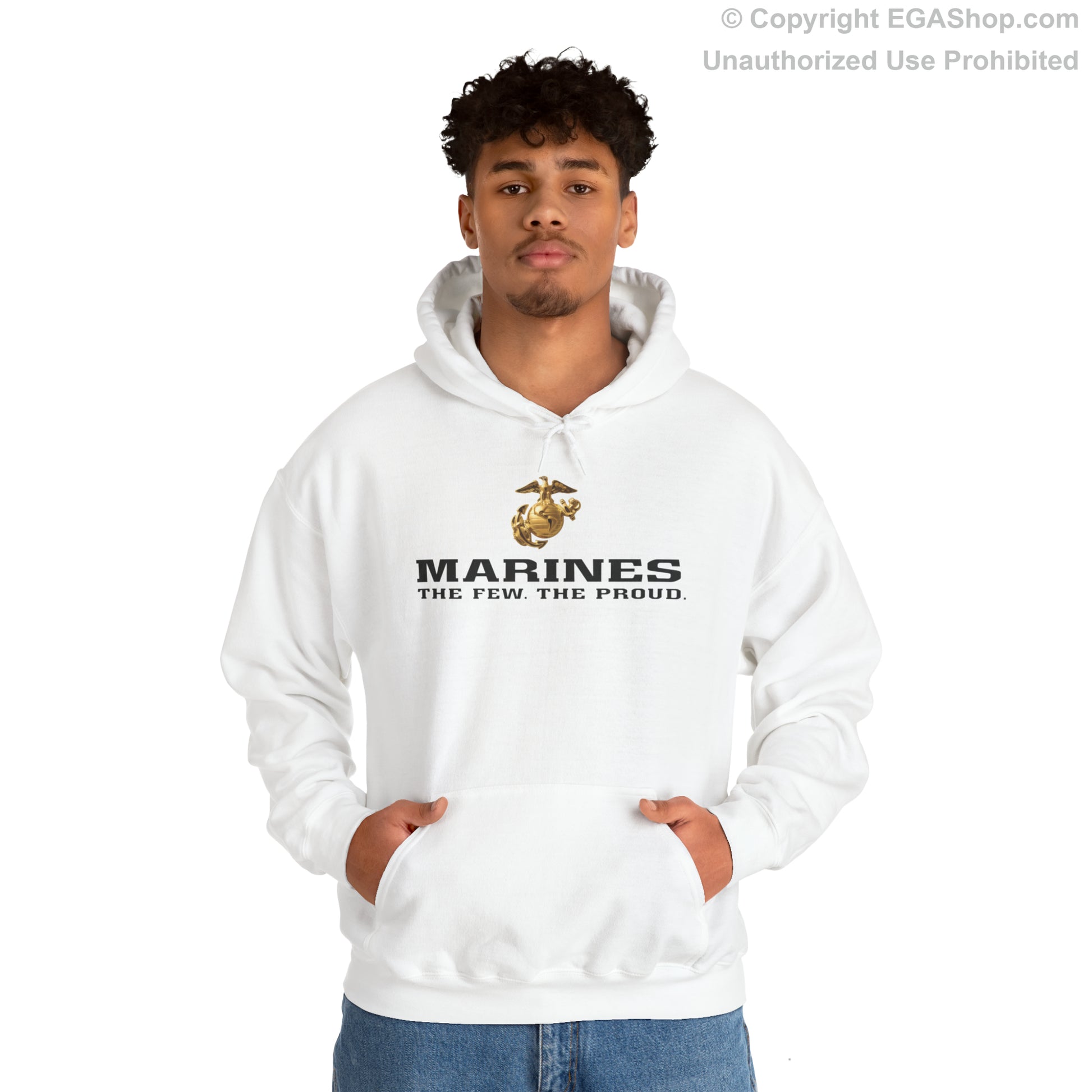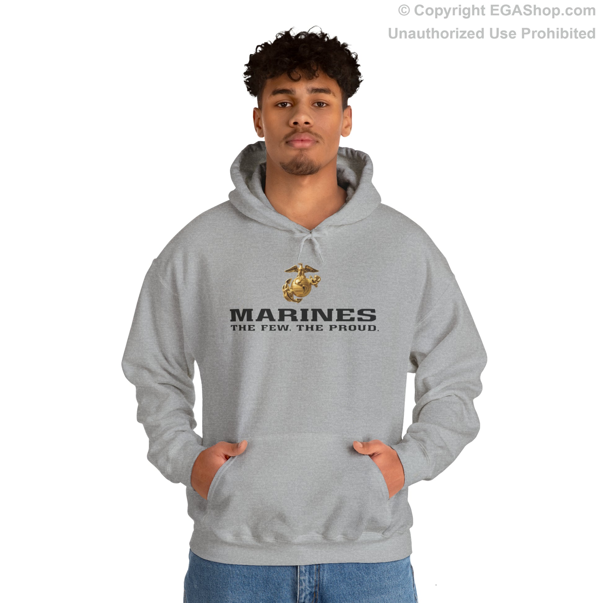 This is the classic. The realistic gold Eagle, Globe, and Anchor (EGA) is beautiful. The text below reads, "Marines. The Few. The Proud." It is THE classic Marine Corps hoodie. Anyone can wear this design any time in a show of support for our United States Marines.