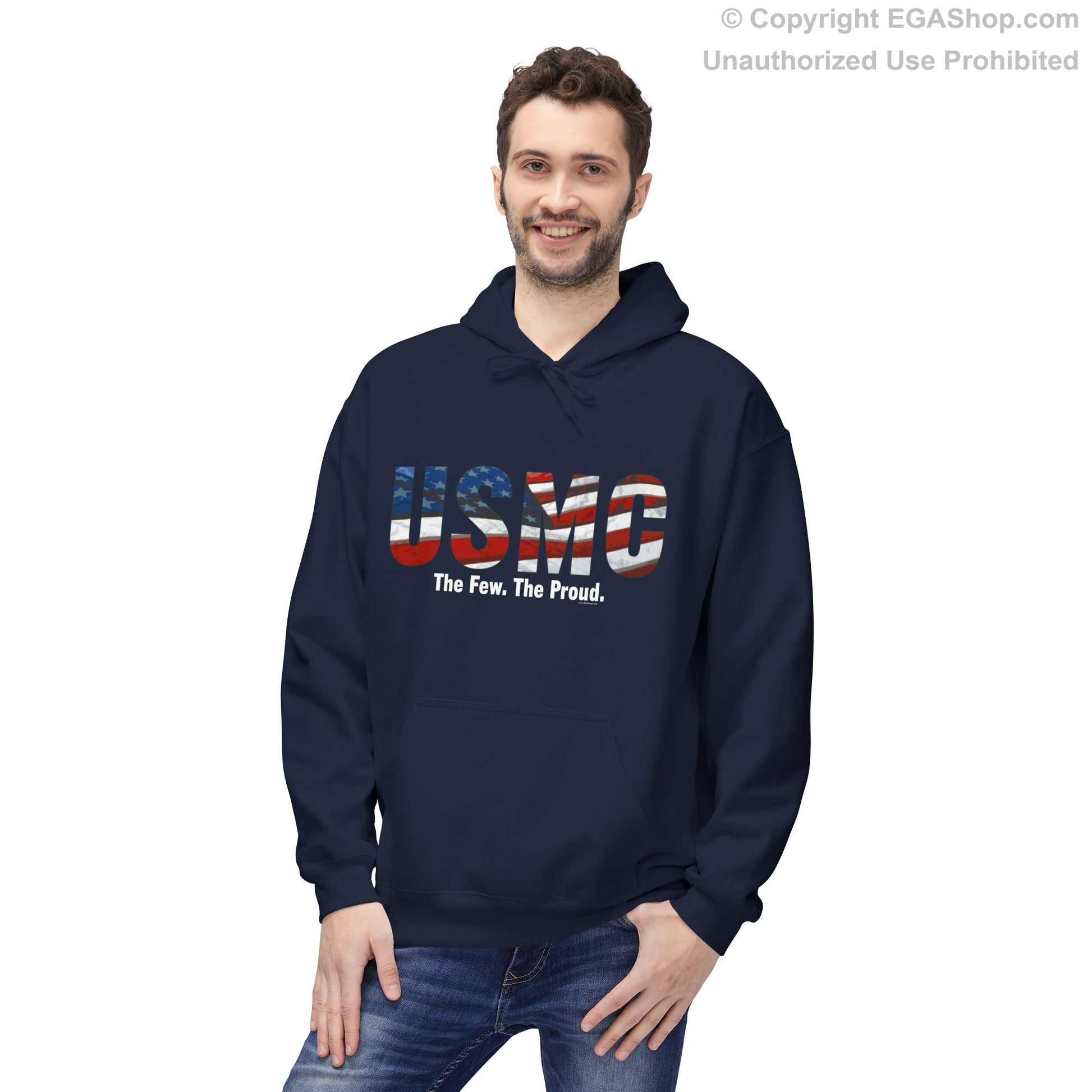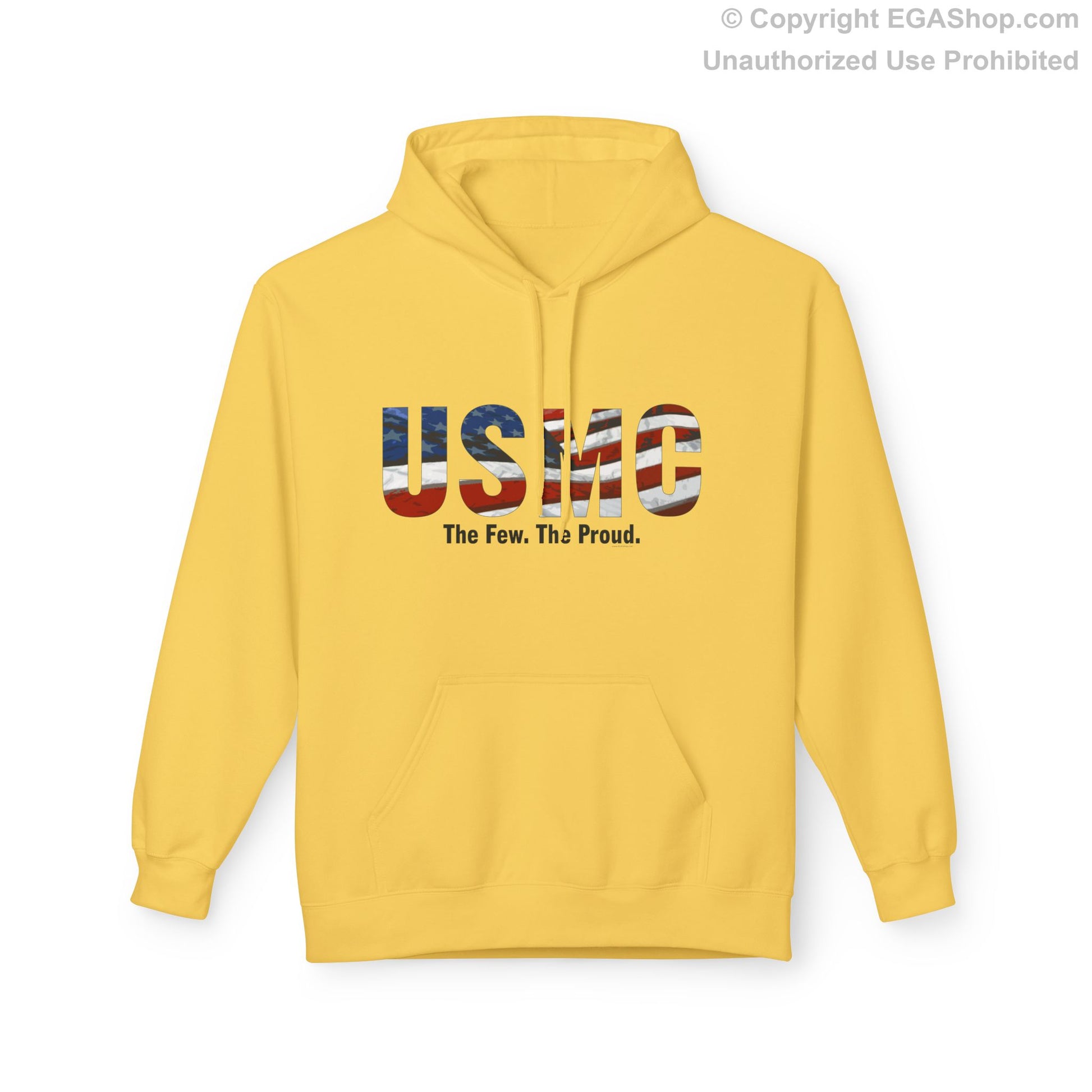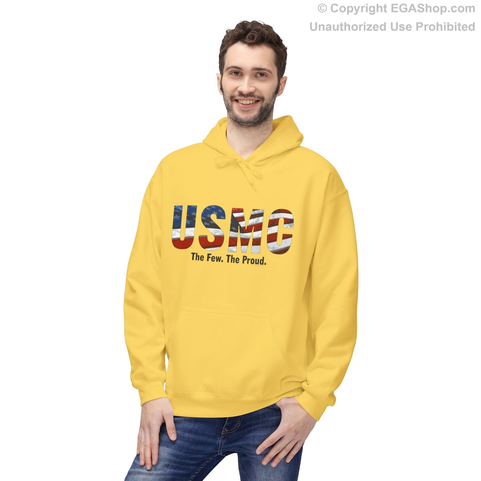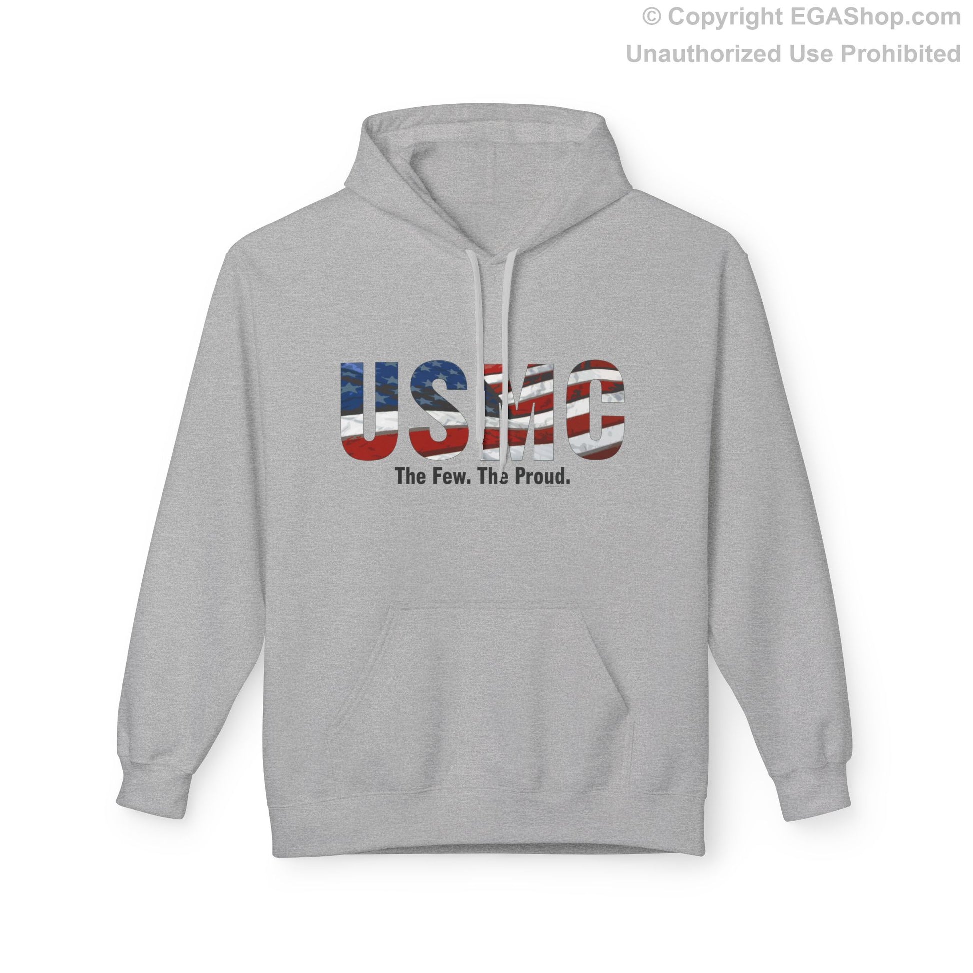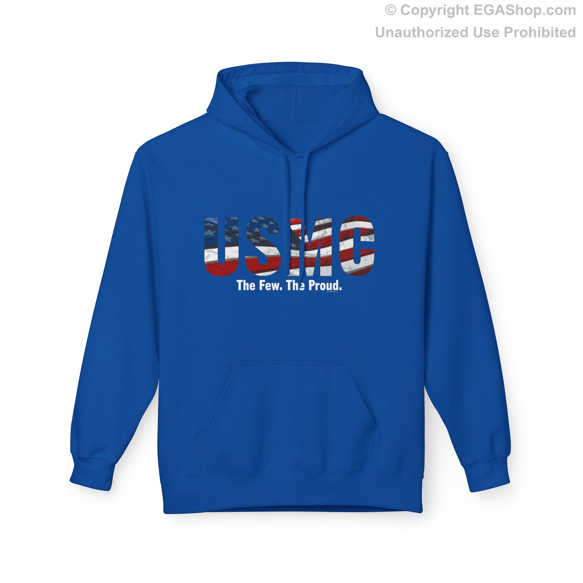 The design on the front of the hoodie is American Flag text USMC with The Few The Proud below. In adult sizes up to 5X. Gildan adult unisex, classic fit with a tear-away label.