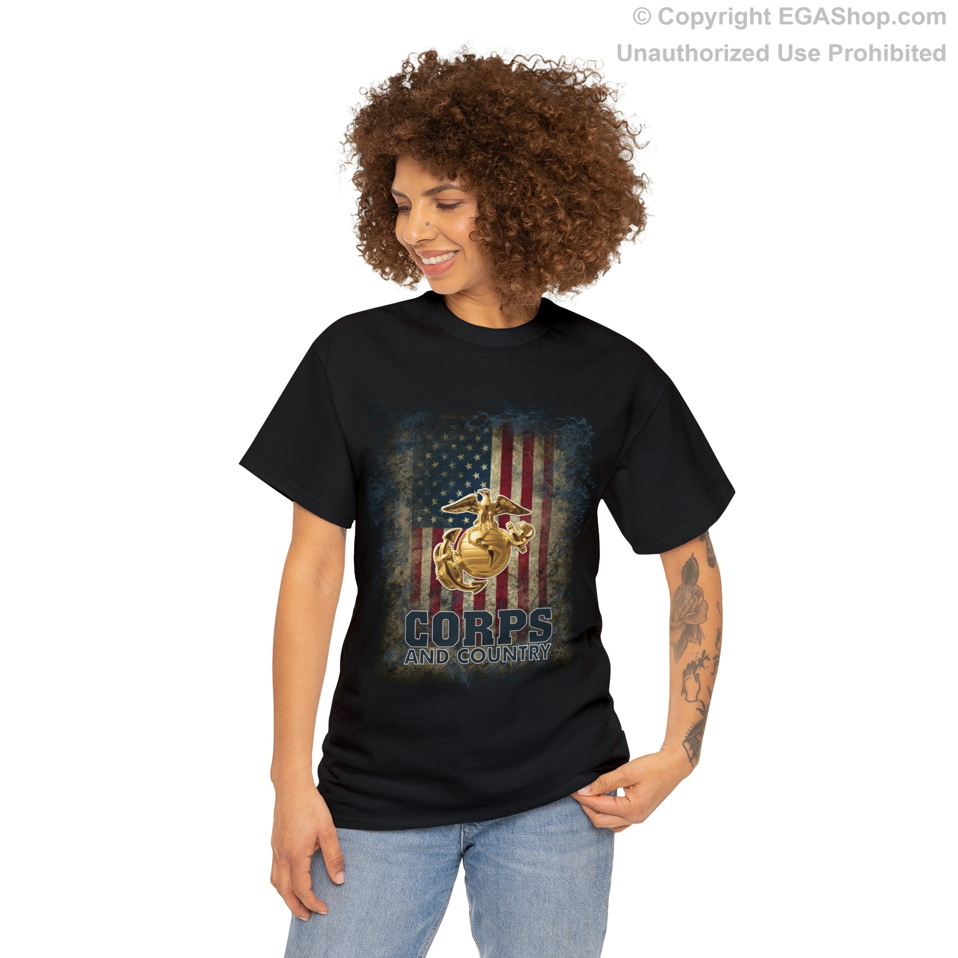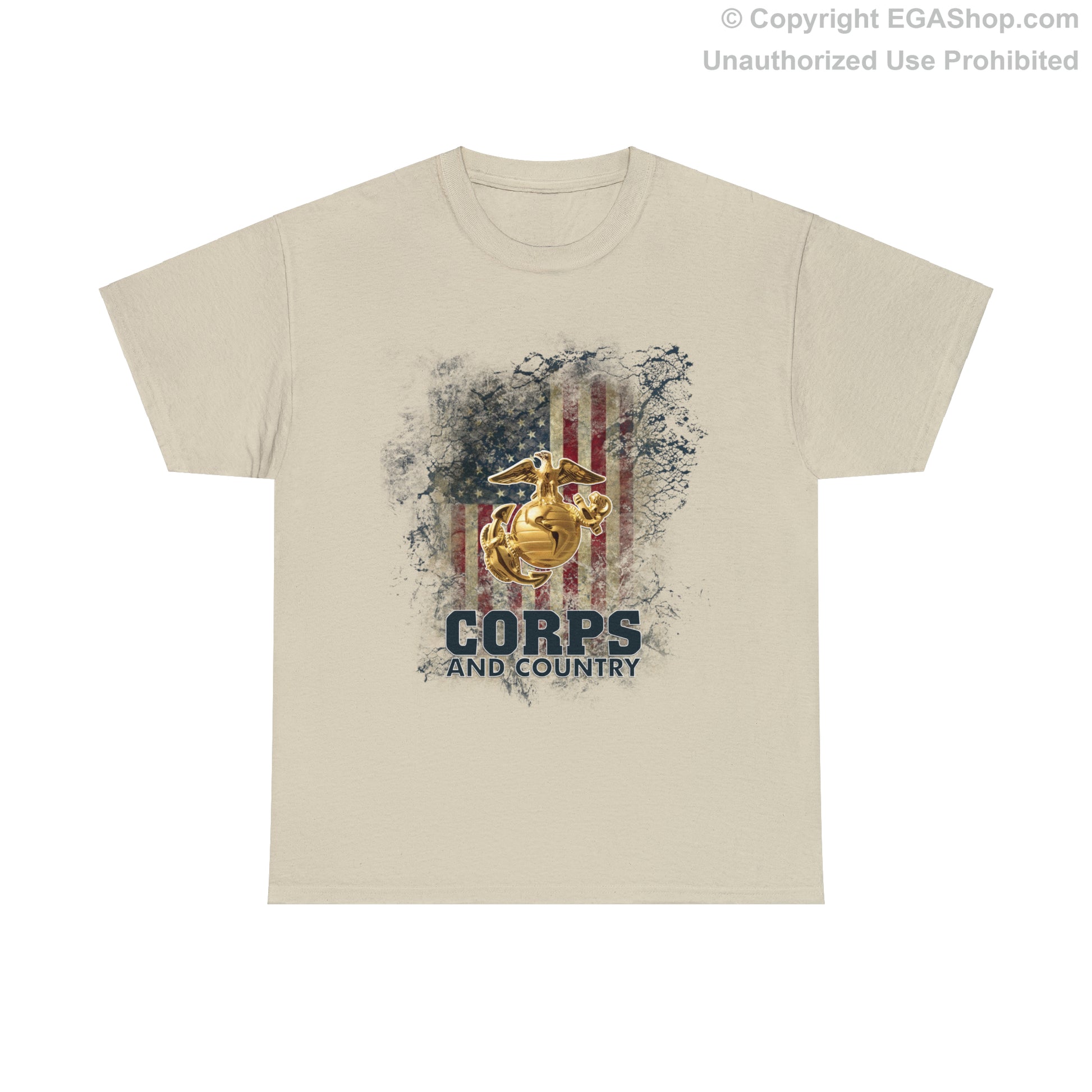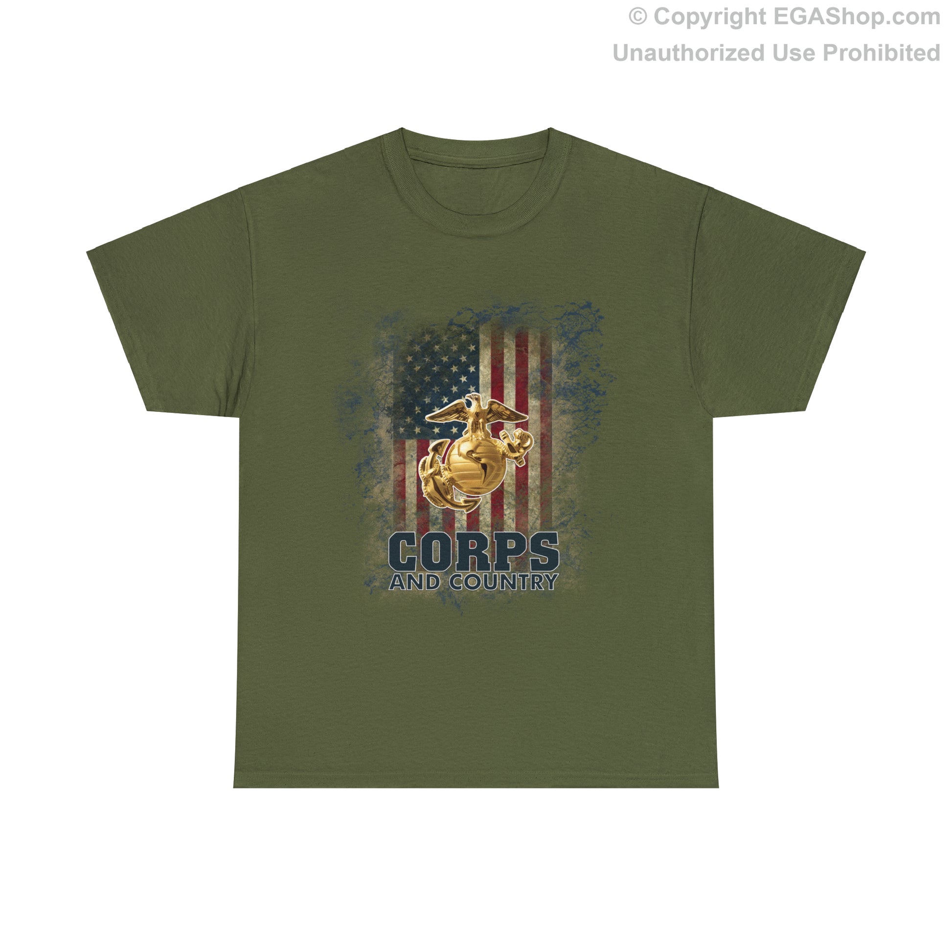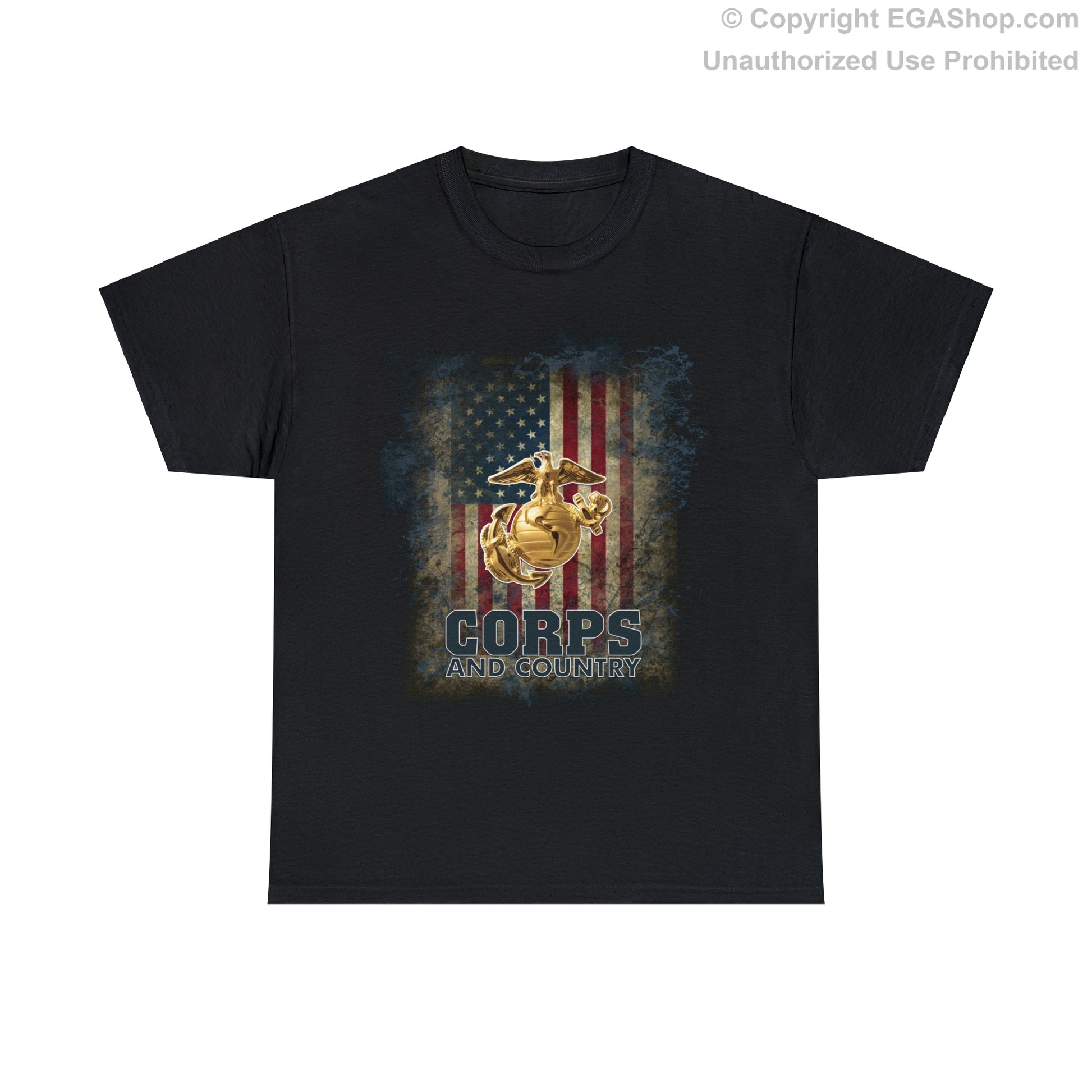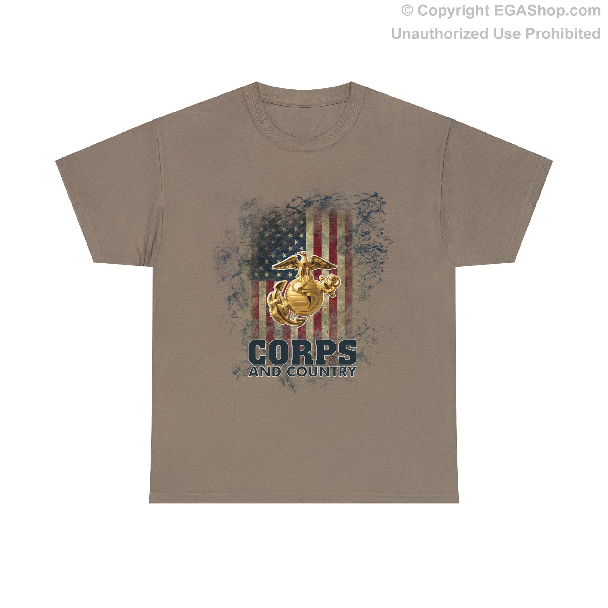 This design features the Eagle, Globe, and Anchor (EGA) over the American Flag with text below that reads "Corps and Country." The design is grungy and faded. The design will be subdued on darker shirts. Share your pride in our Country and the Corps!