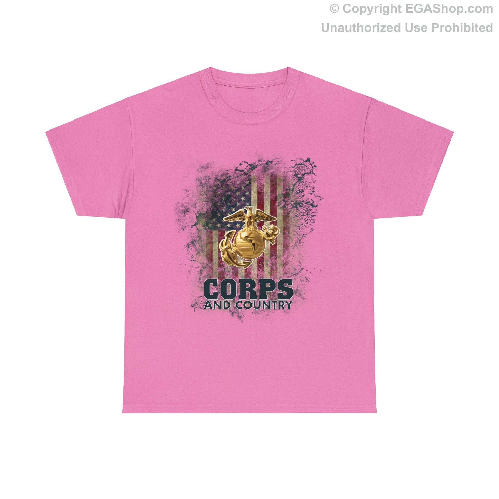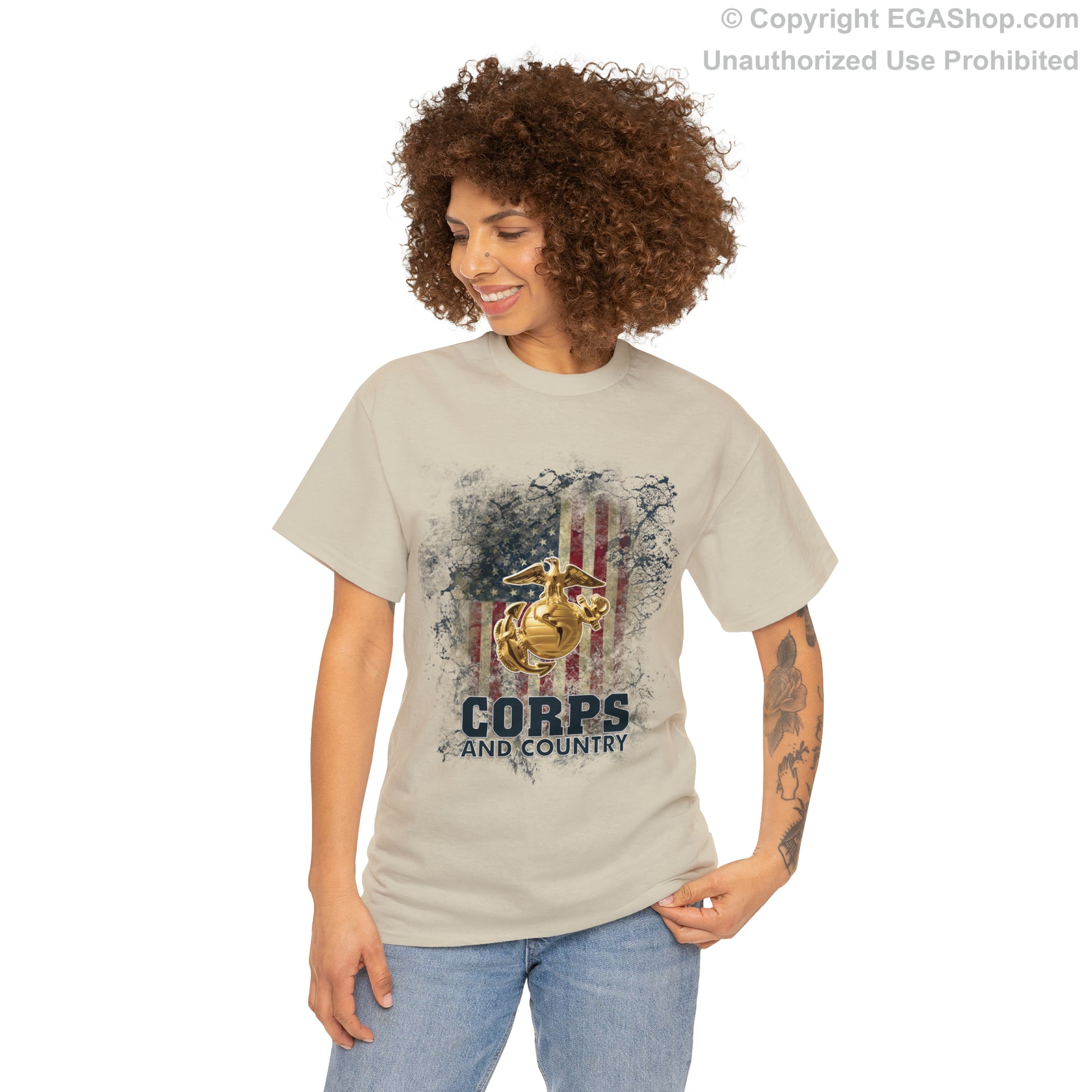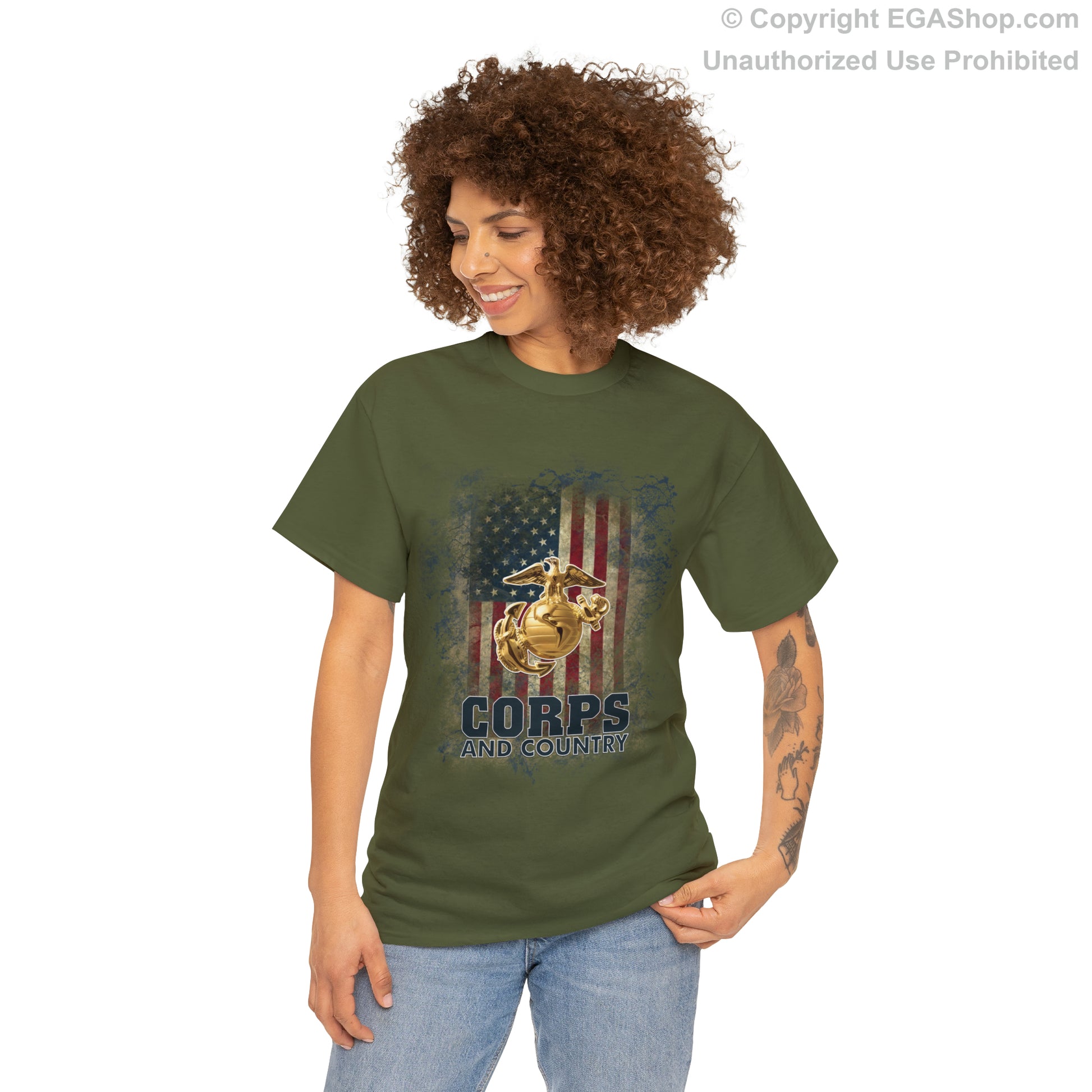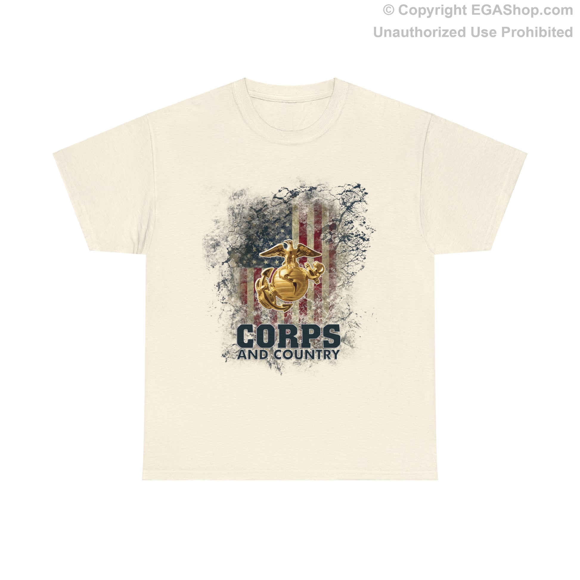 This design features the Eagle, Globe, and Anchor (EGA) over the American Flag with text below that reads "Corps and Country." The design is grungy and faded. The design will be subdued on darker shirts. Share your pride in our Country and the Corps!