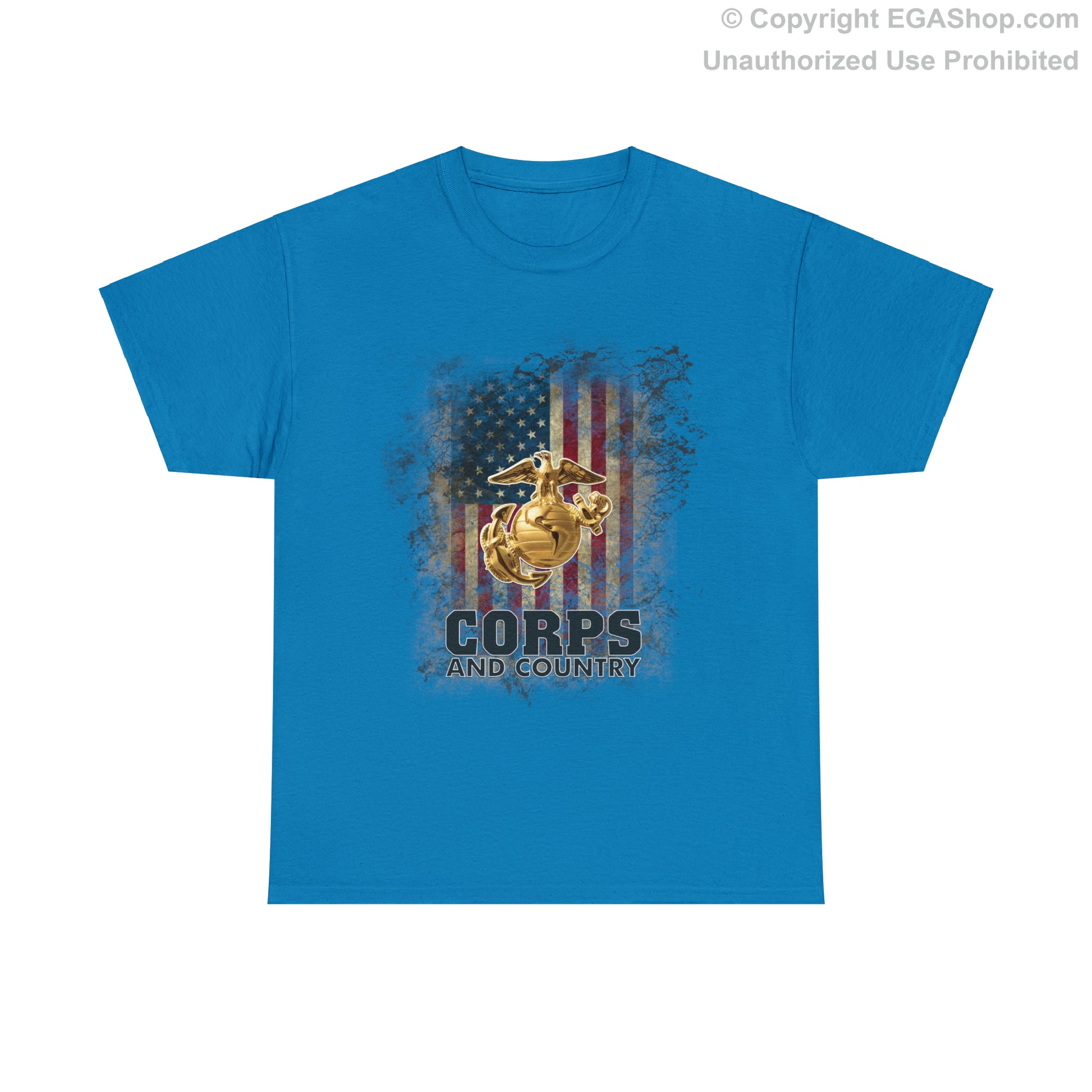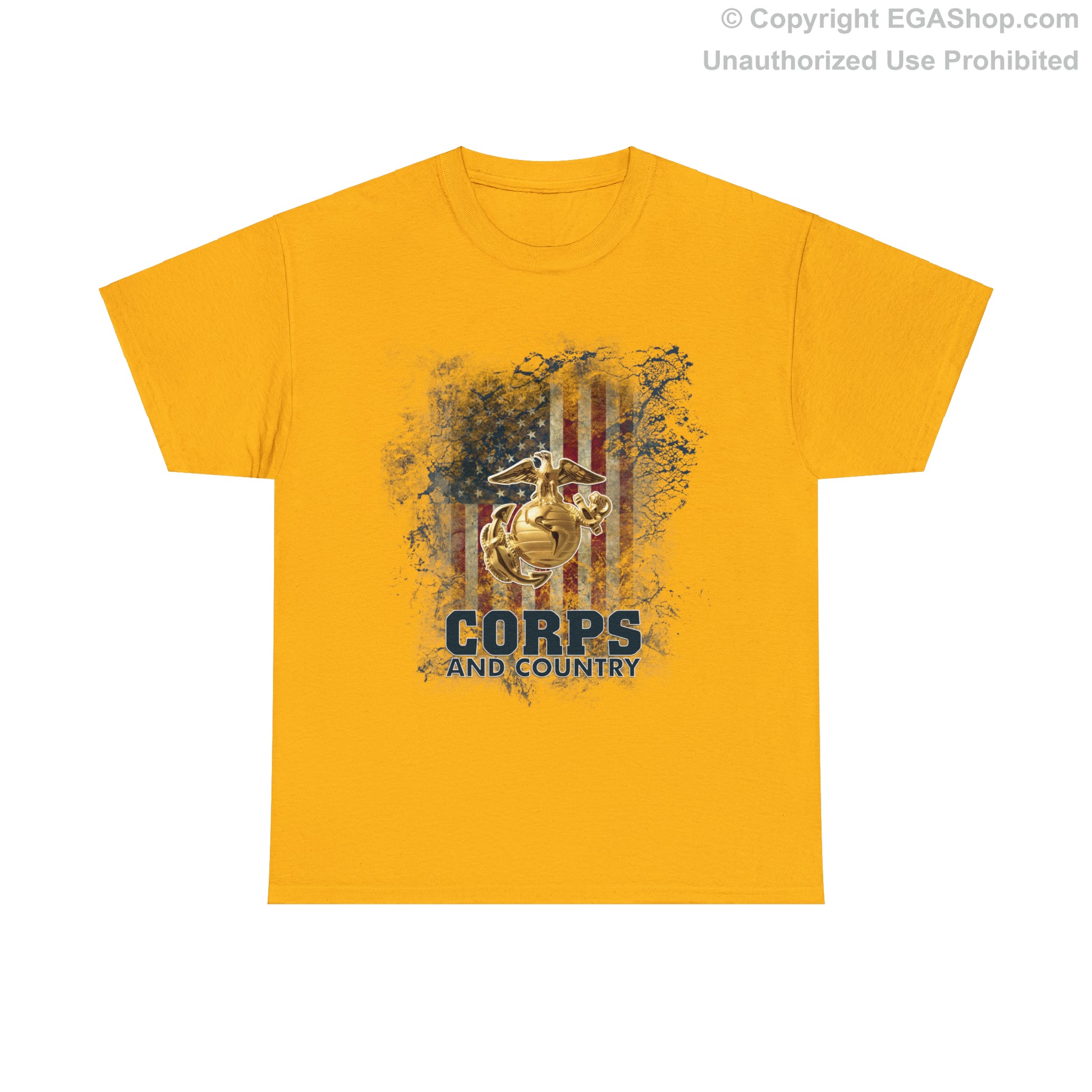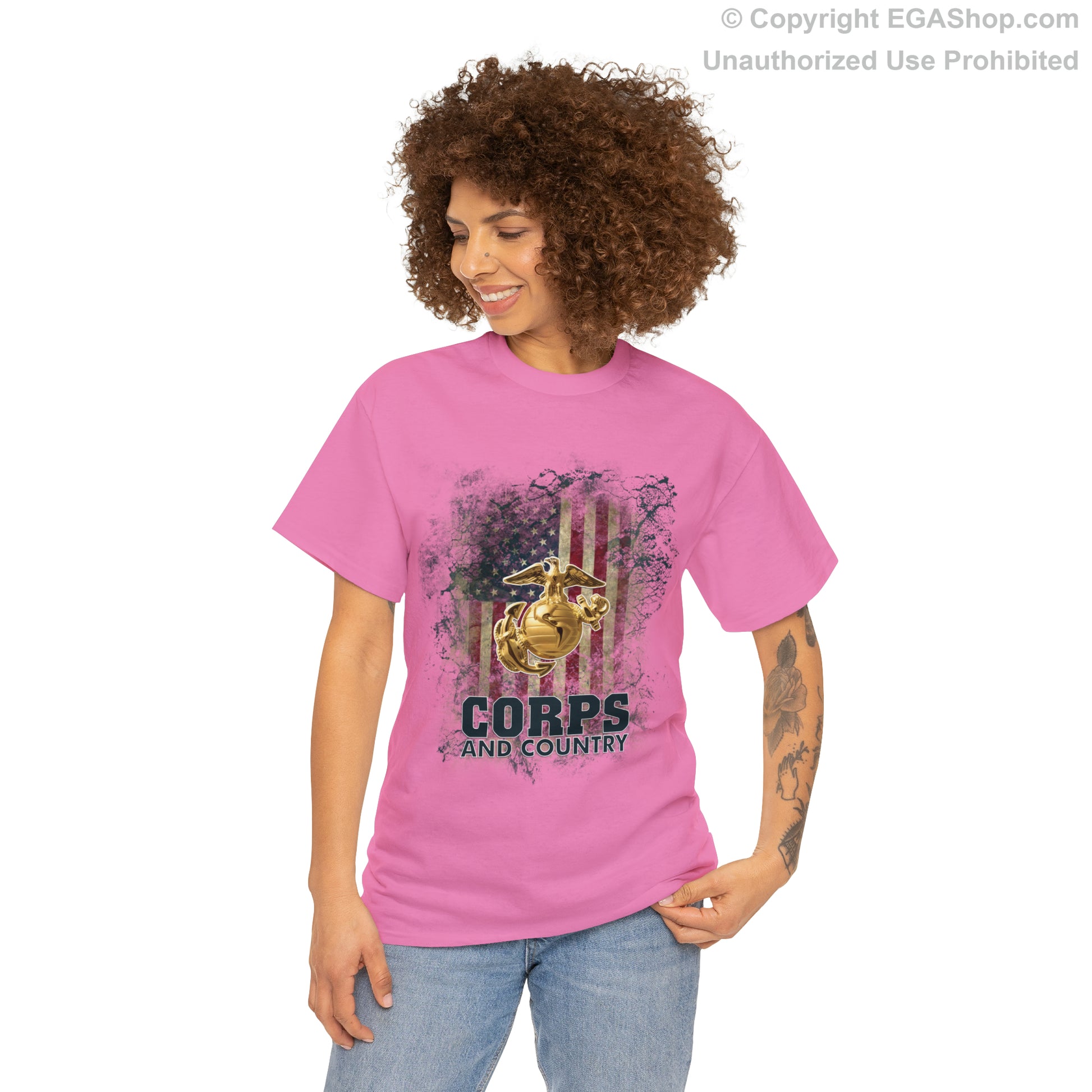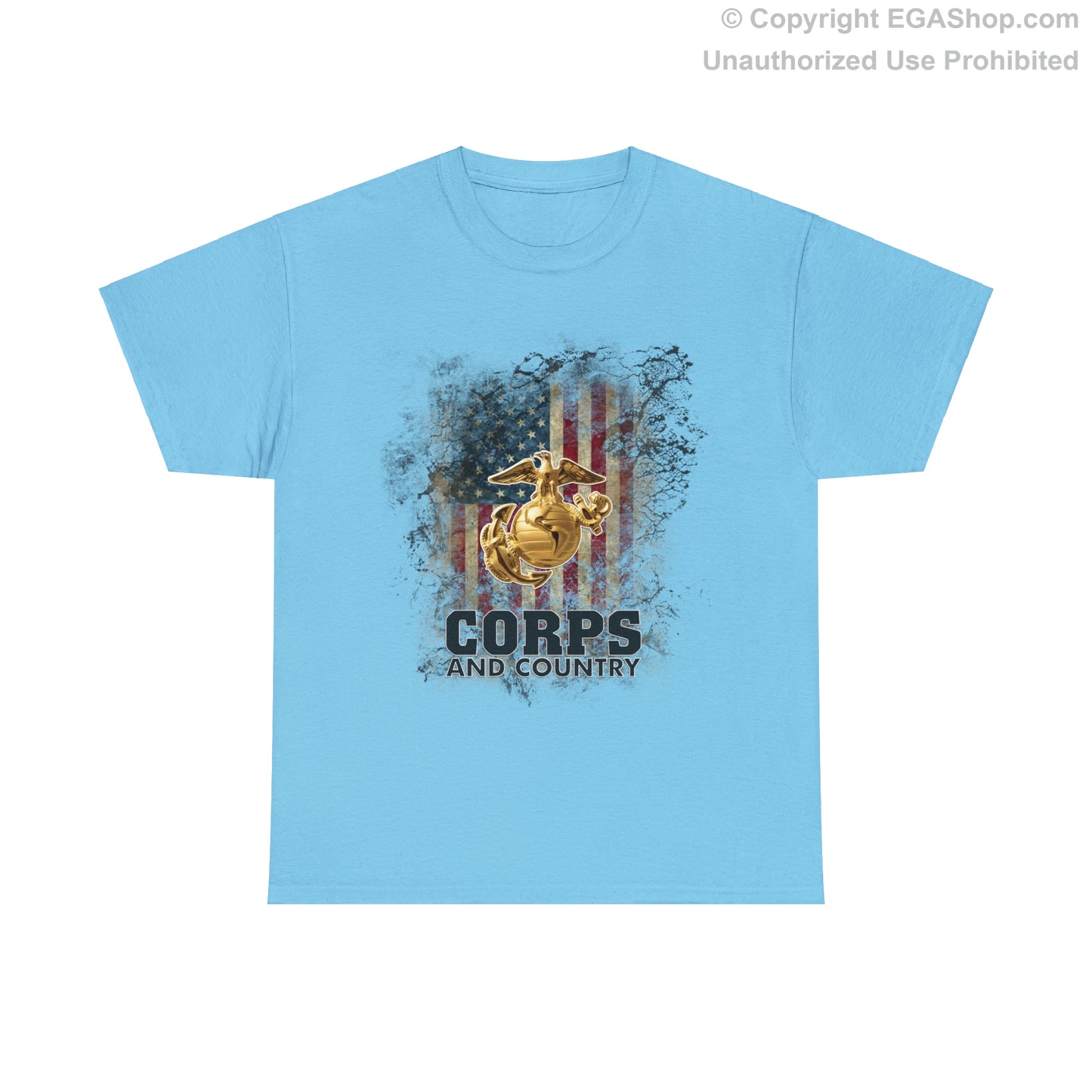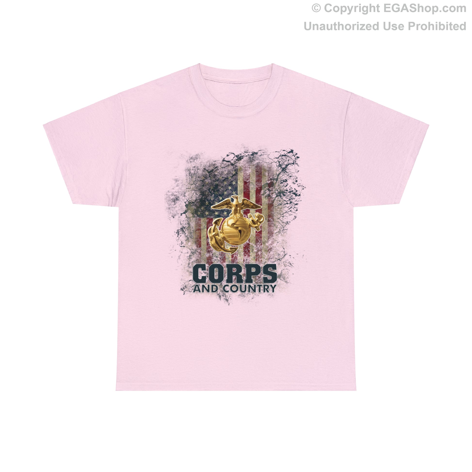 This design features the Eagle, Globe, and Anchor (EGA) over the American Flag with text below that reads "Corps and Country." The design is grungy and faded. The design will be subdued on darker shirts. Share your pride in our Country and the Corps!