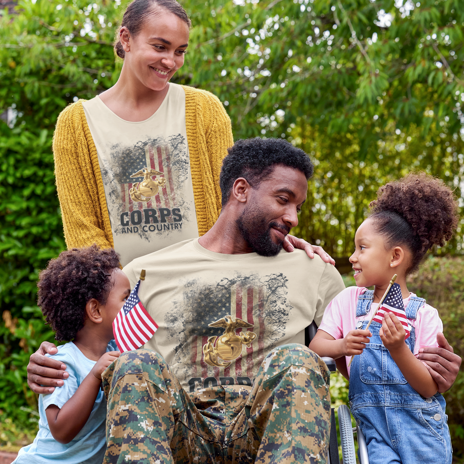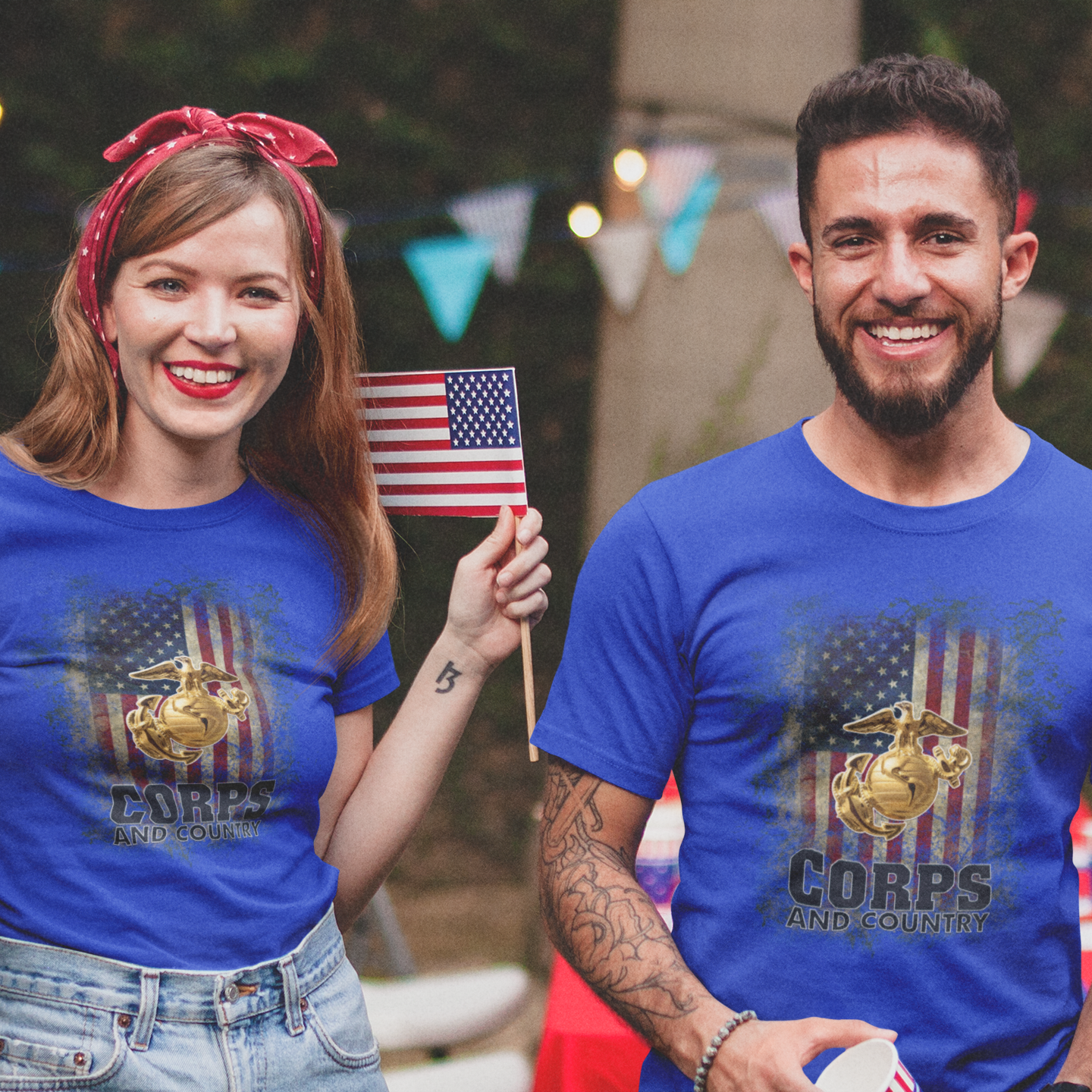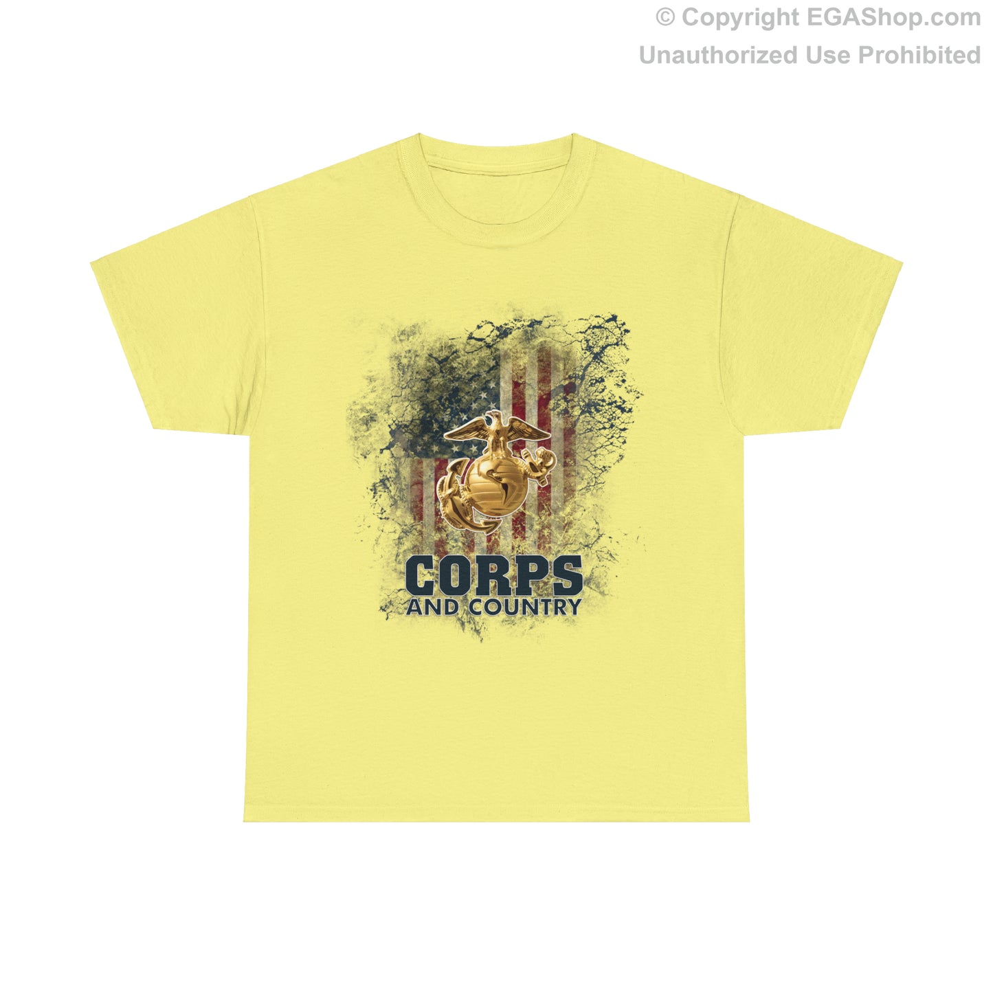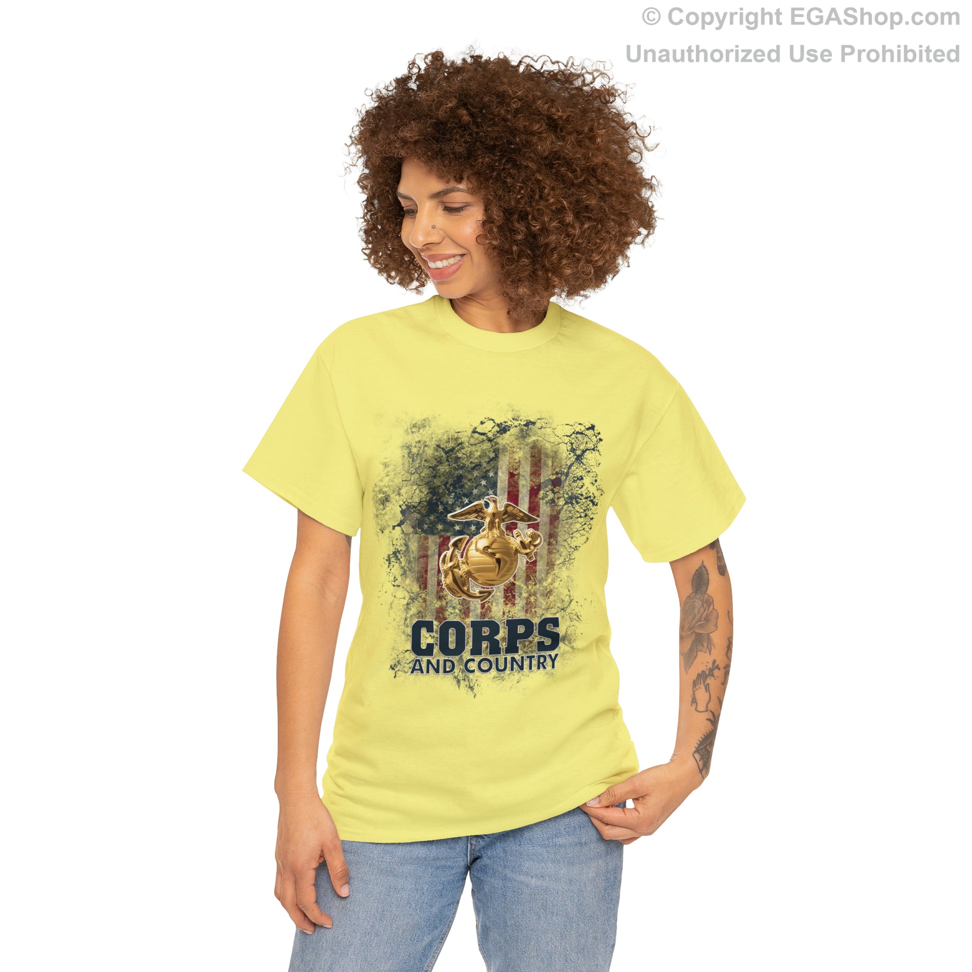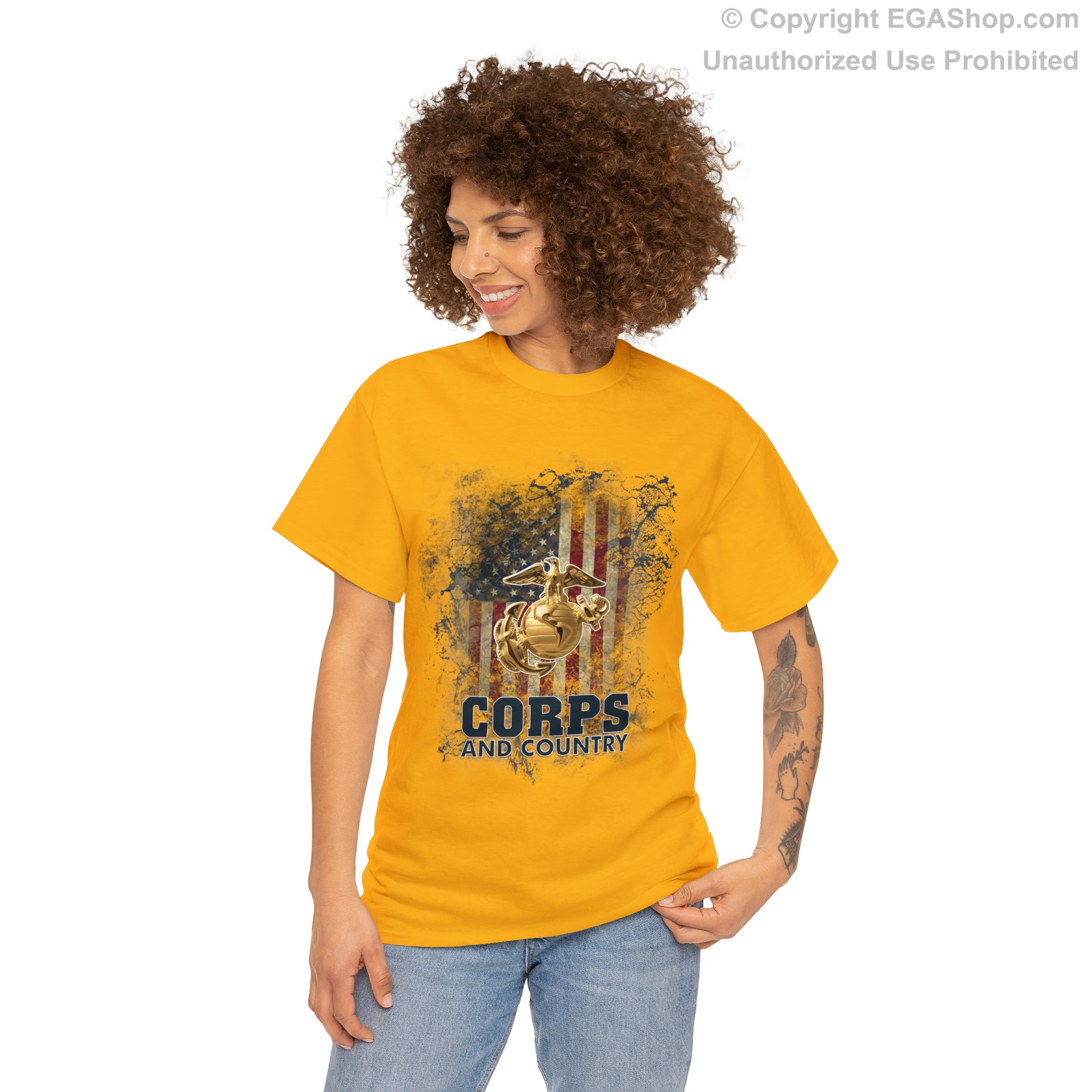 This design features the Eagle, Globe, and Anchor (EGA) over the American Flag with text below that reads "Corps and Country." The design is grungy and faded. The design will be subdued on darker shirts. Share your pride in our Country and the Corps!