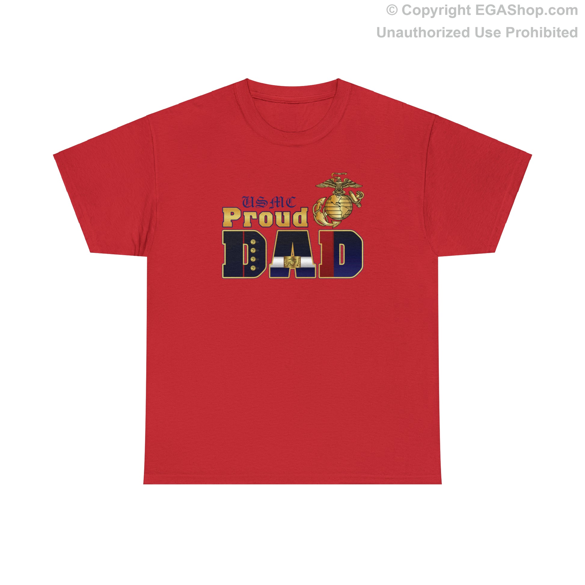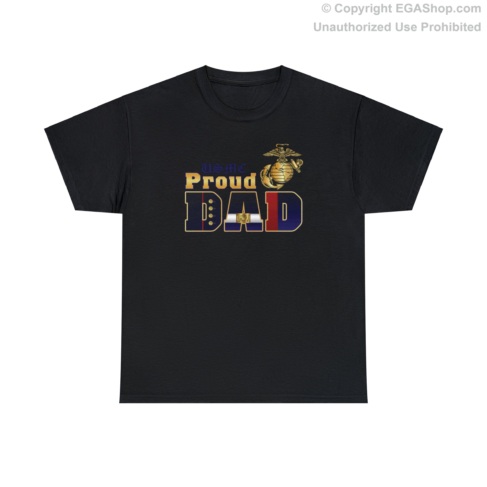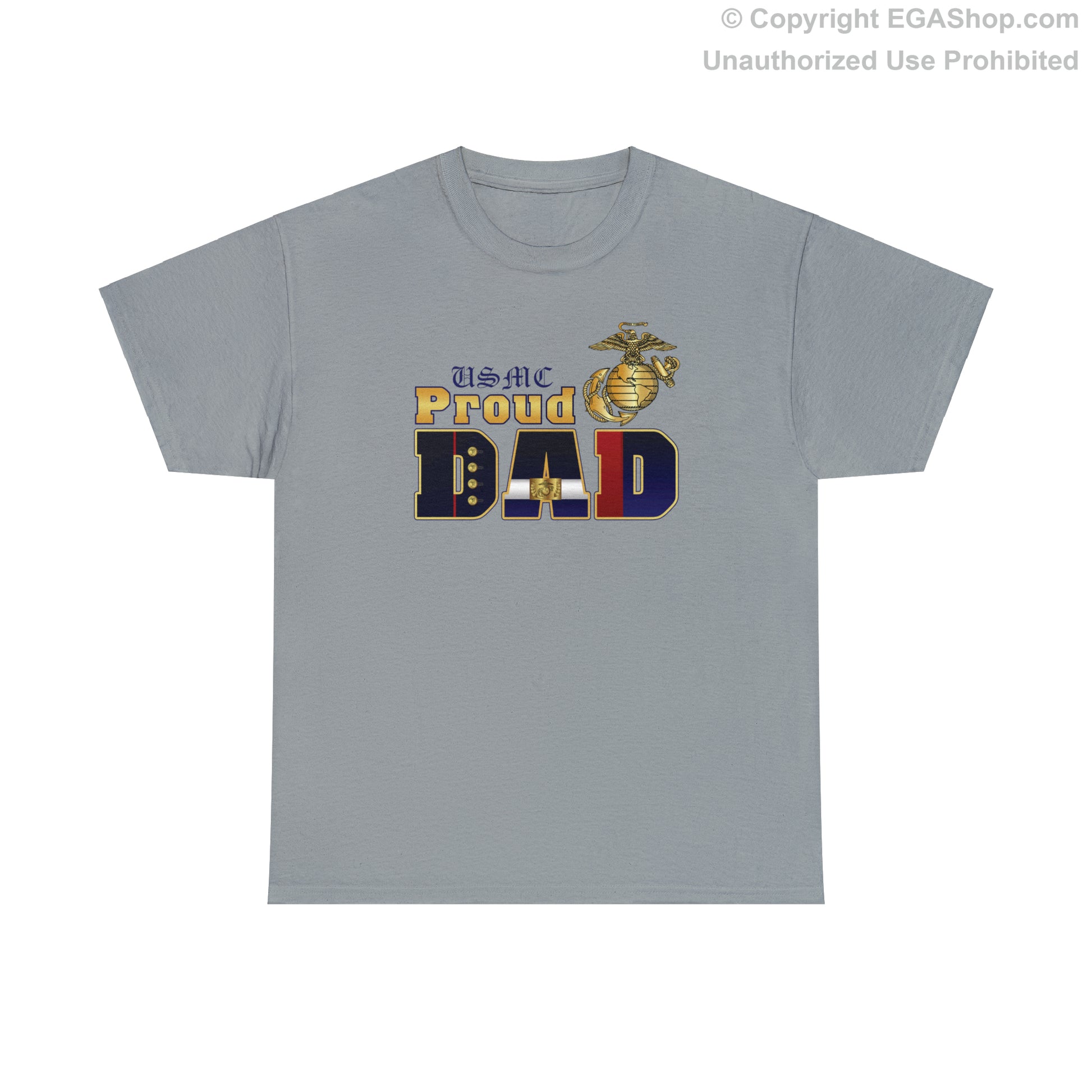 Our T-shirt has the Marine Corps Dress Blue Proud Dad design on the front with the Eagle, Globe, and Anchor (EGA). The back is blank. Short sleeve. In your choice of colors. An EGA Shop exclusive.
