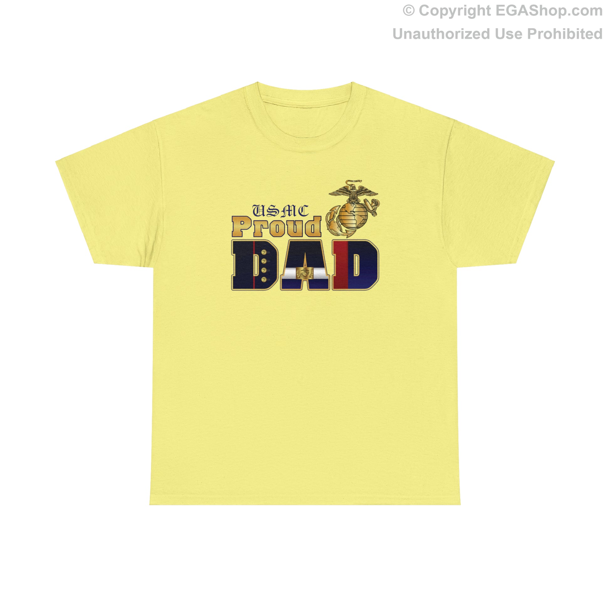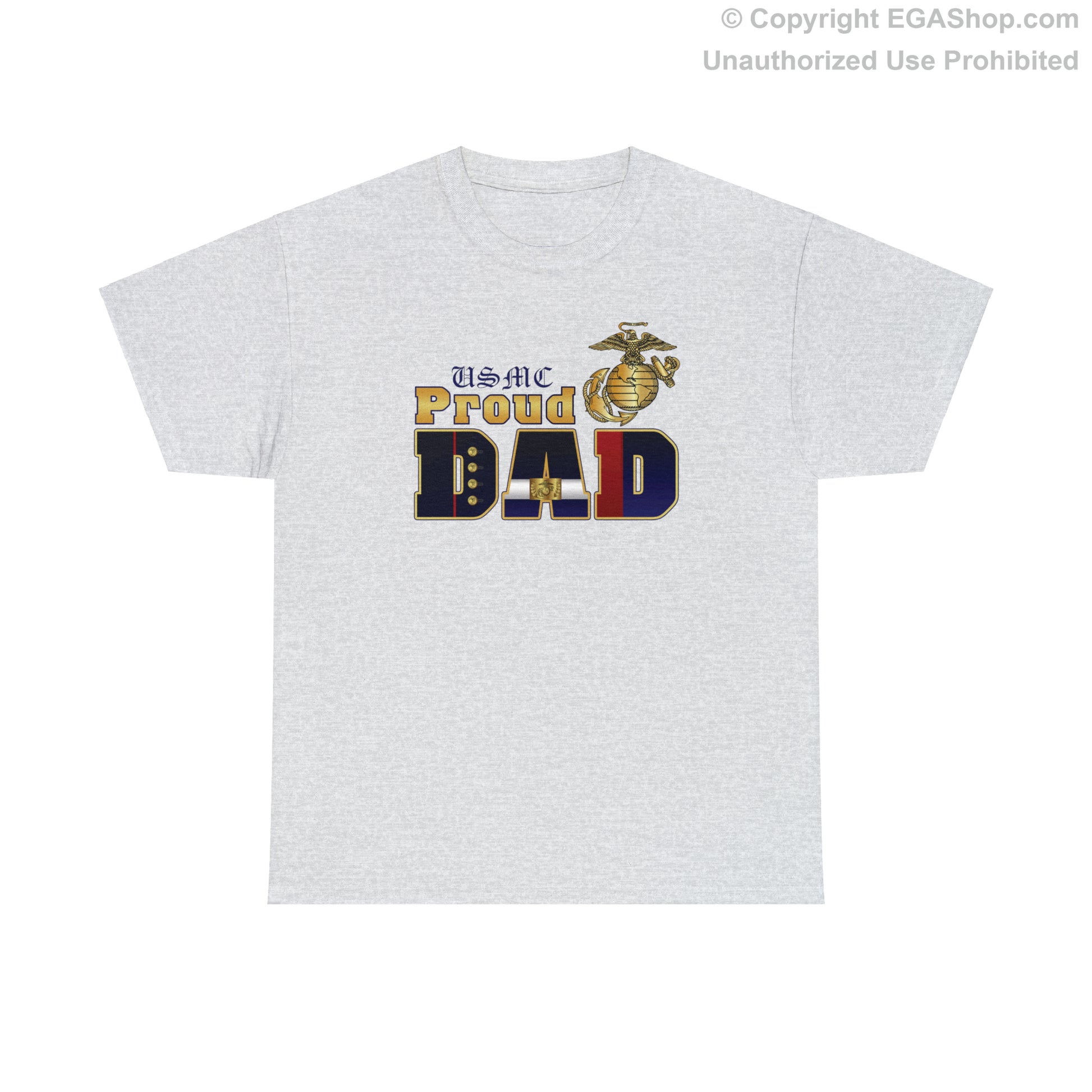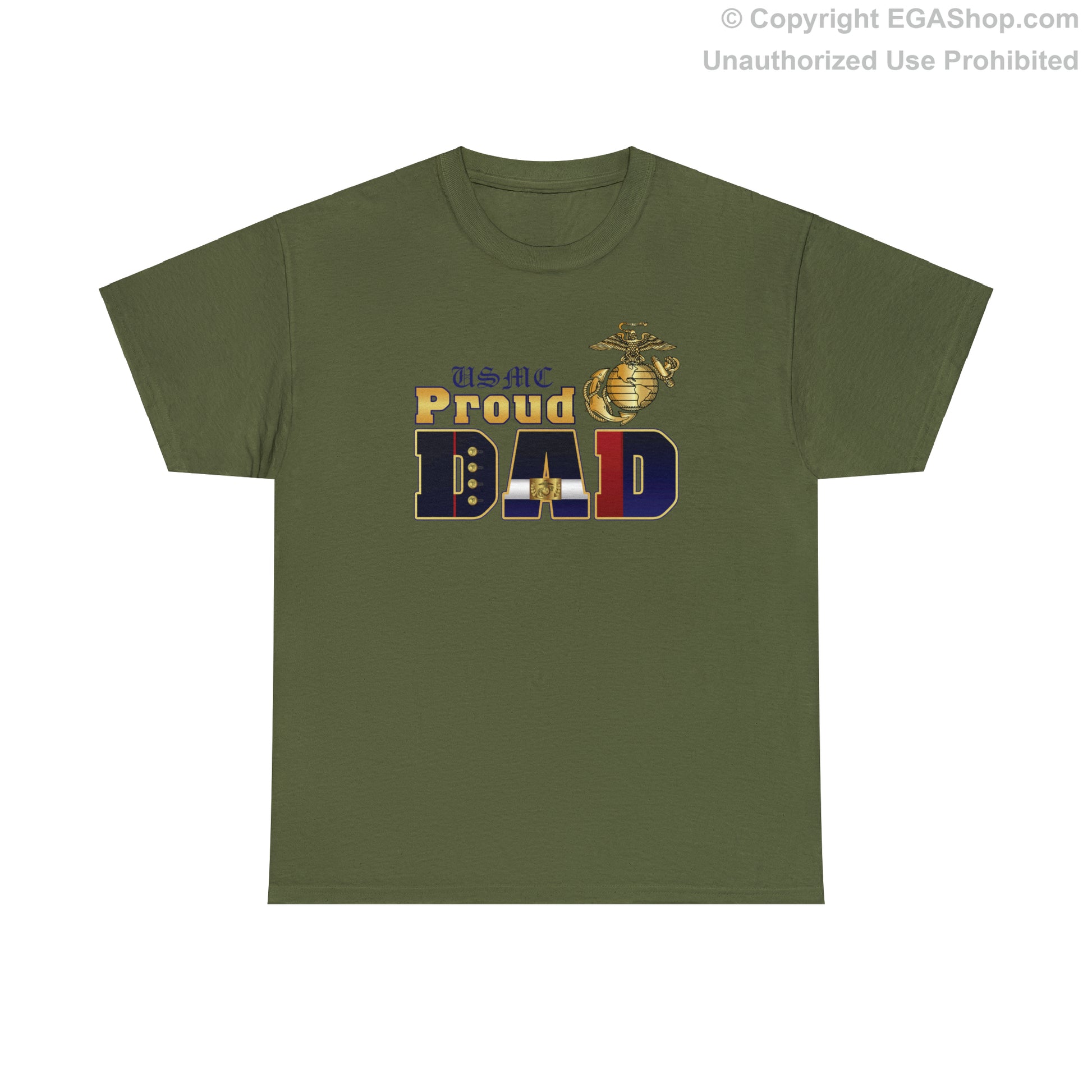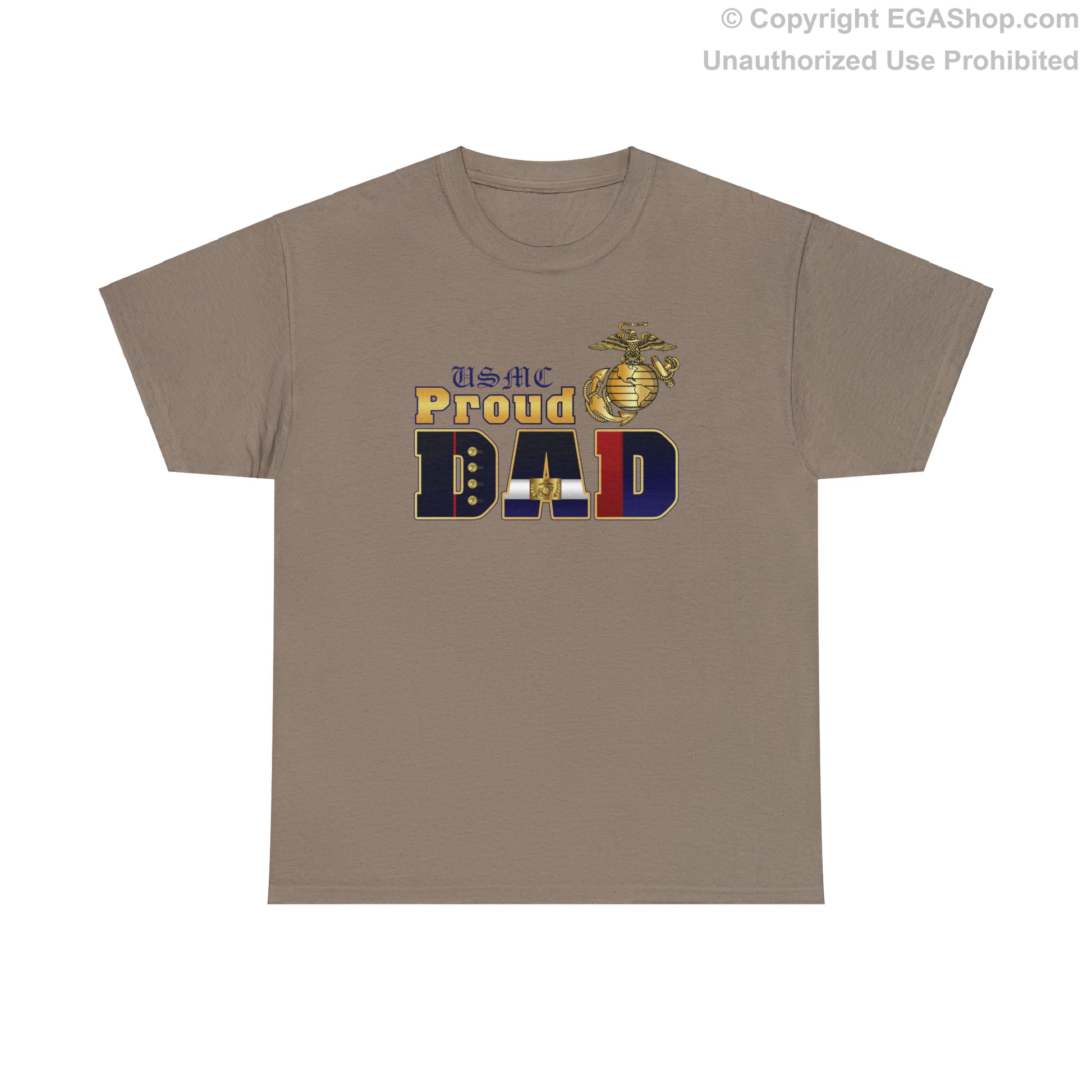 Our T-shirt has the Marine Corps Dress Blue Proud Dad design on the front with the Eagle, Globe, and Anchor (EGA). The back is blank. Short sleeve. In your choice of colors. An EGA Shop exclusive.