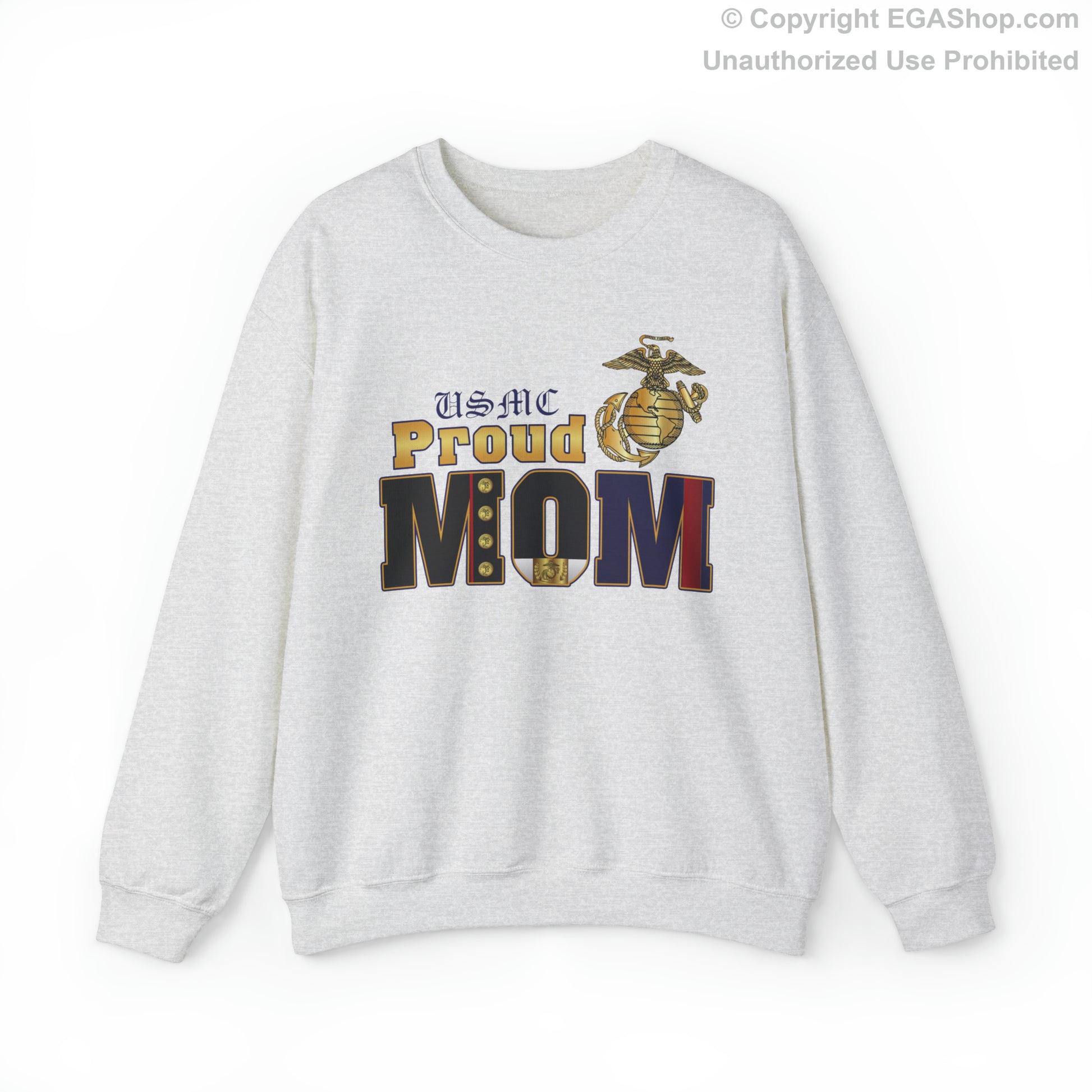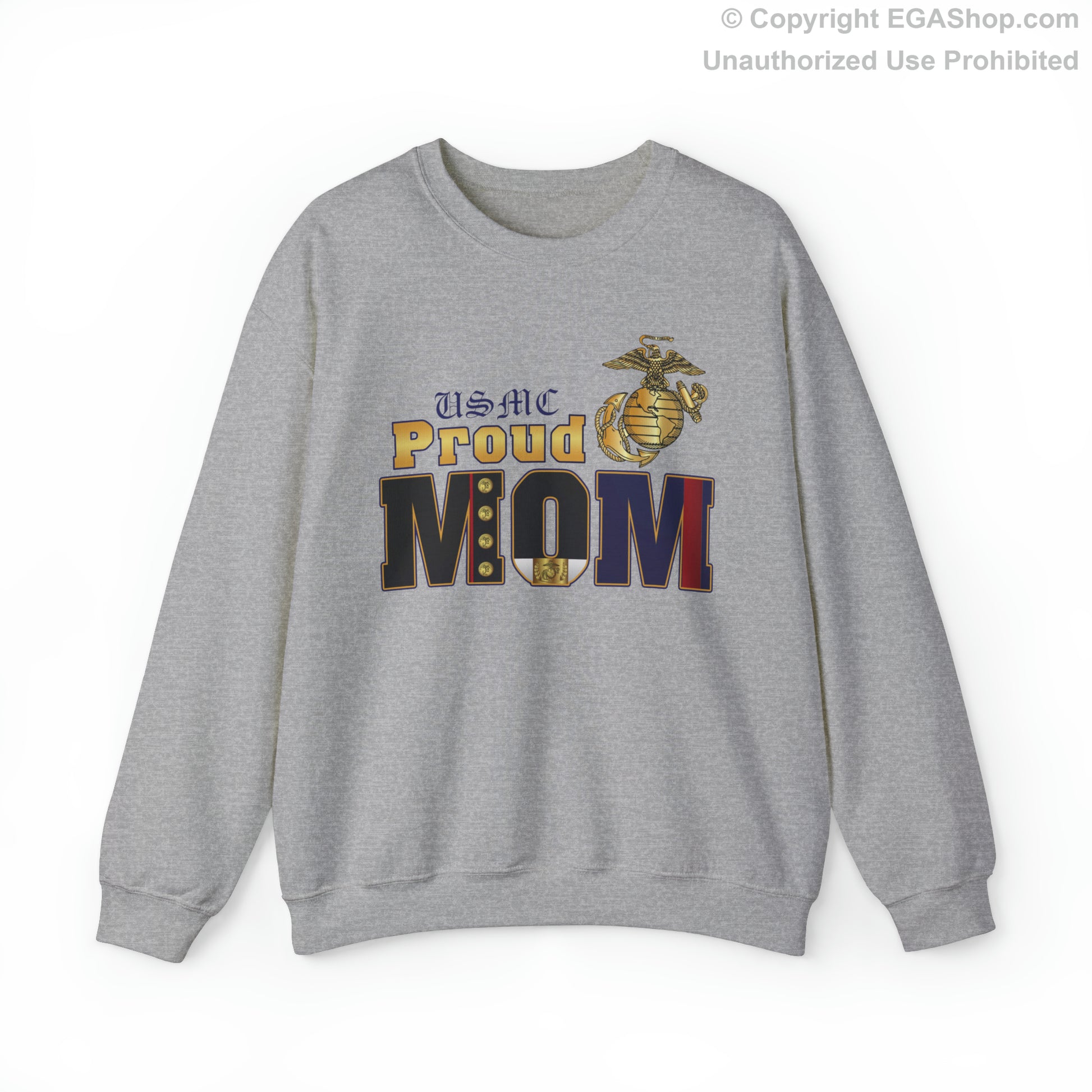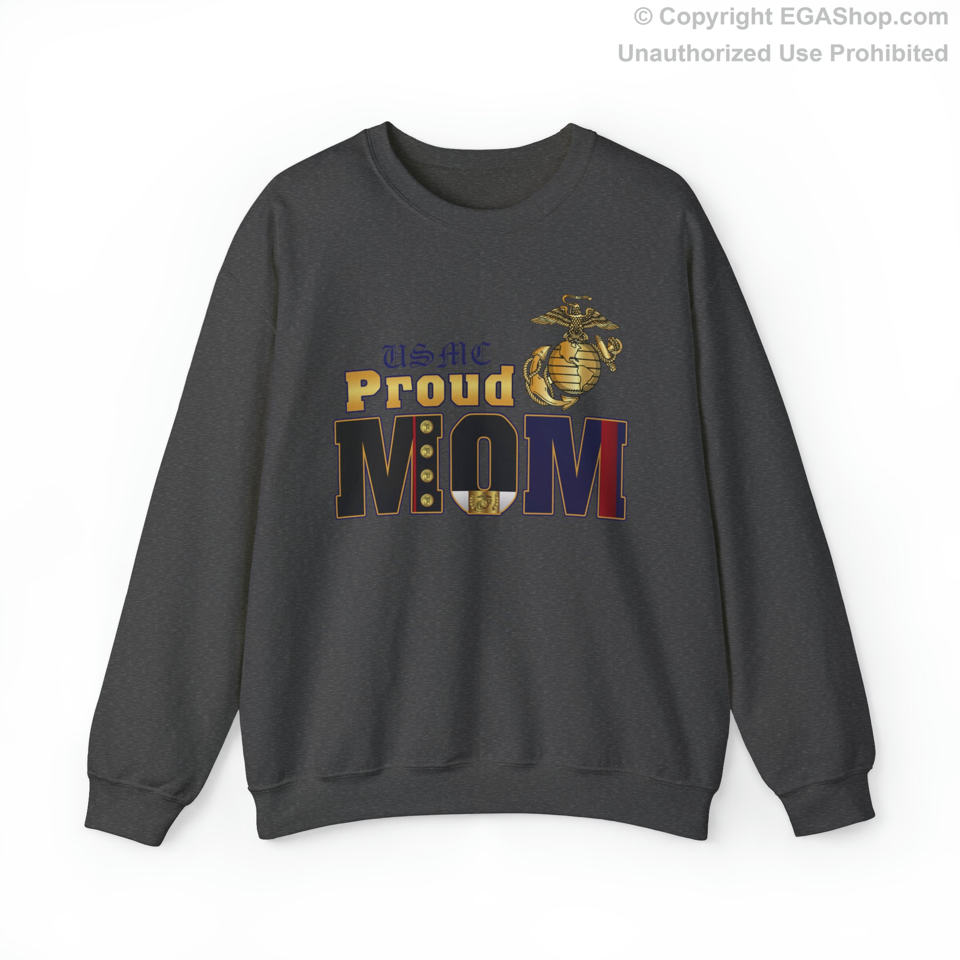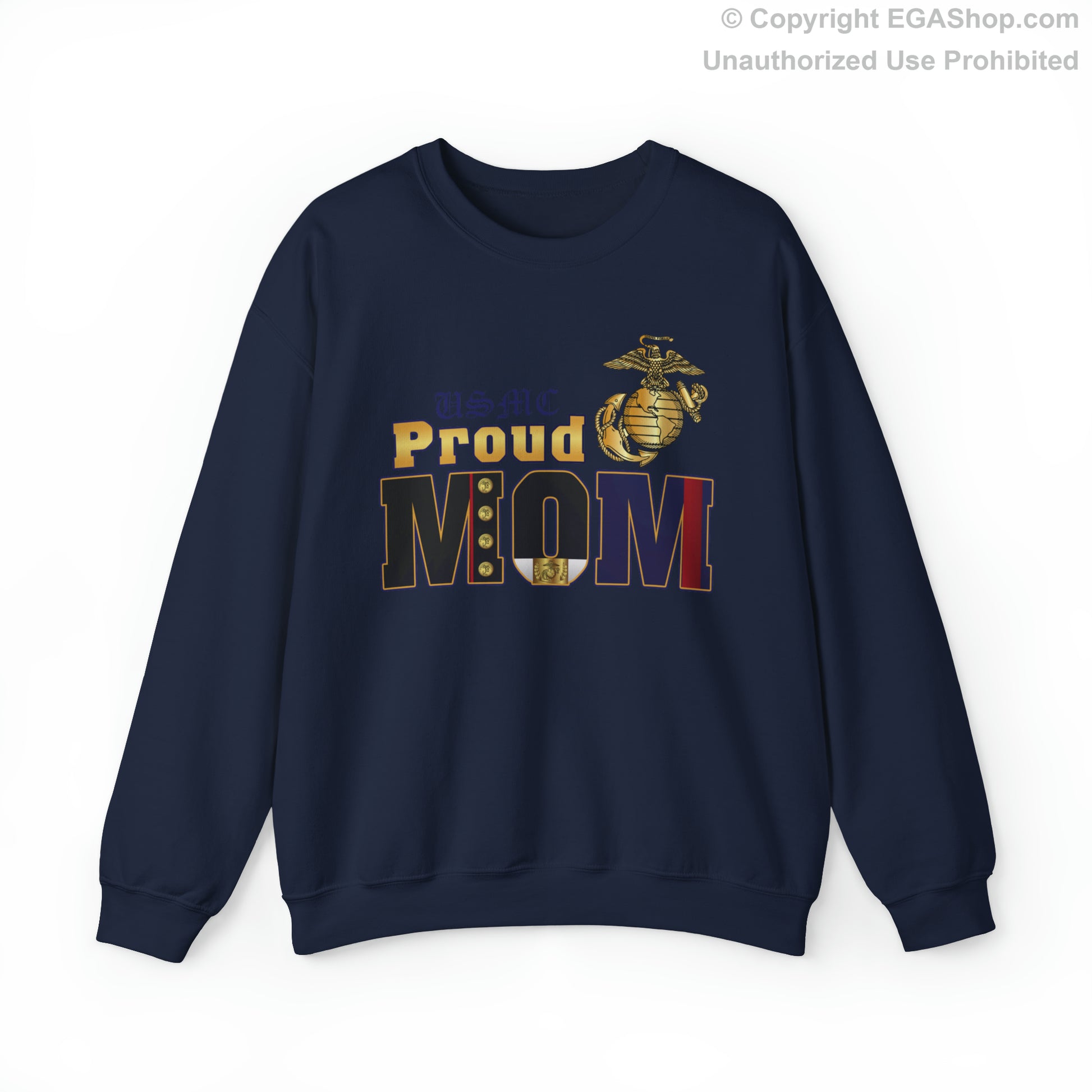 Our sweatshirt has the Marine Corps Dress Blue Proud Mom design on the front with the Eagle, Globe, and Anchor (EGA). The back is blank. In your choice of colors. An EGA Shop exclusive.