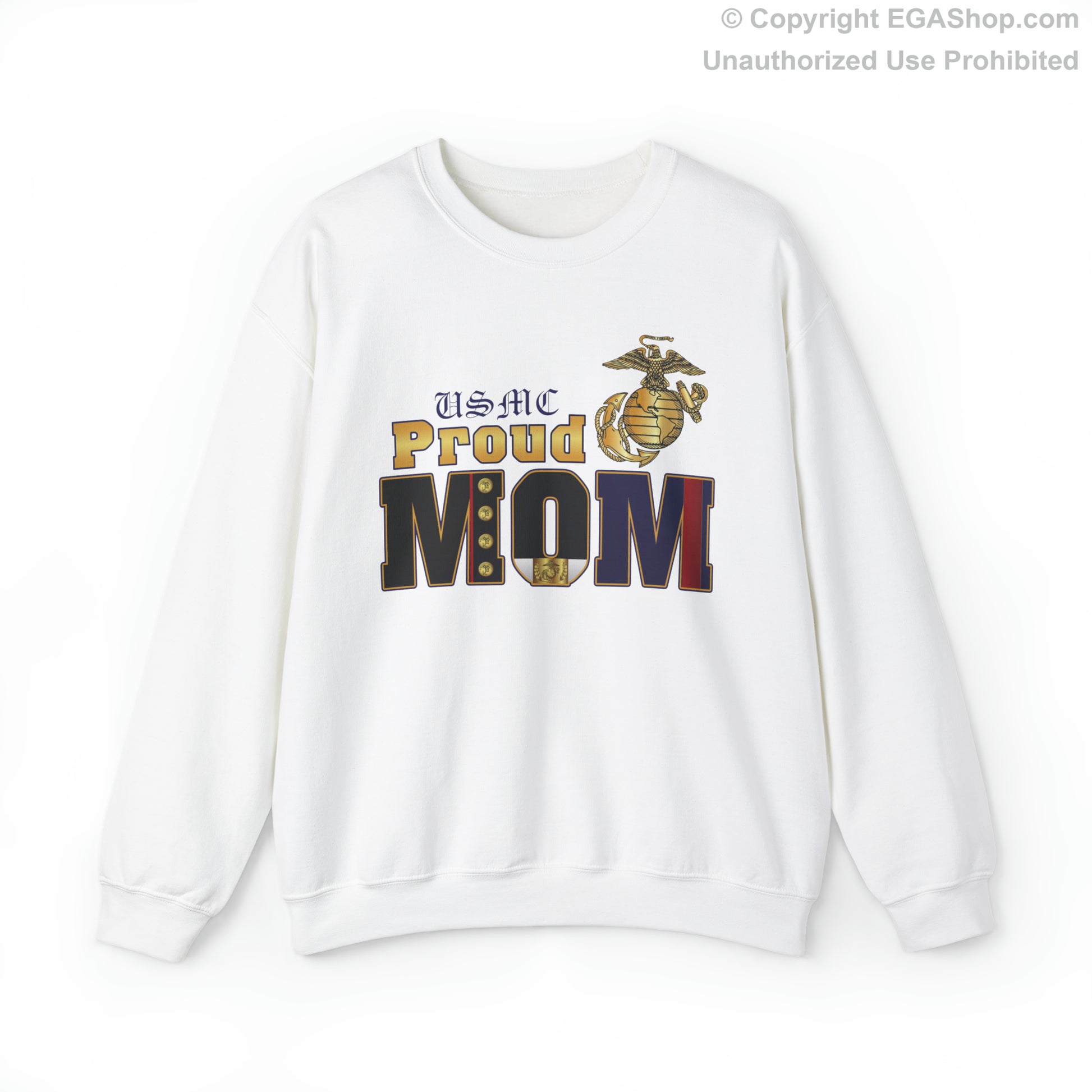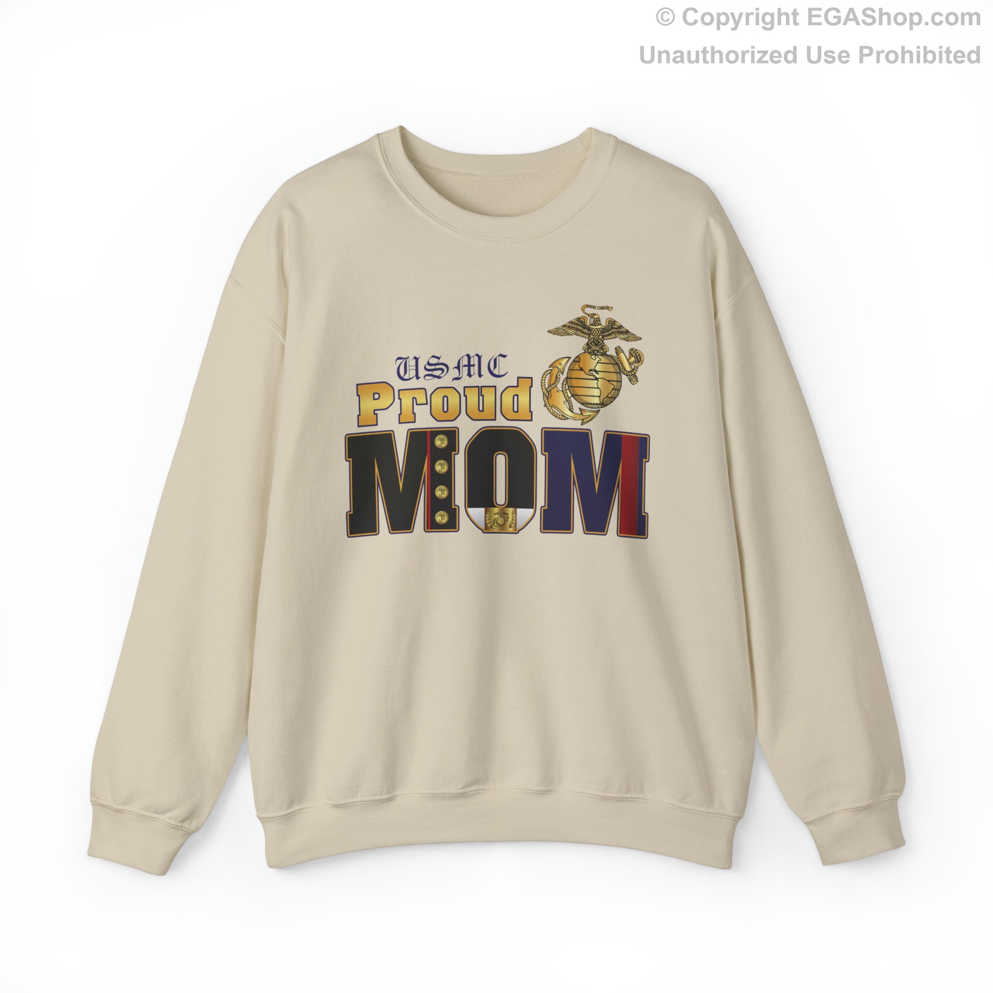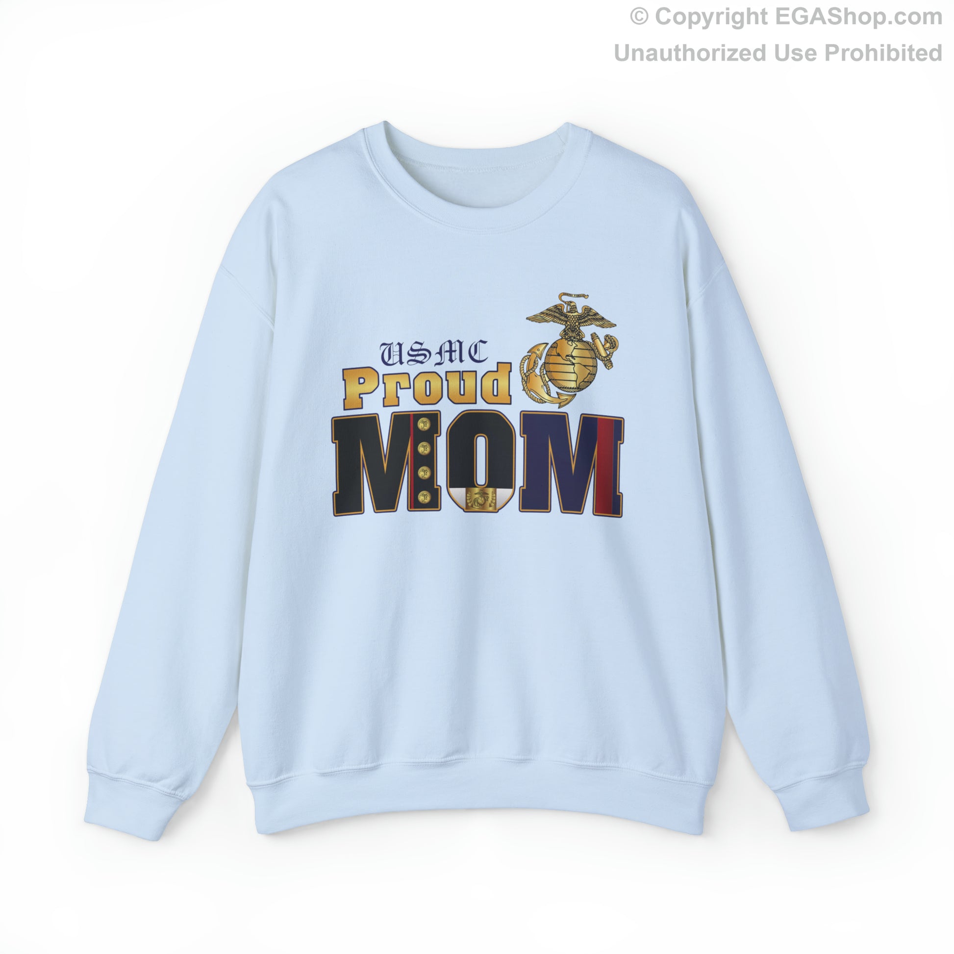 Our sweatshirt has the Marine Corps Dress Blue Proud Mom design on the front with the Eagle, Globe, and Anchor (EGA). The back is blank. In your choice of colors. An EGA Shop exclusive.