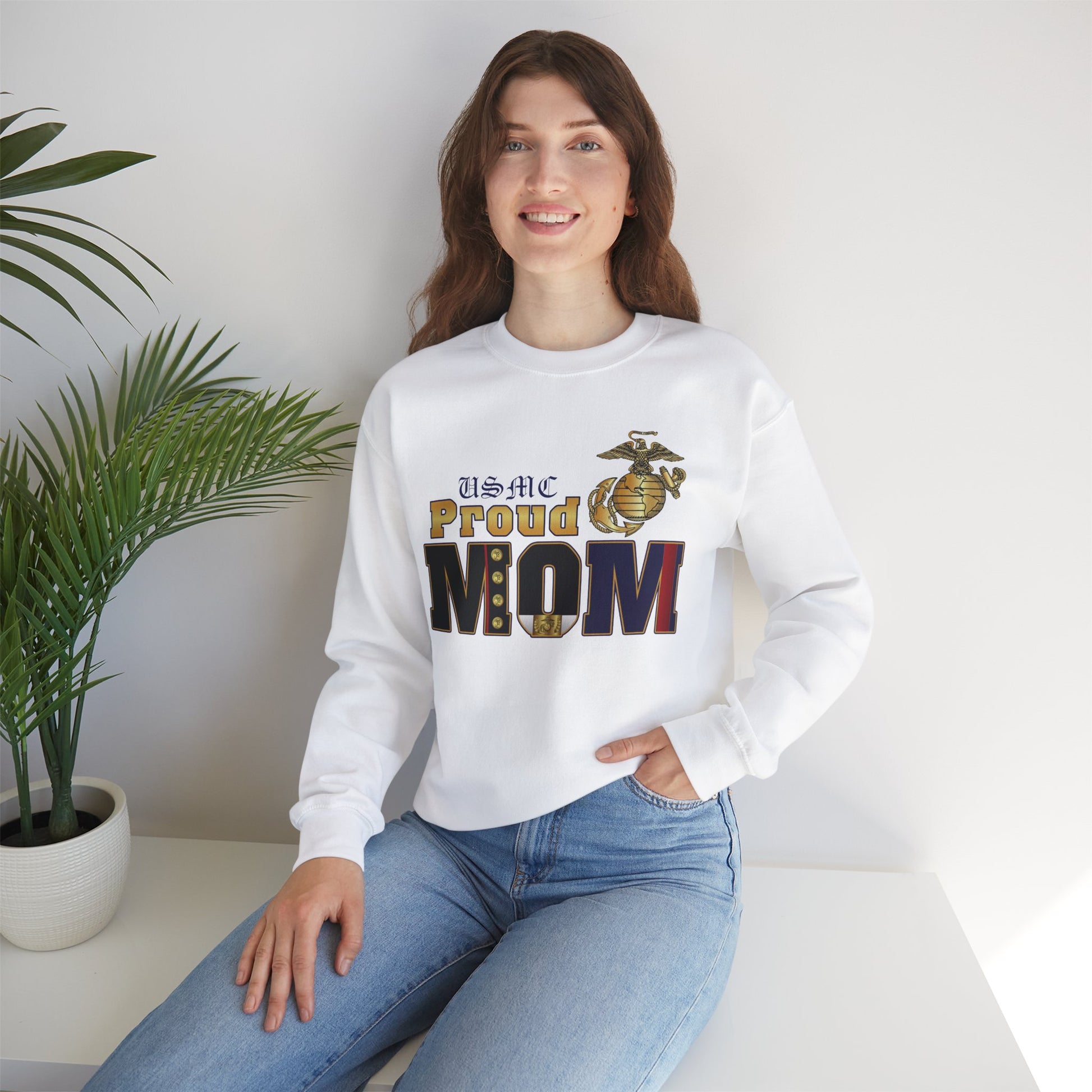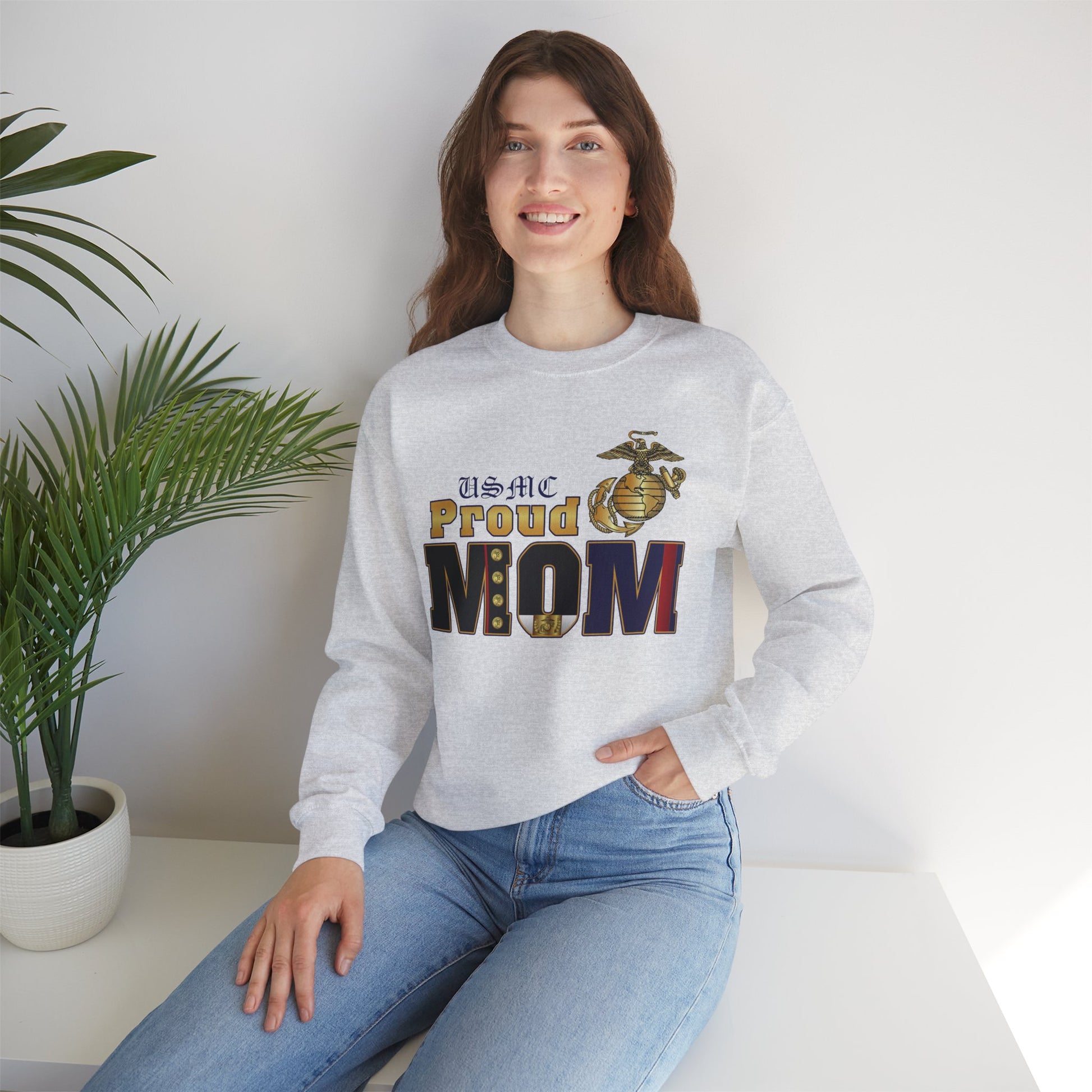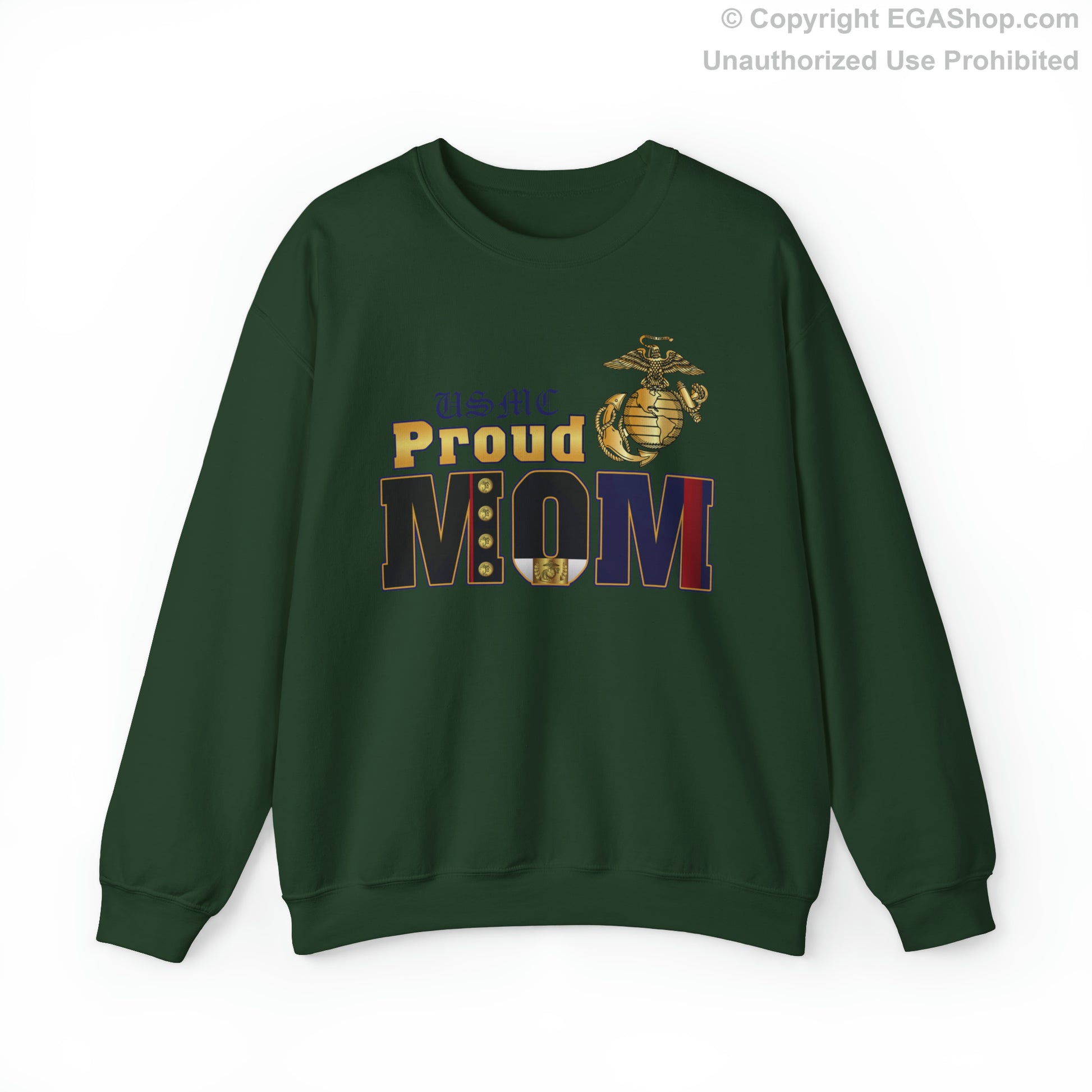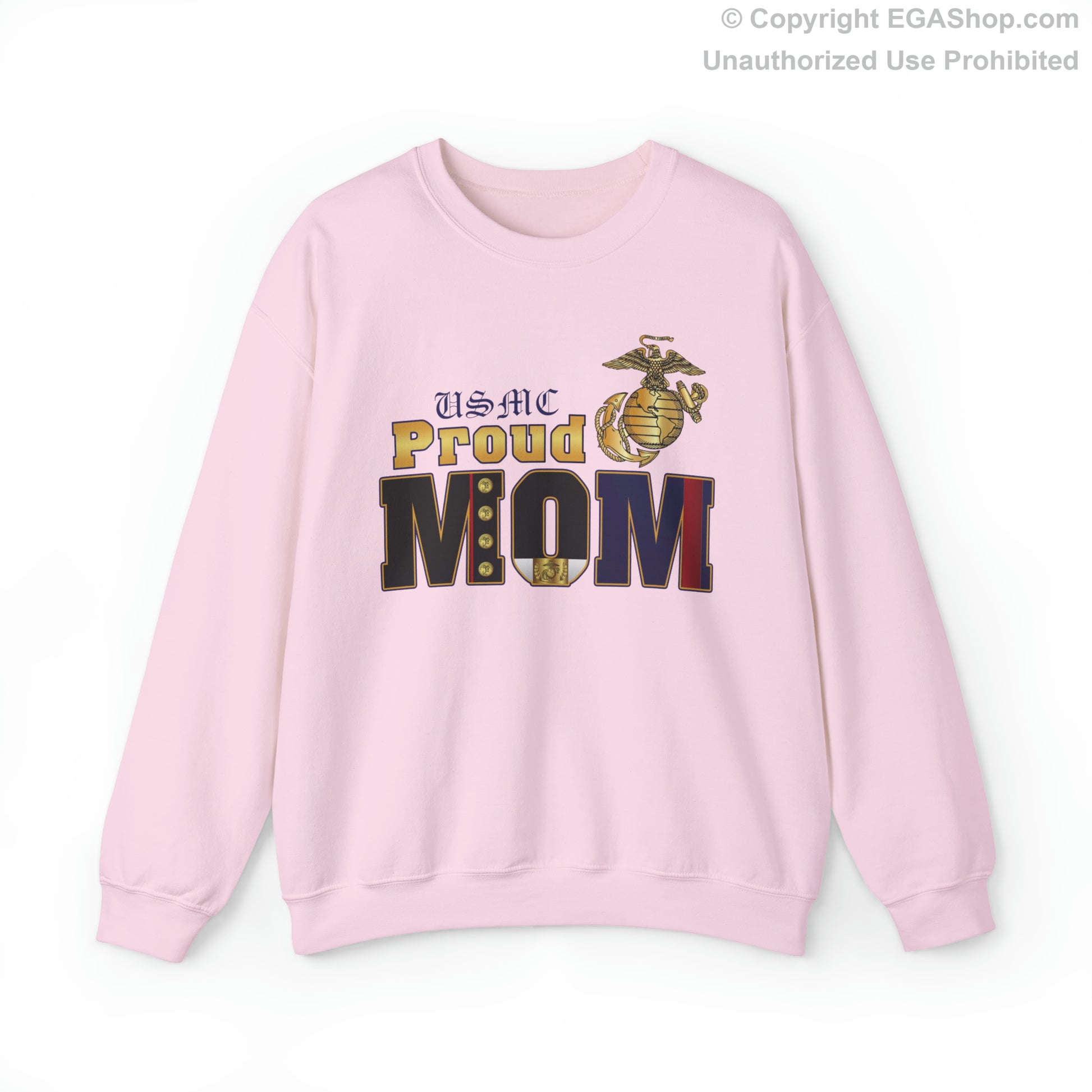 Our sweatshirt has the Marine Corps Dress Blue Proud Mom design on the front with the Eagle, Globe, and Anchor (EGA). The back is blank. In your choice of colors. An EGA Shop exclusive.
