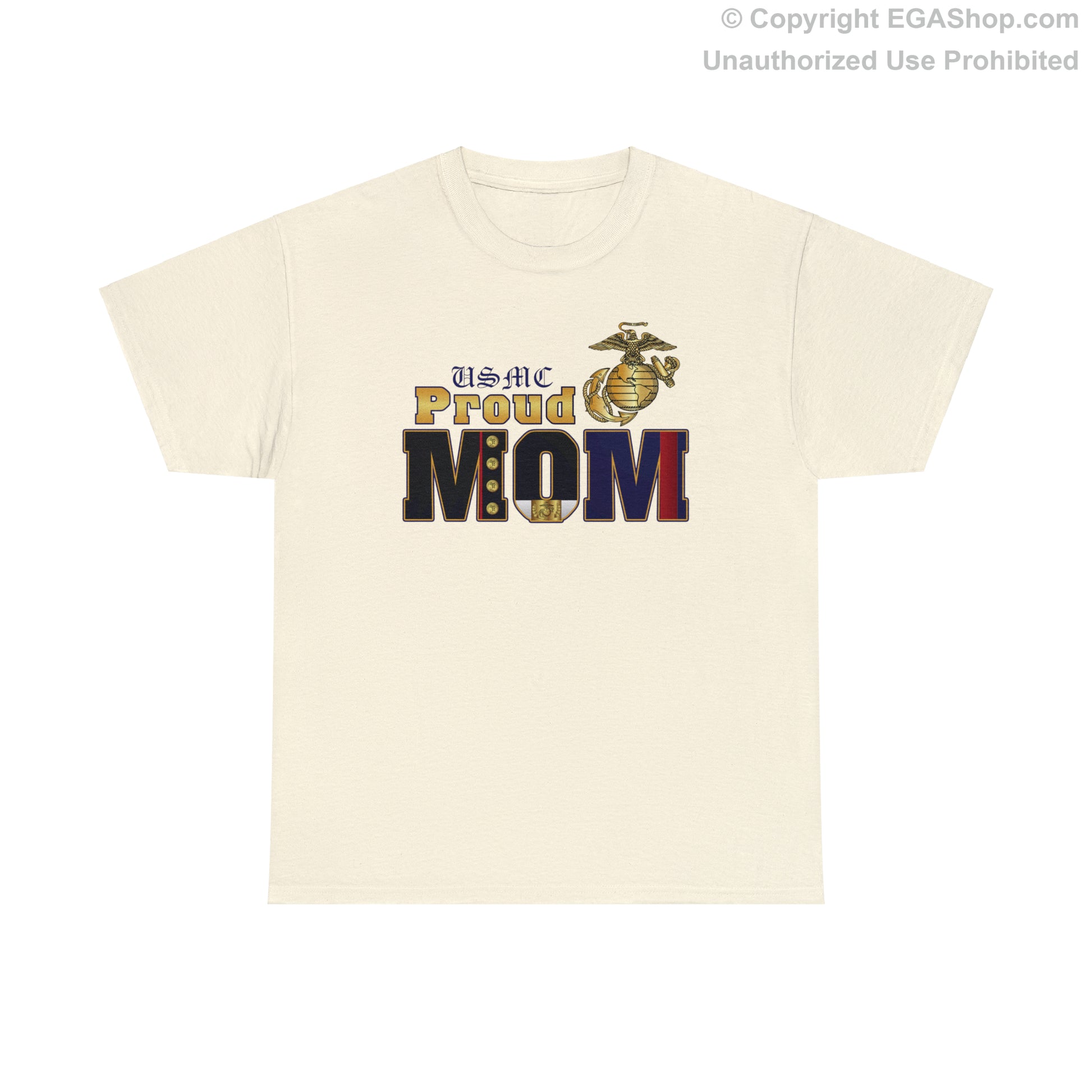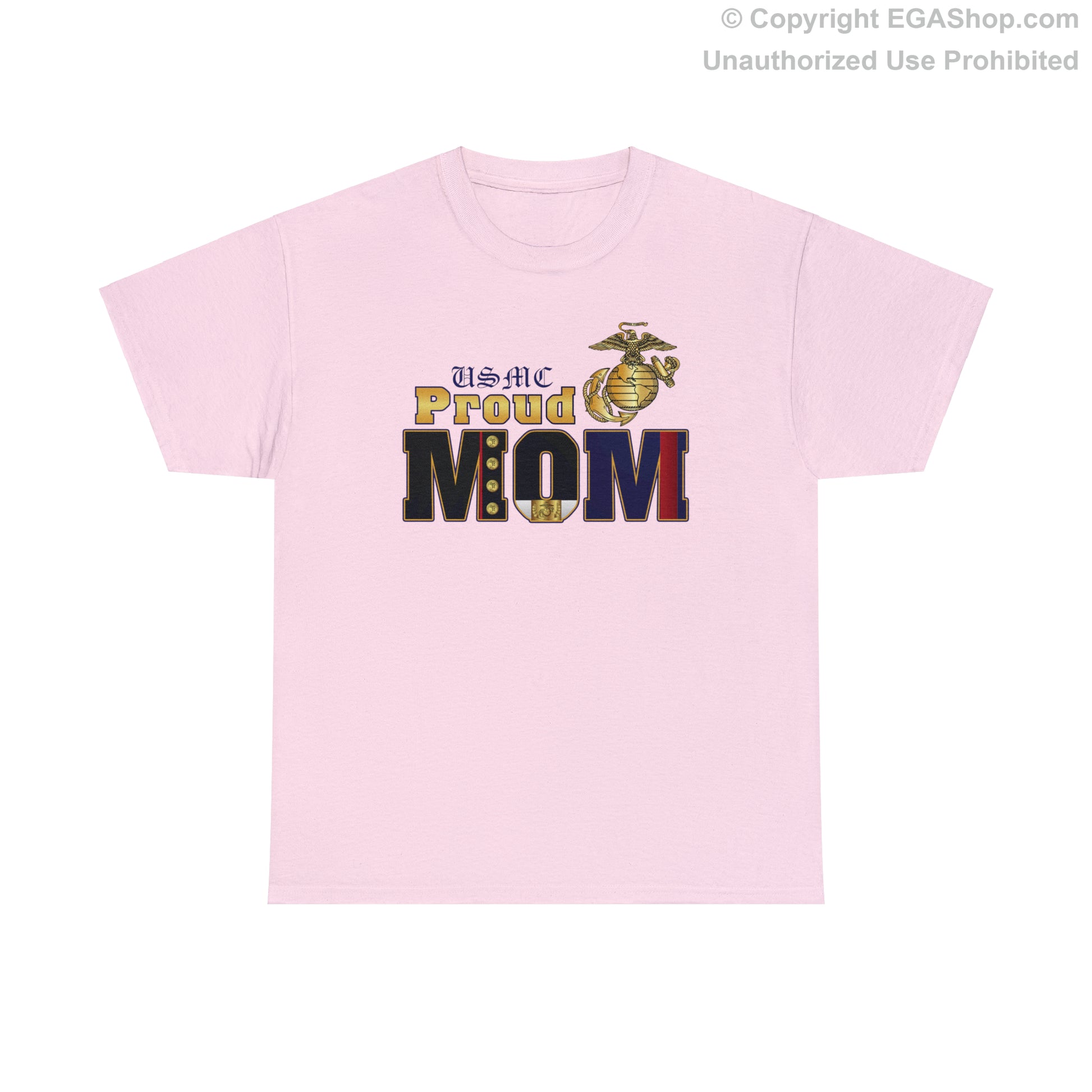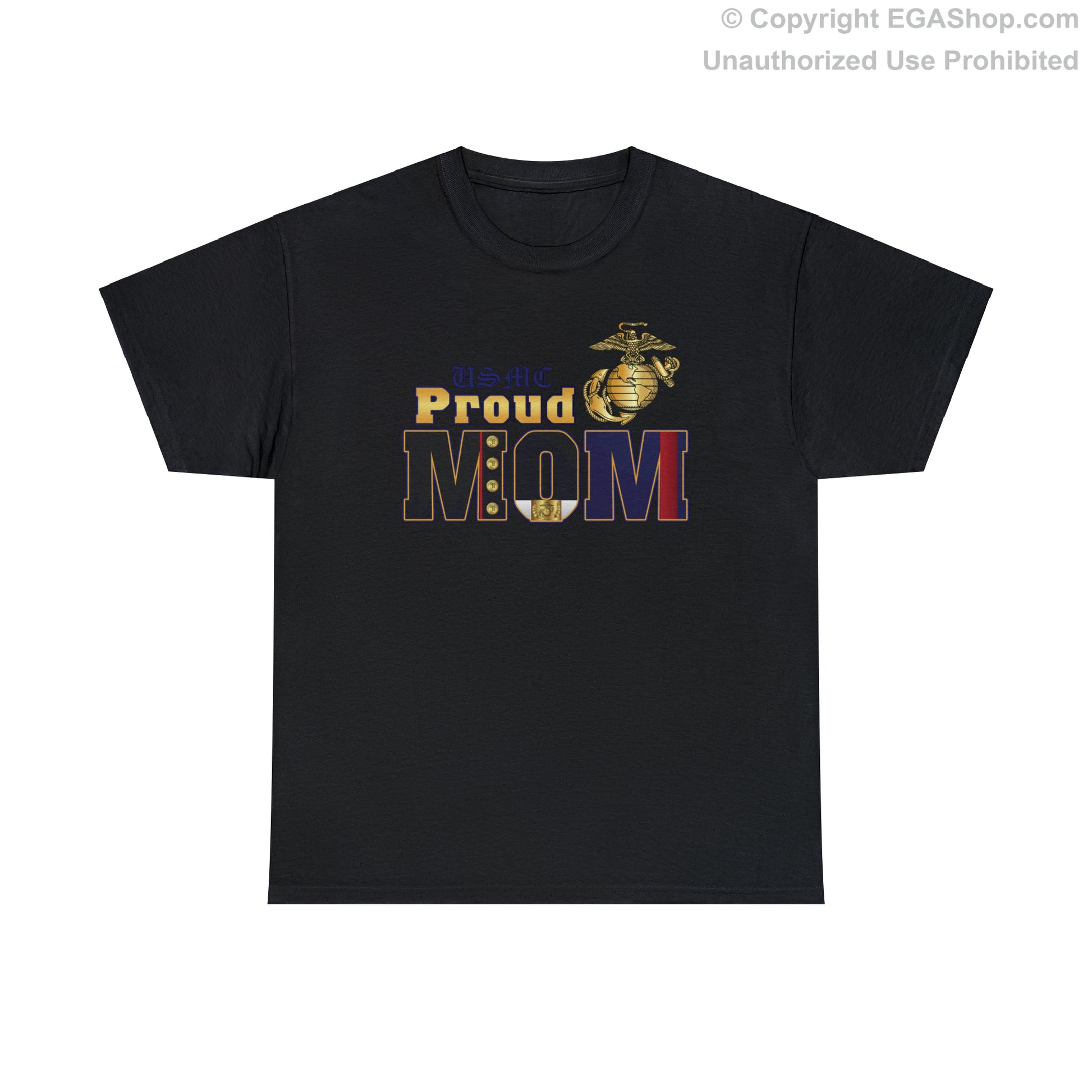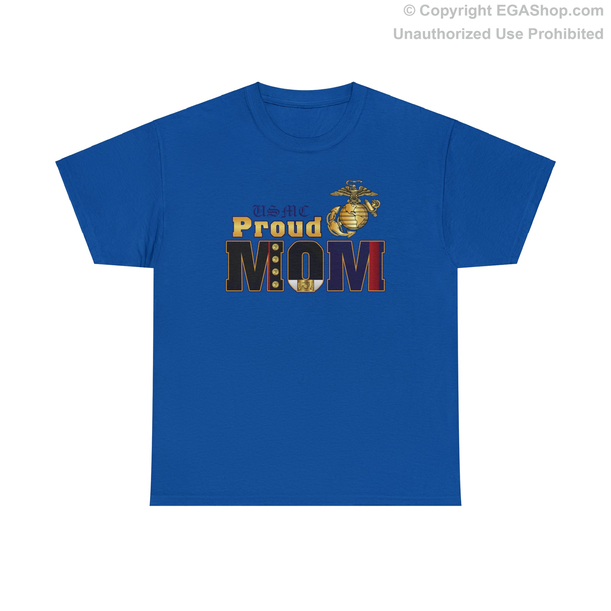 Our T-shirt has the Marine Corps Dress Blue Proud Mom design on the front with the Eagle, Globe, and Anchor (EGA). The back is blank. Short sleeve. In your choice of colors. An EGA Shop exclusive.