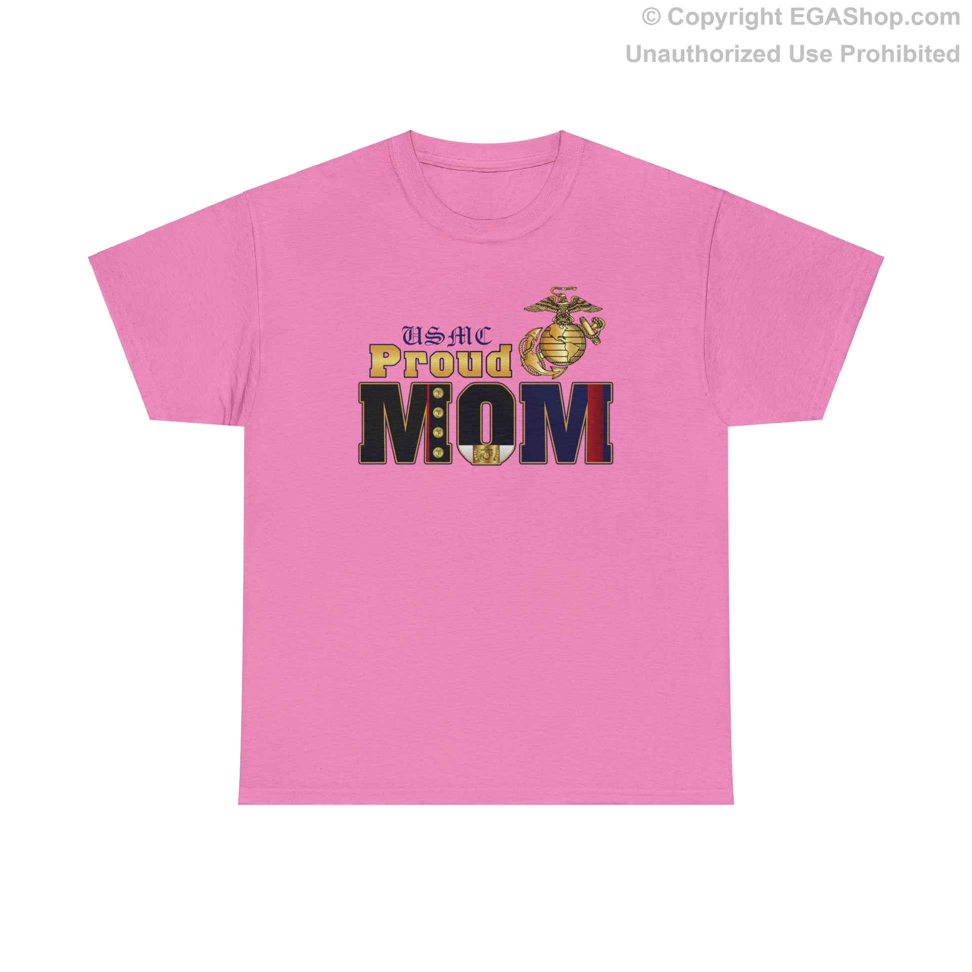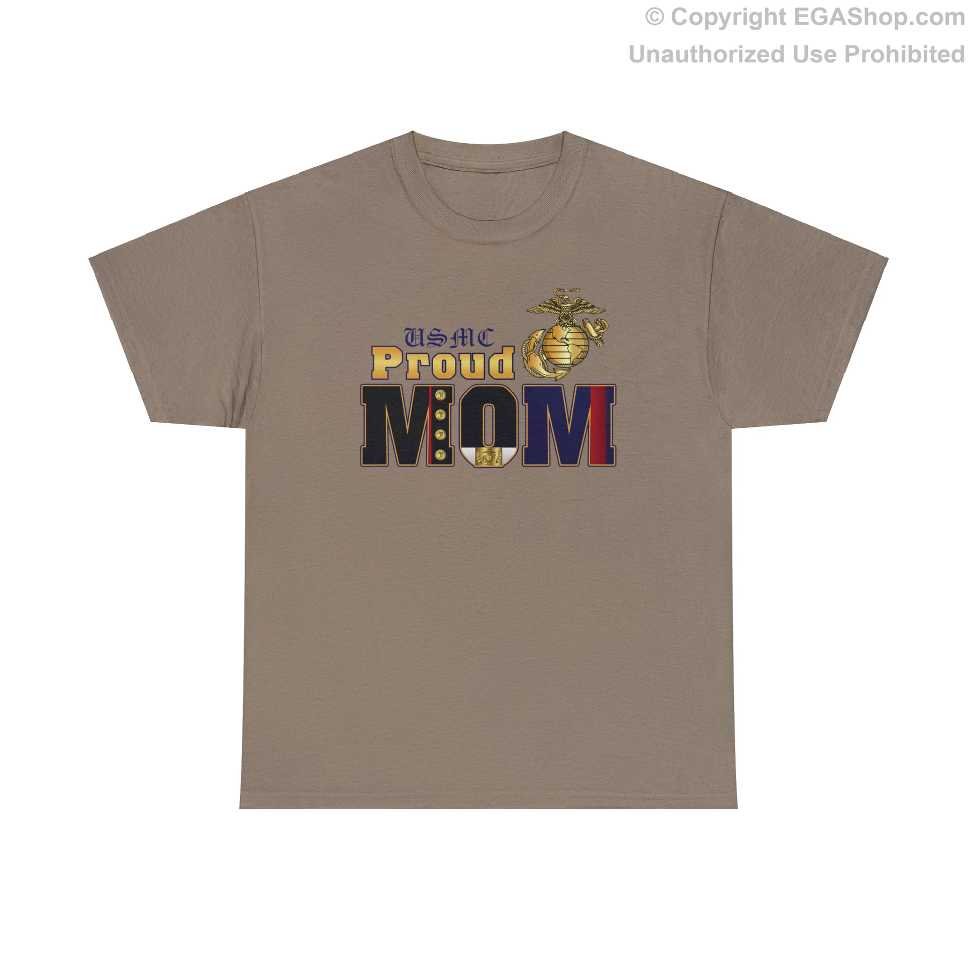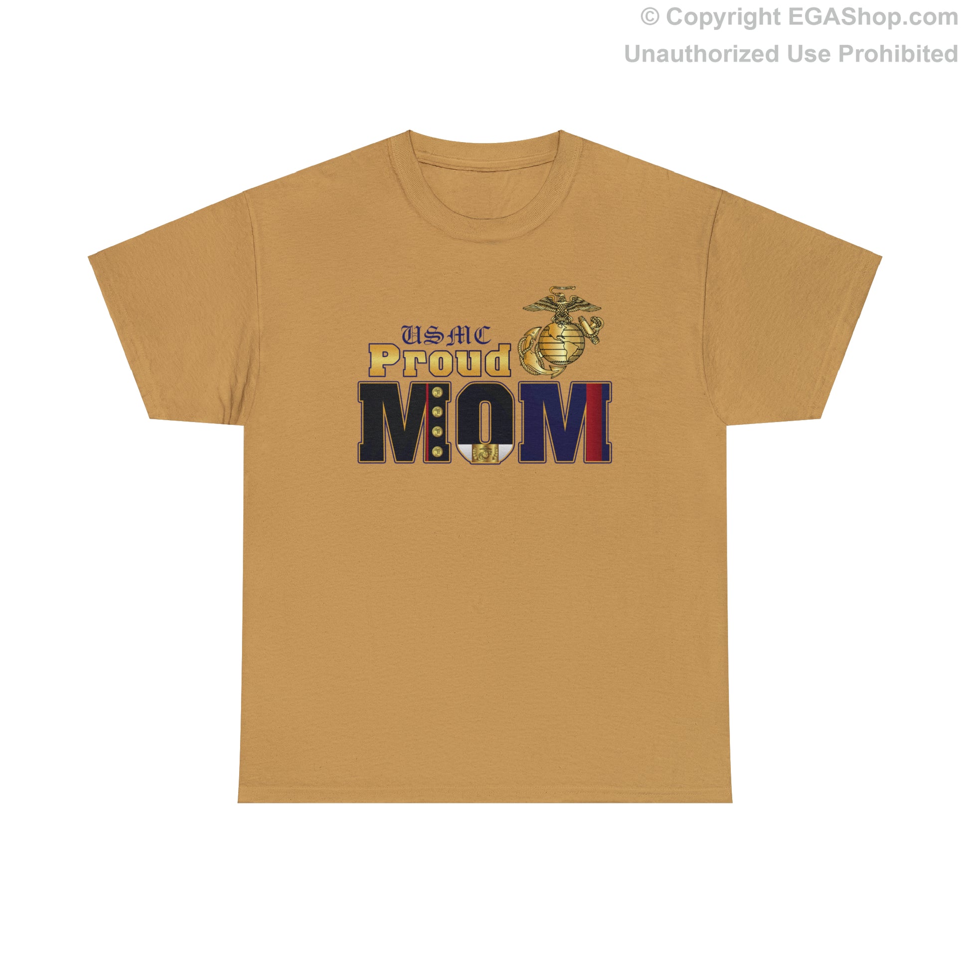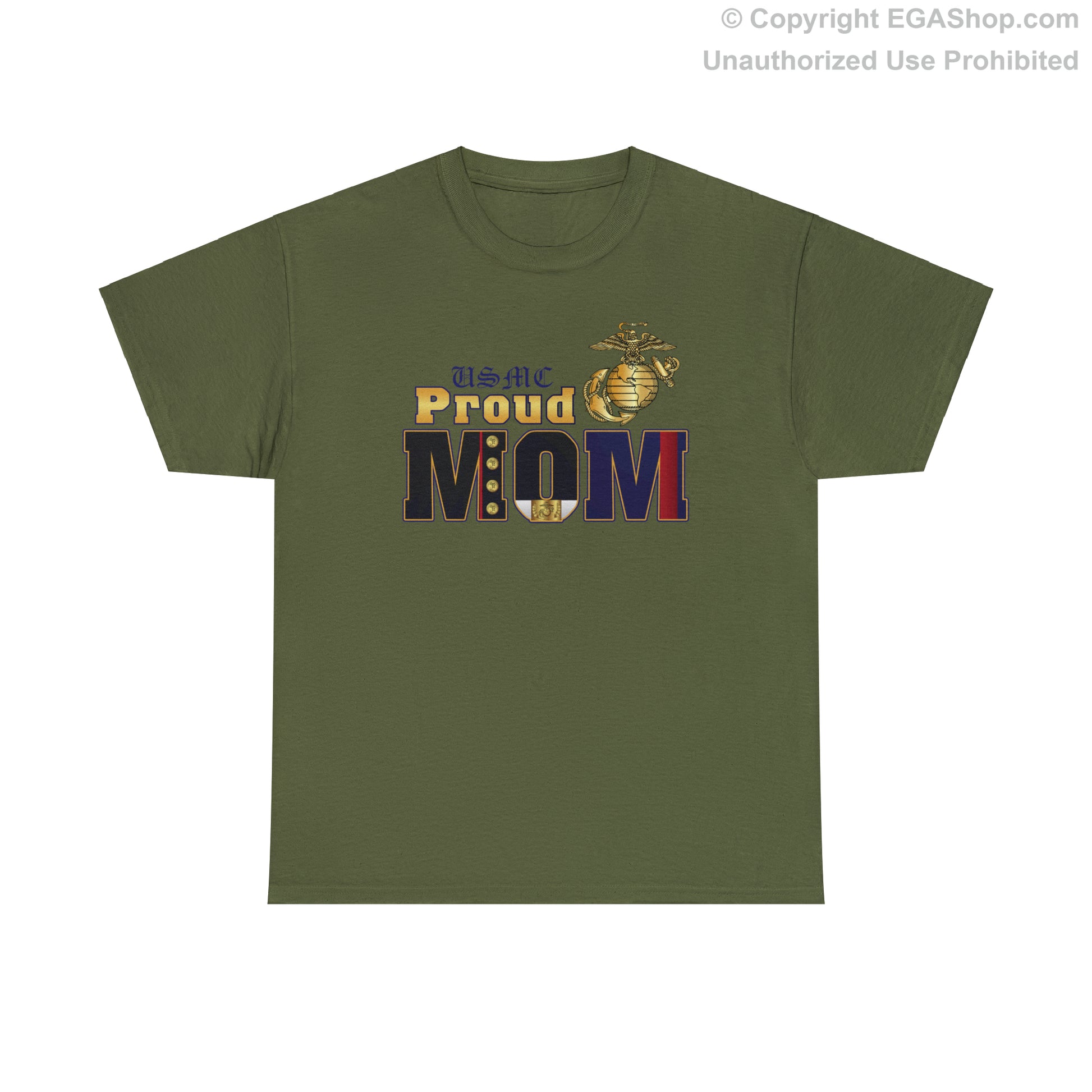 Our T-shirt has the Marine Corps Dress Blue Proud Mom design on the front with the Eagle, Globe, and Anchor (EGA). The back is blank. Short sleeve. In your choice of colors. An EGA Shop exclusive.