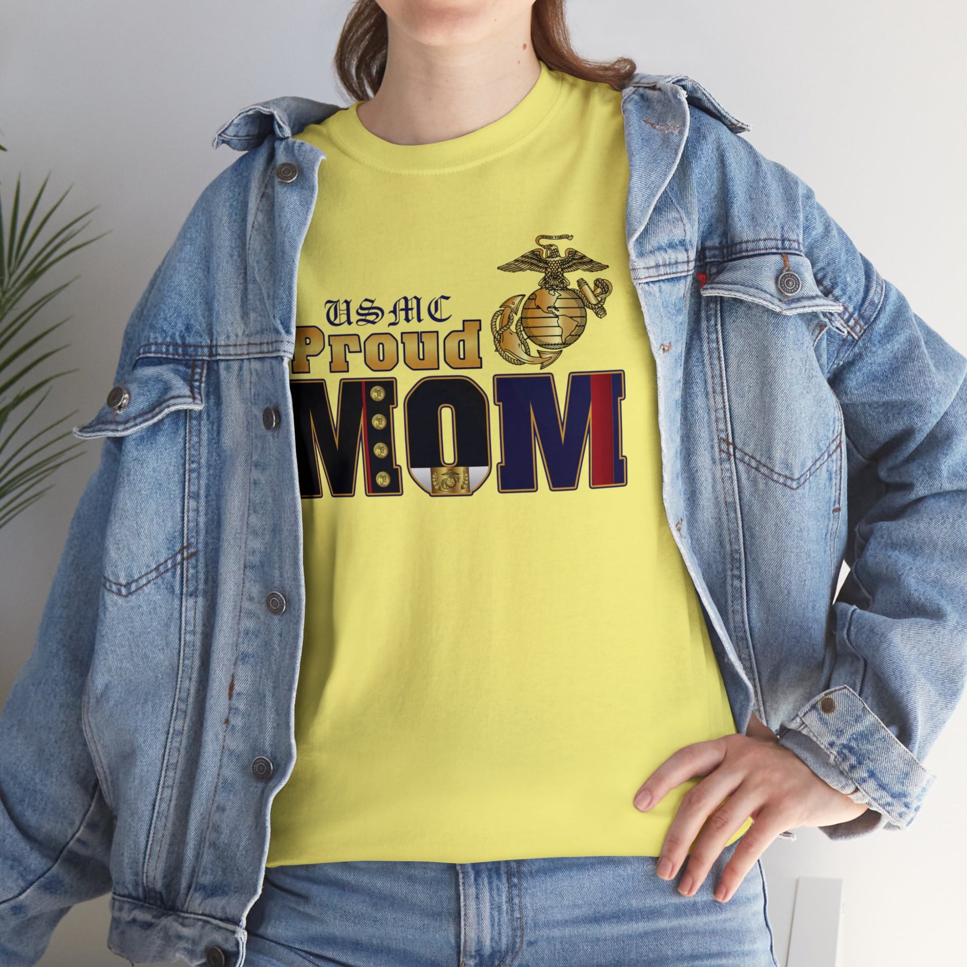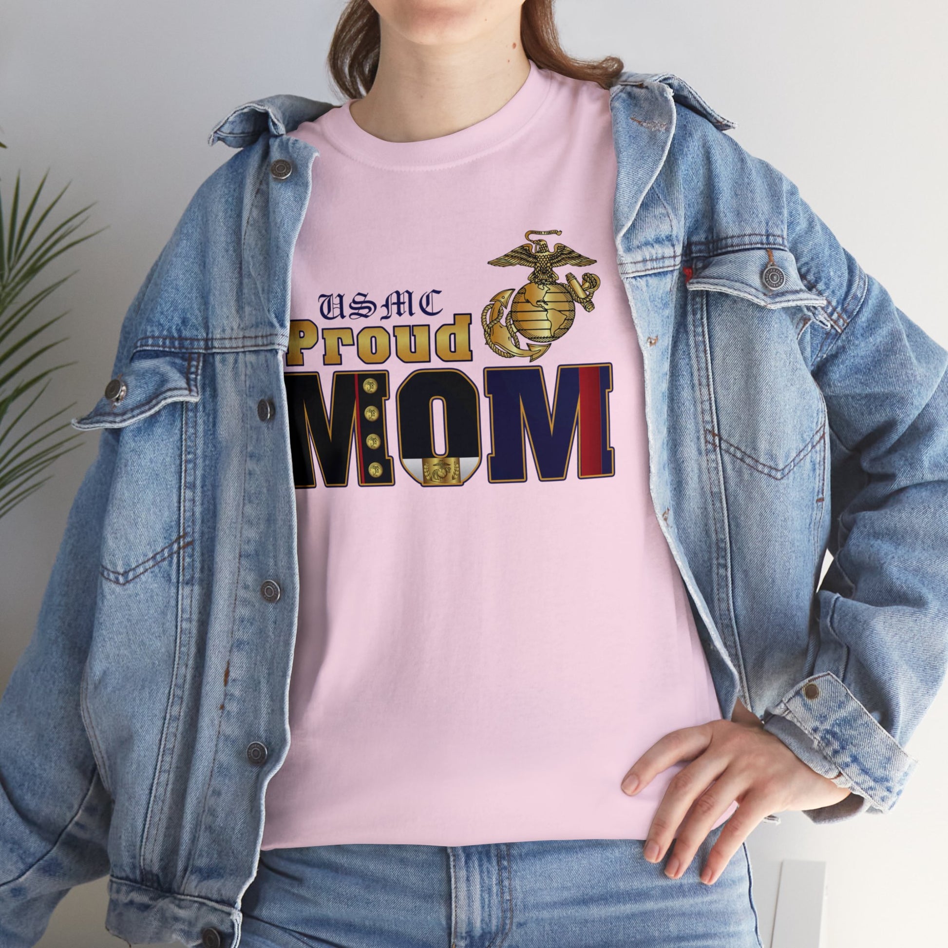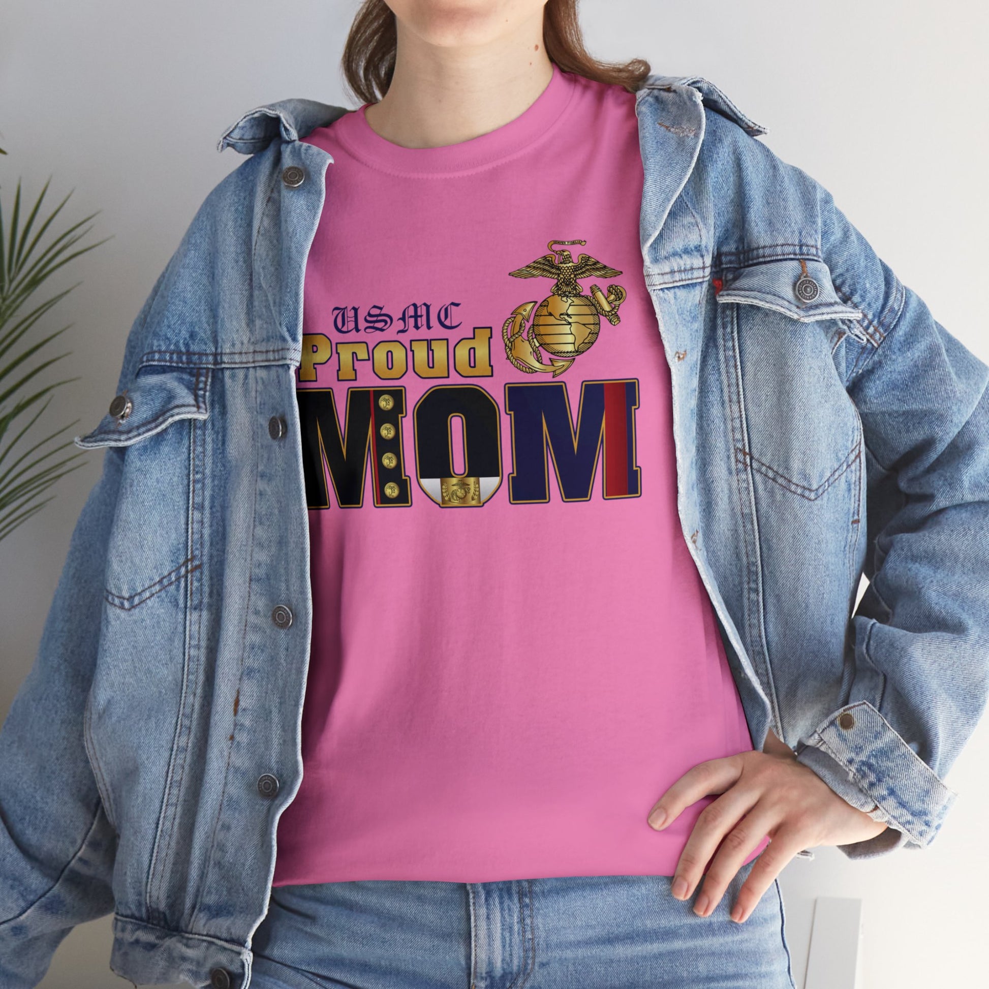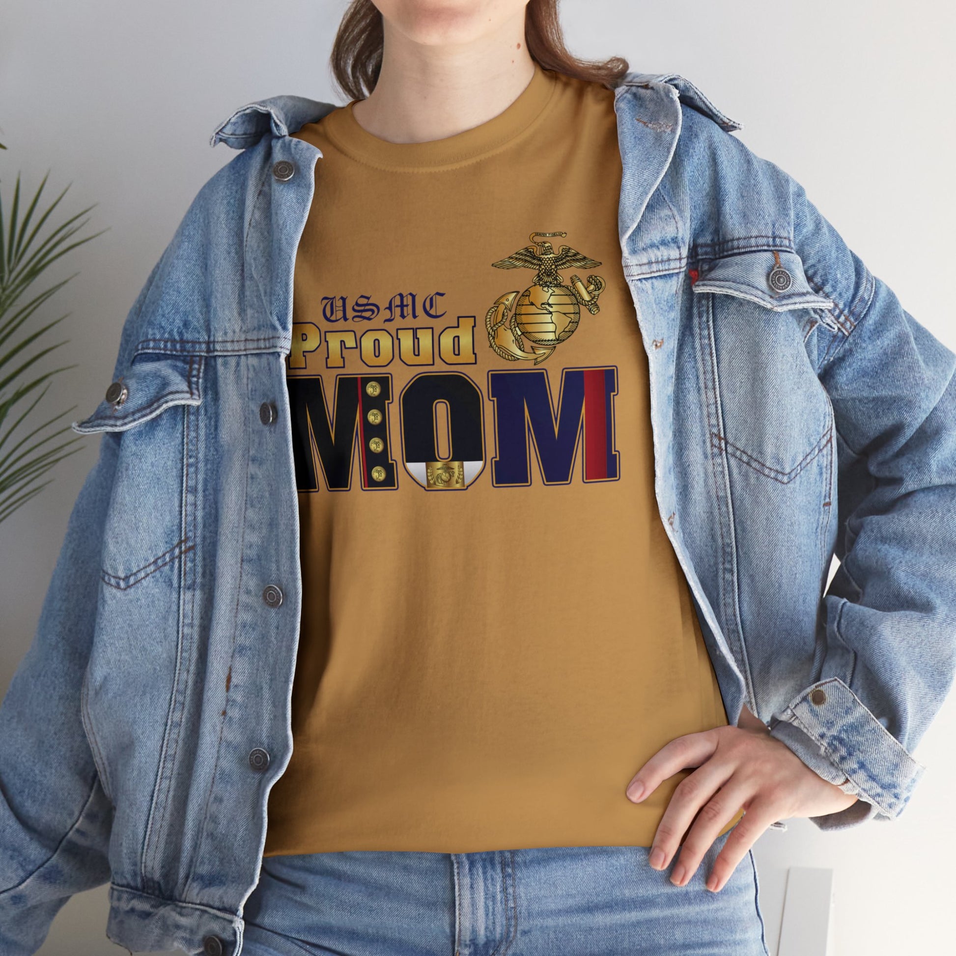 Our T-shirt has the Marine Corps Dress Blue Proud Mom design on the front with the Eagle, Globe, and Anchor (EGA). The back is blank. Short sleeve. In your choice of colors. An EGA Shop exclusive.