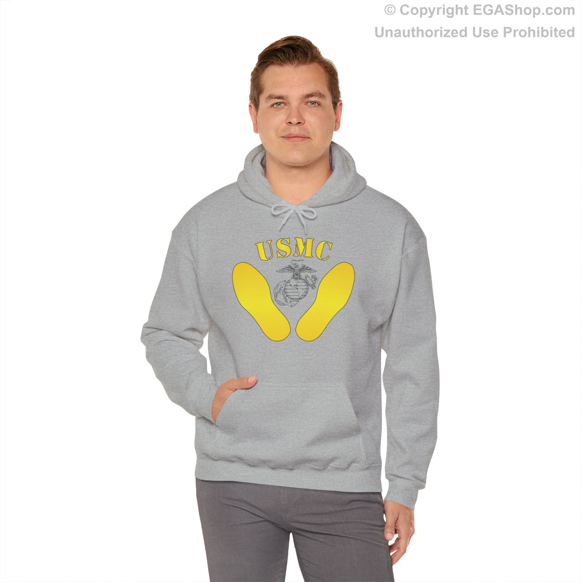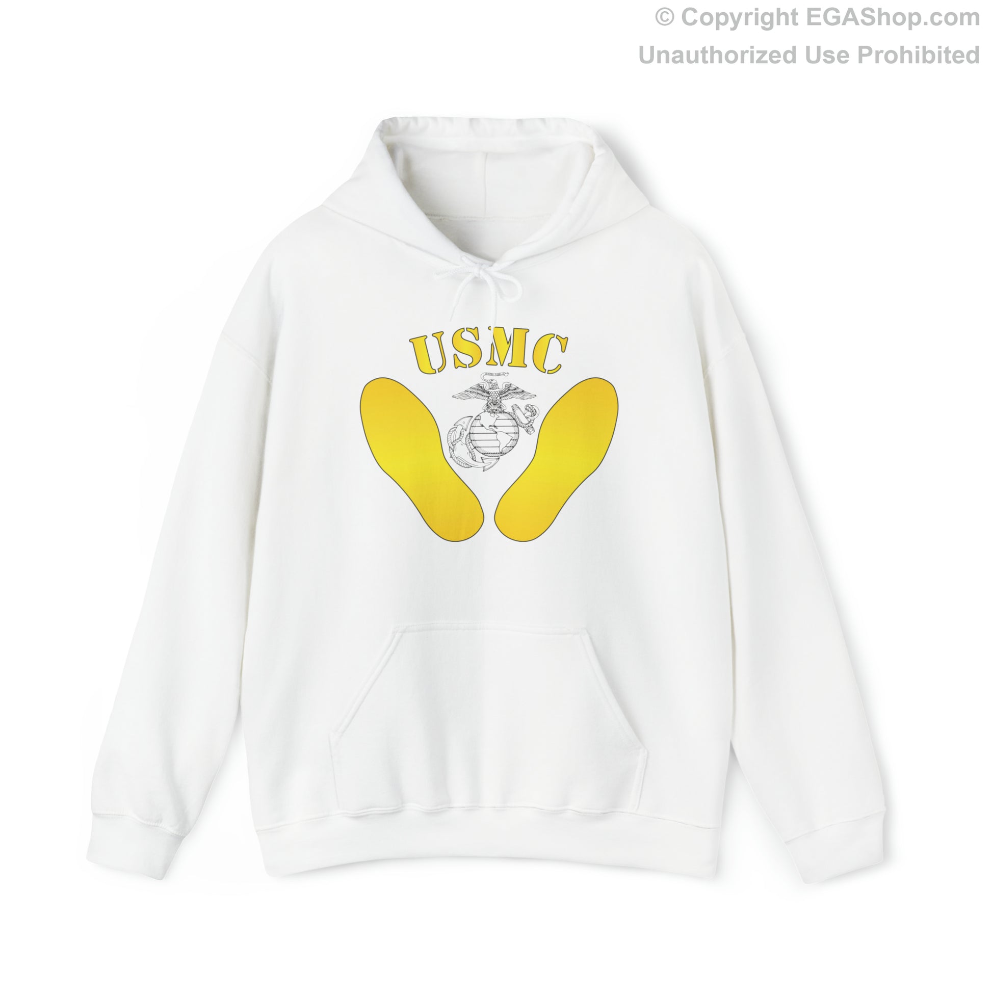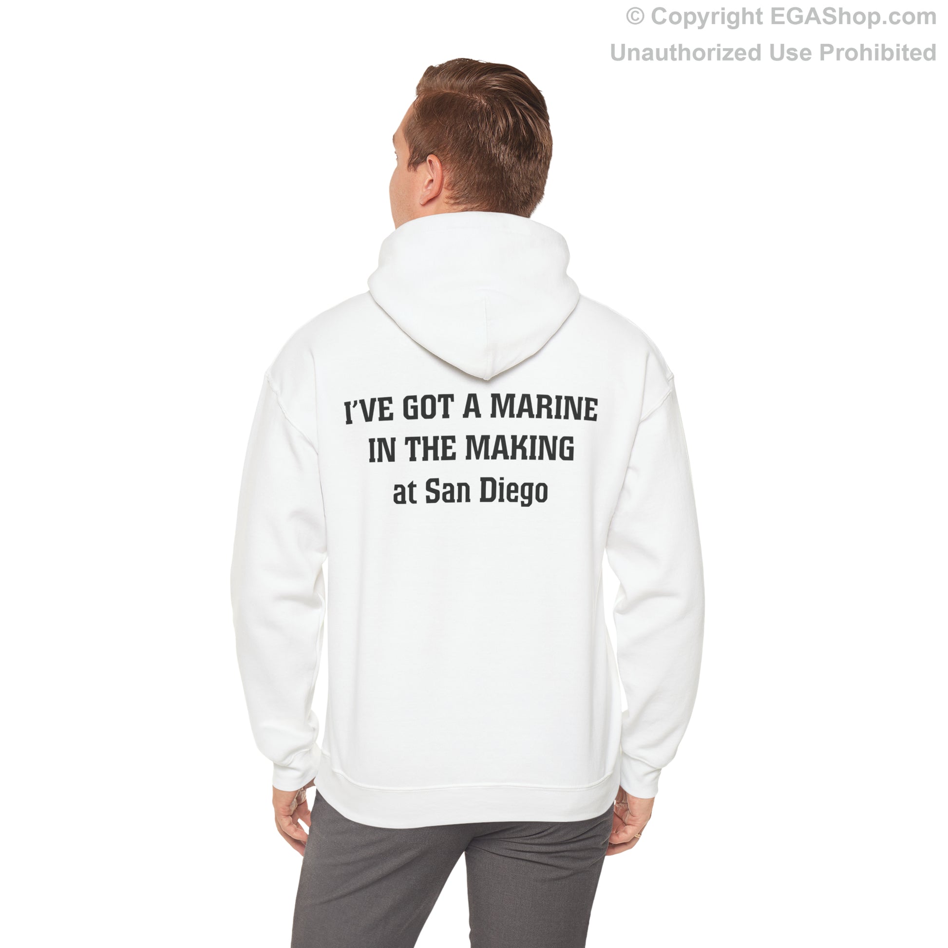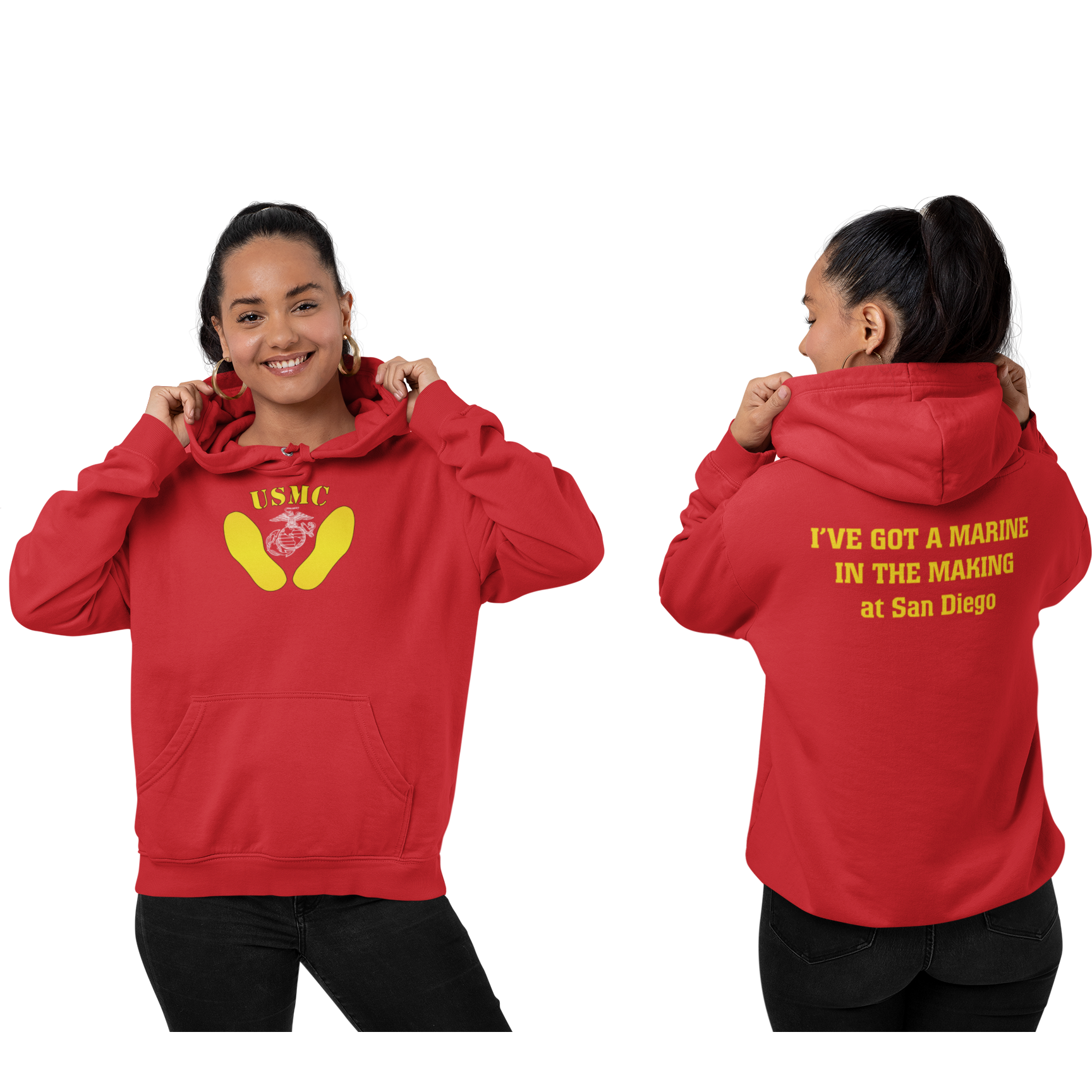 The front of this hoodie includes the iconic Yellow Footprints with the Eagle, Globe, and Anchor (EGA) in the middle. The text on the back reads I'VE GOT A MARINE IN THE MAKING at San Diego. You can wear any color you want, but if you want to choose battalion colors: 1st is Red, 2nd is Yellow or Gold, and 3rd is Blue. Click here for the Parris Island version.