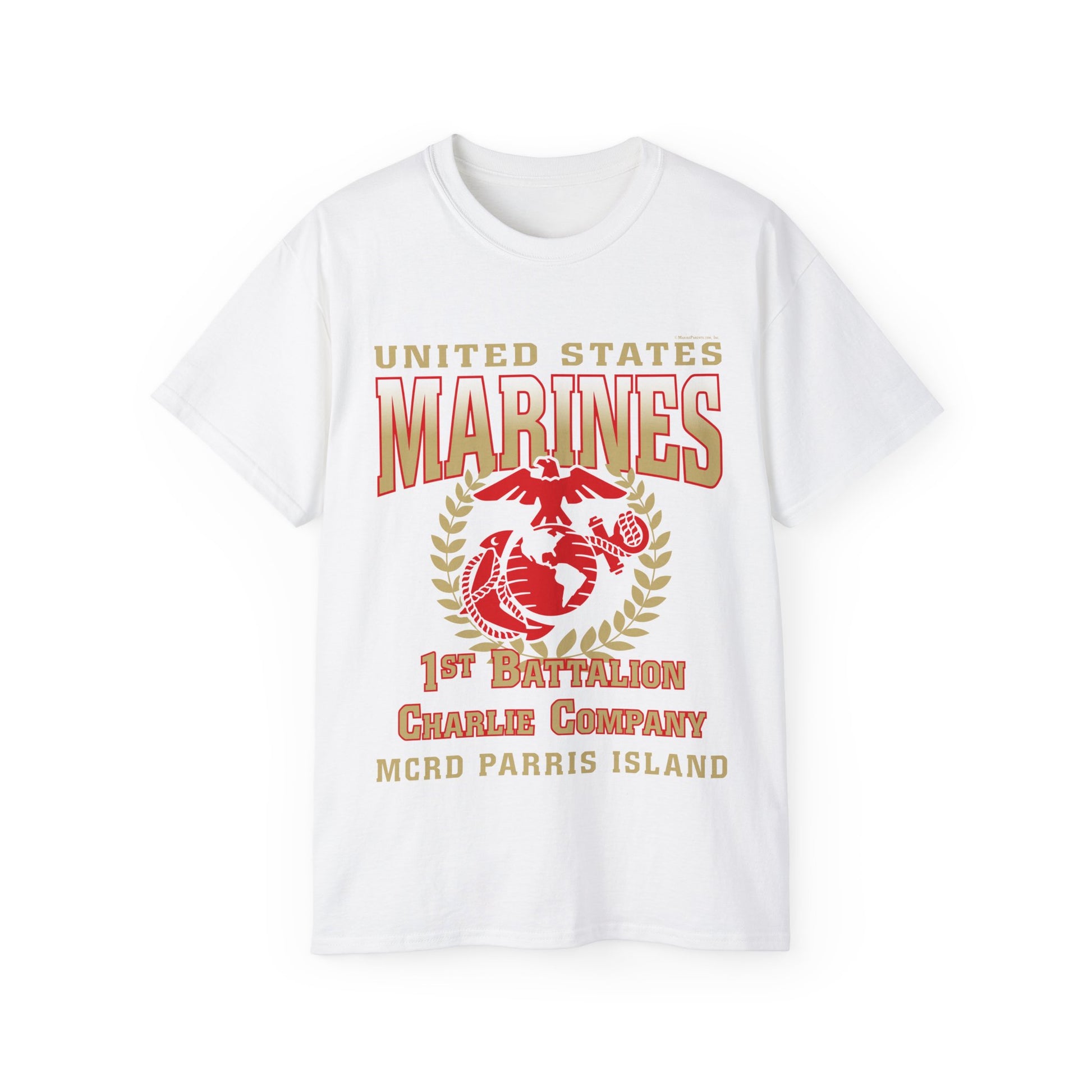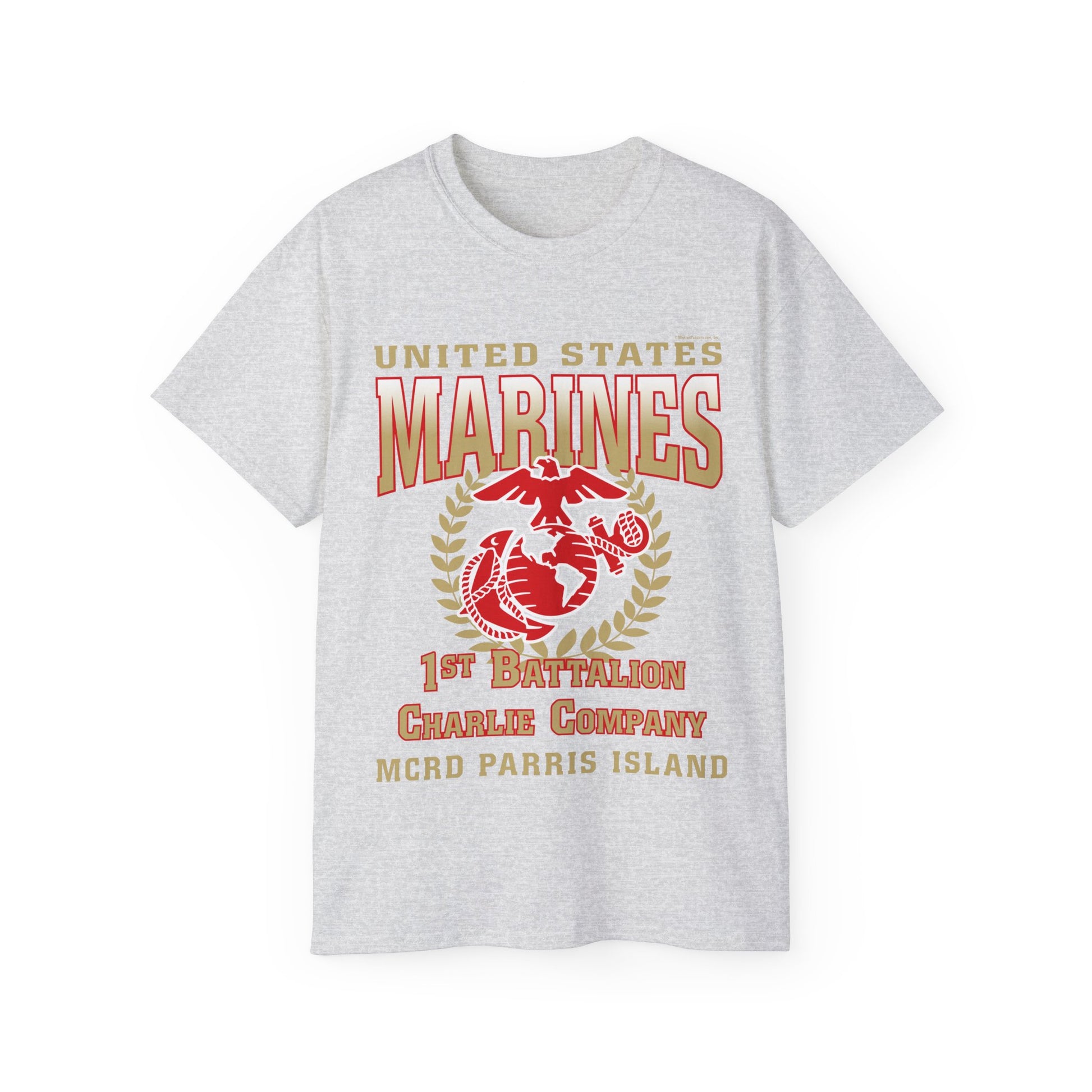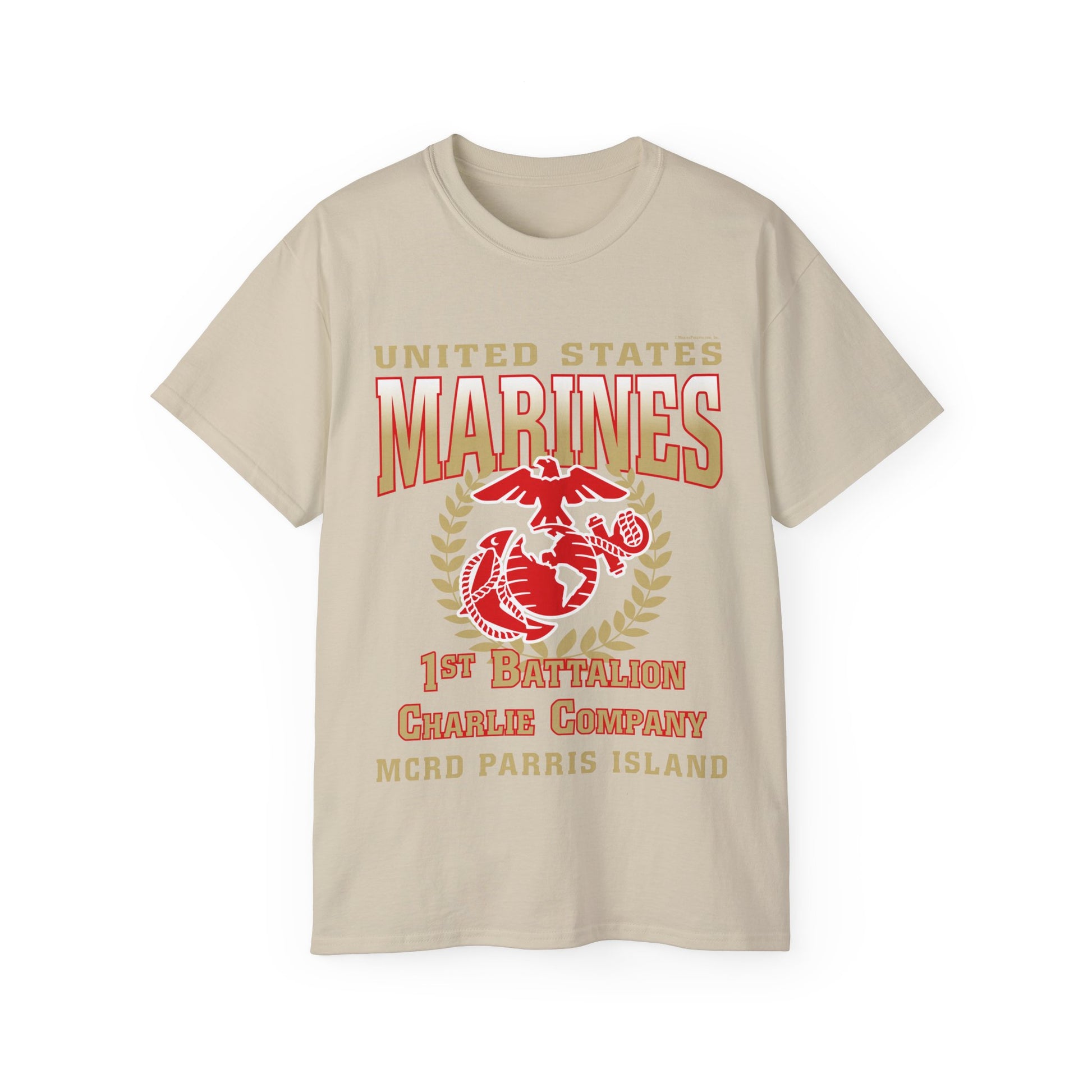 This unisex cotton tee is a classic for Marine Corps Graduations. The front features 1st Battalion Charlie Company Parris Island. The back is blank.