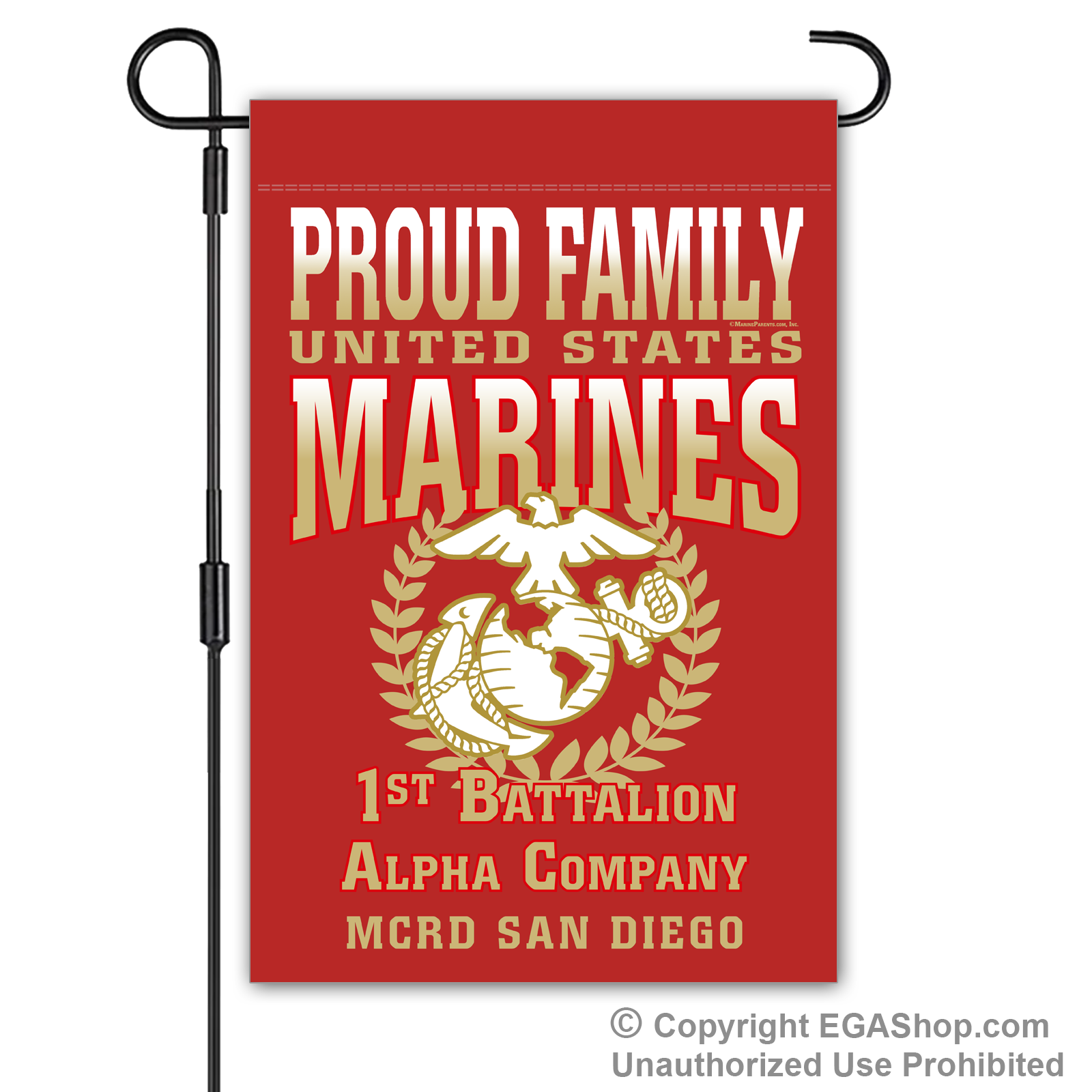 This garden flag represents 1st Battalion SAN DIEGO ALPHA COMPANY and includes the Eagle, Globe, and Anchor (EGA). The garden flag is available in your choice of red or black with Proud Family at the top. Also available in red with Proud Mom or Proud Dad at the top.