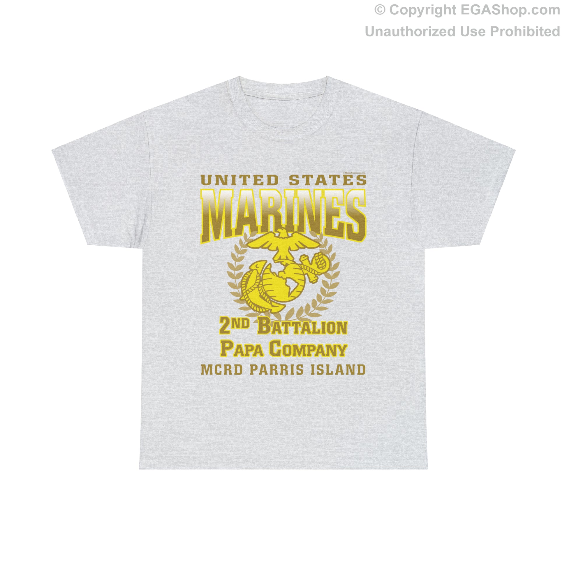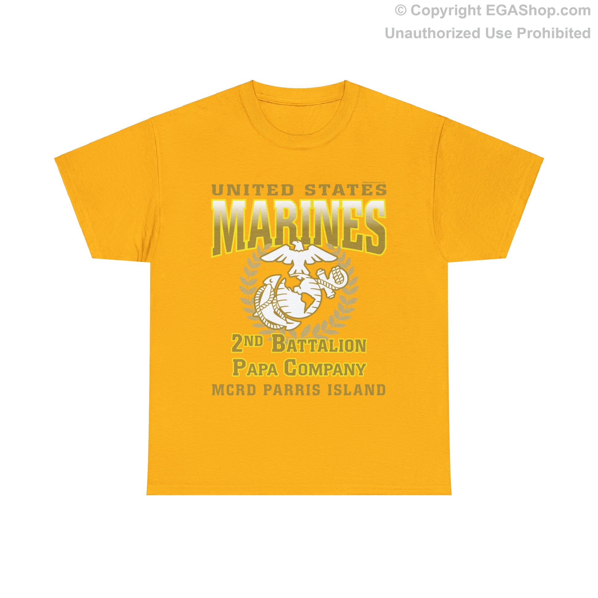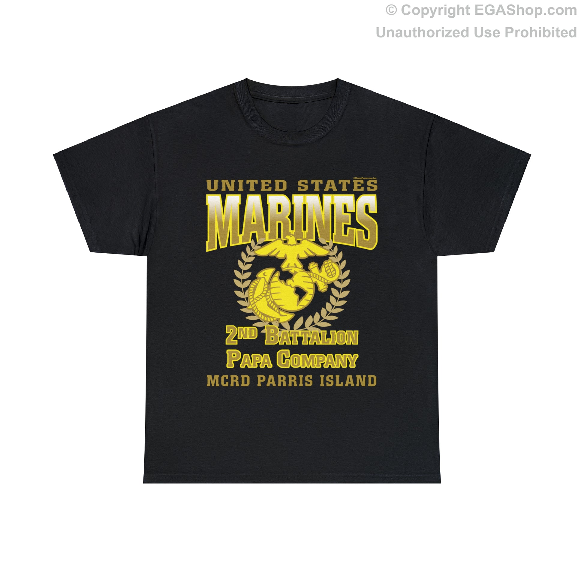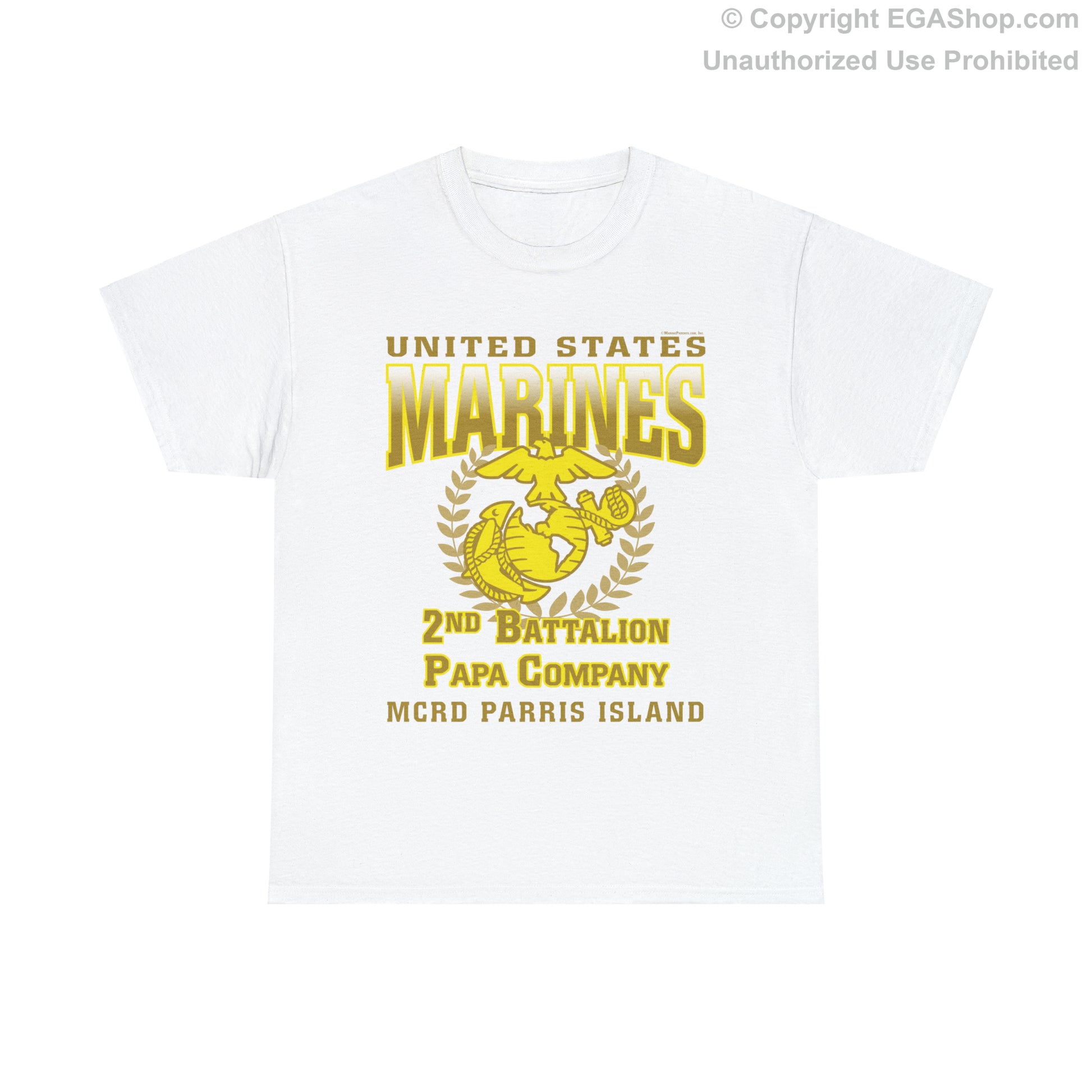 The front of the shirt includes United States Marines above the Eagle, Globe, and Anchor (EGA) plus text 2nd Battalion Papa Company MCRD Parris Island. The back includes Proud Family Semper Fi.