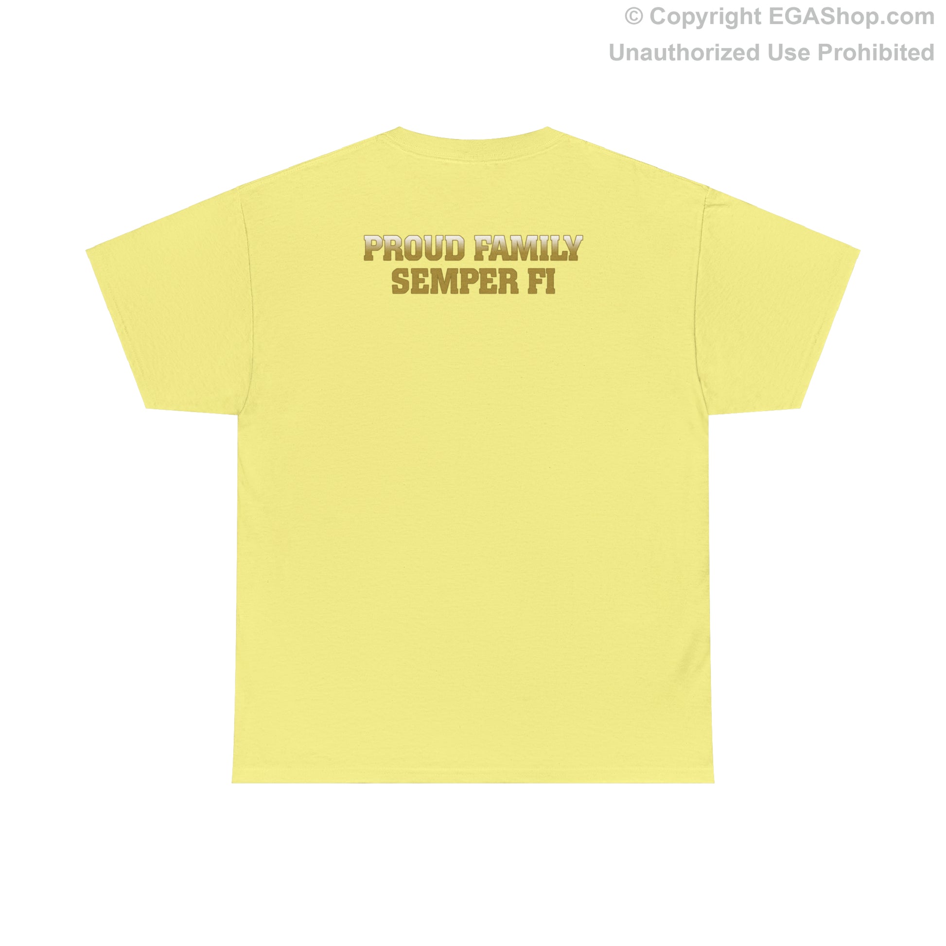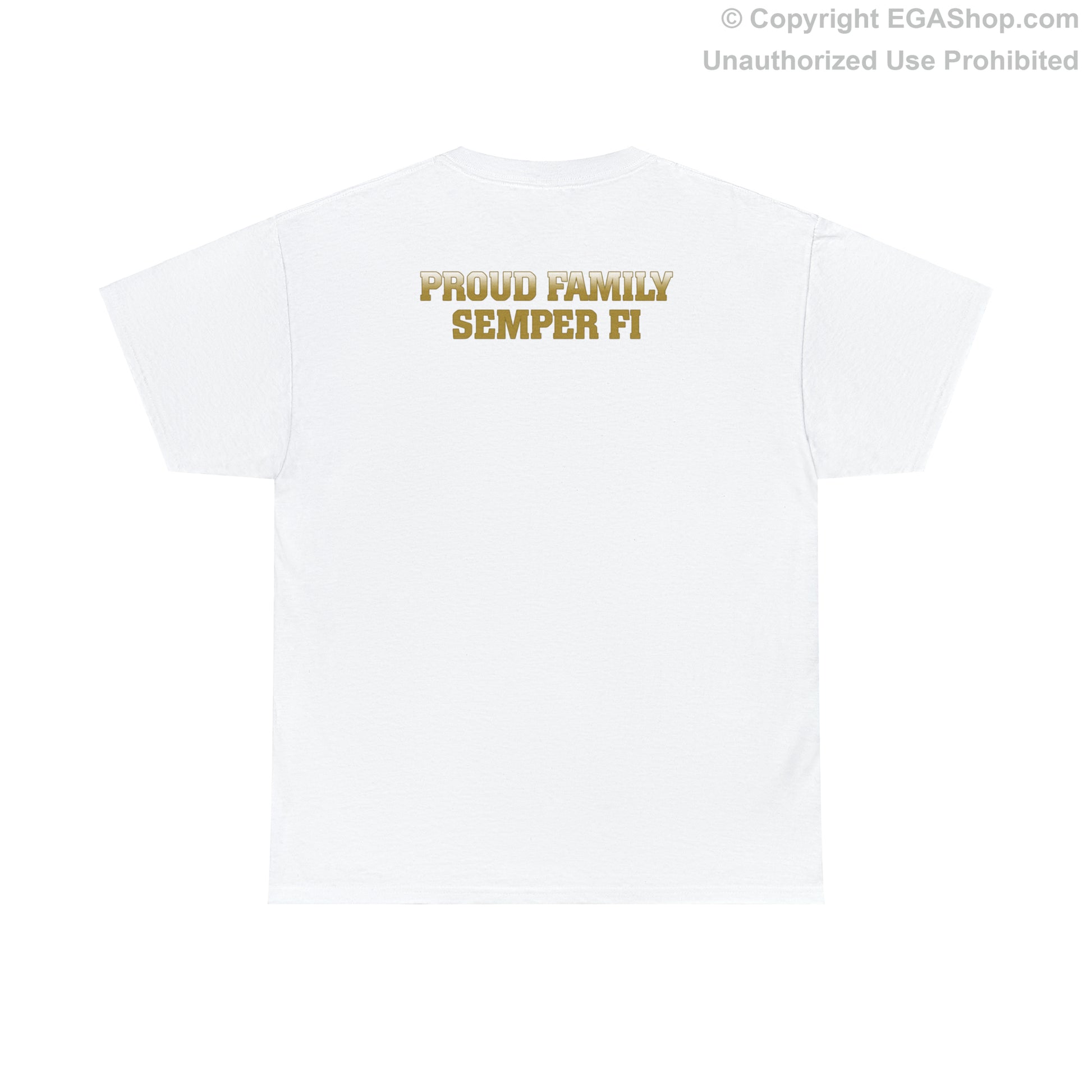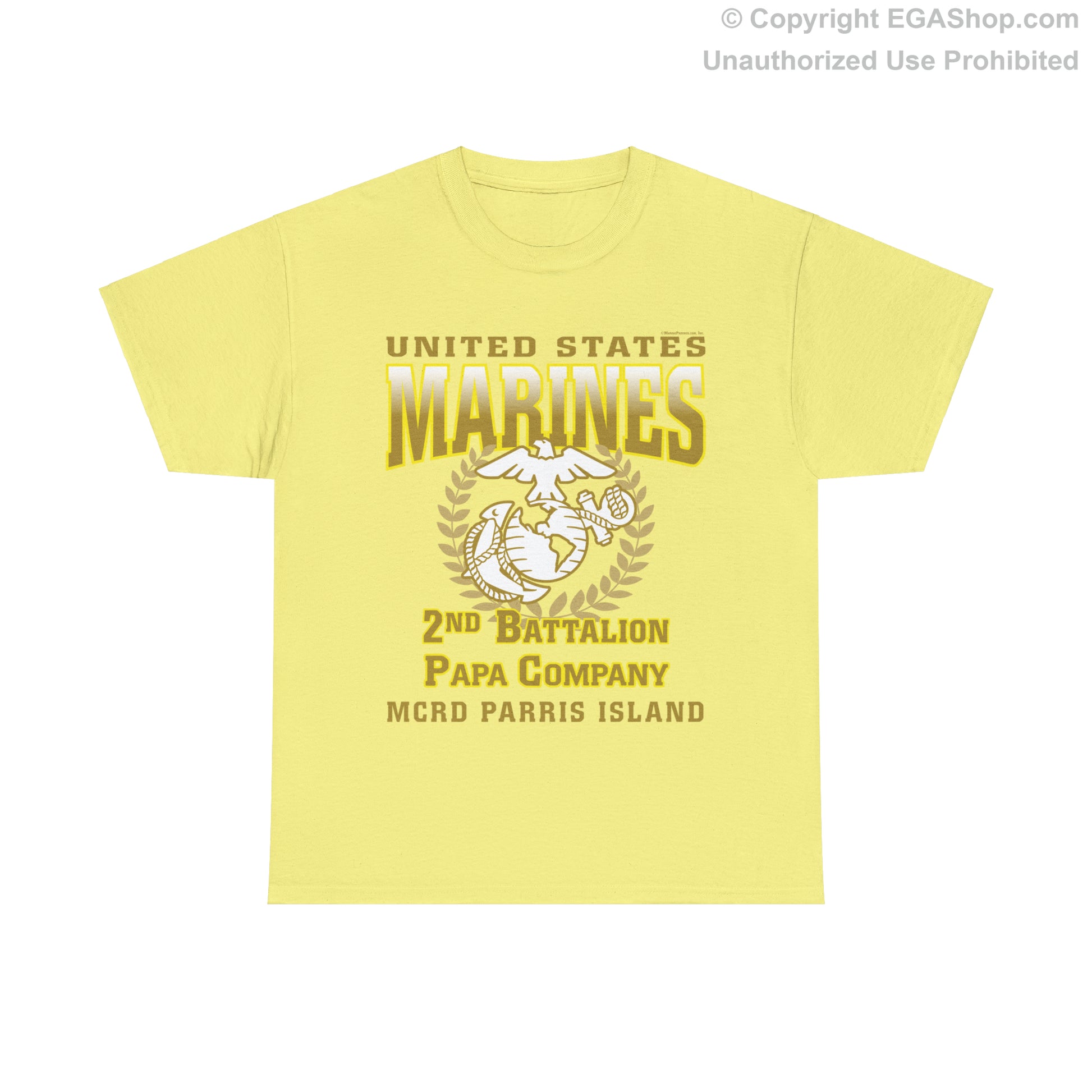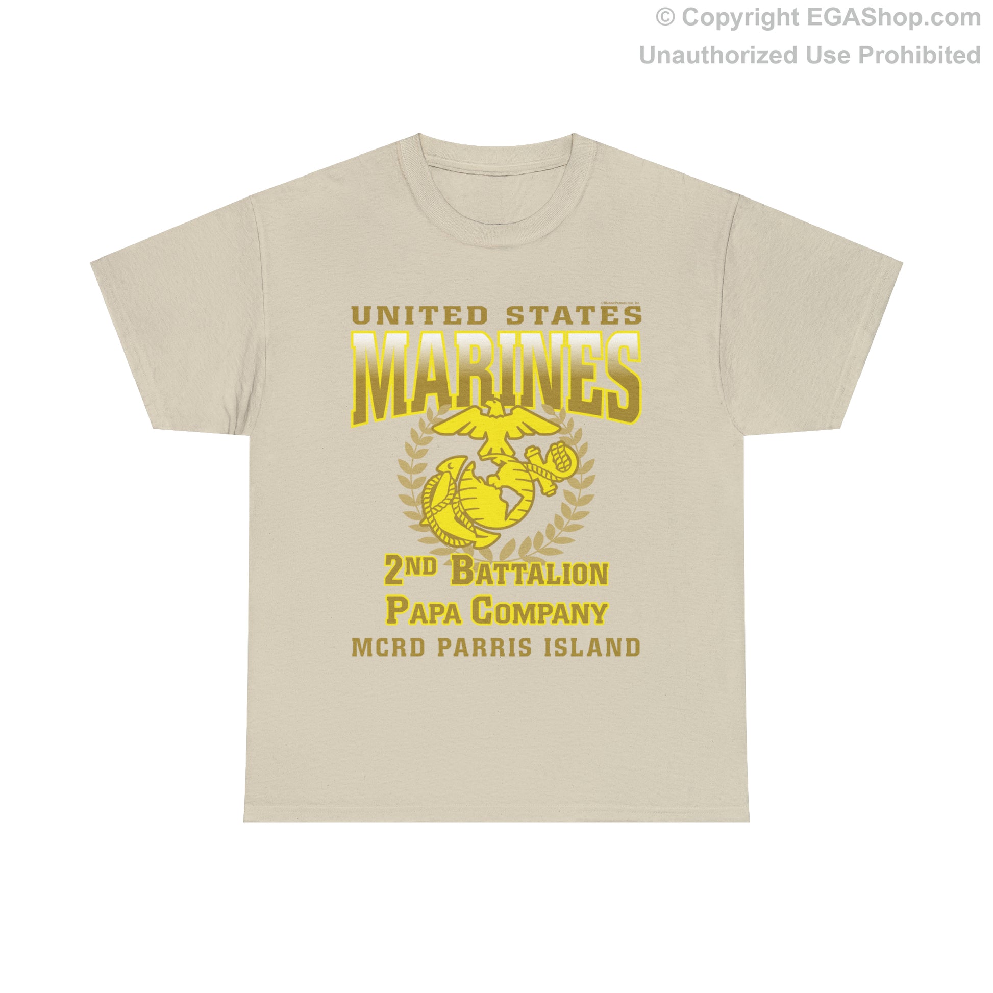 The front of the shirt includes United States Marines above the Eagle, Globe, and Anchor (EGA) plus text 2nd Battalion Papa Company MCRD Parris Island. The back includes Proud Family Semper Fi.
