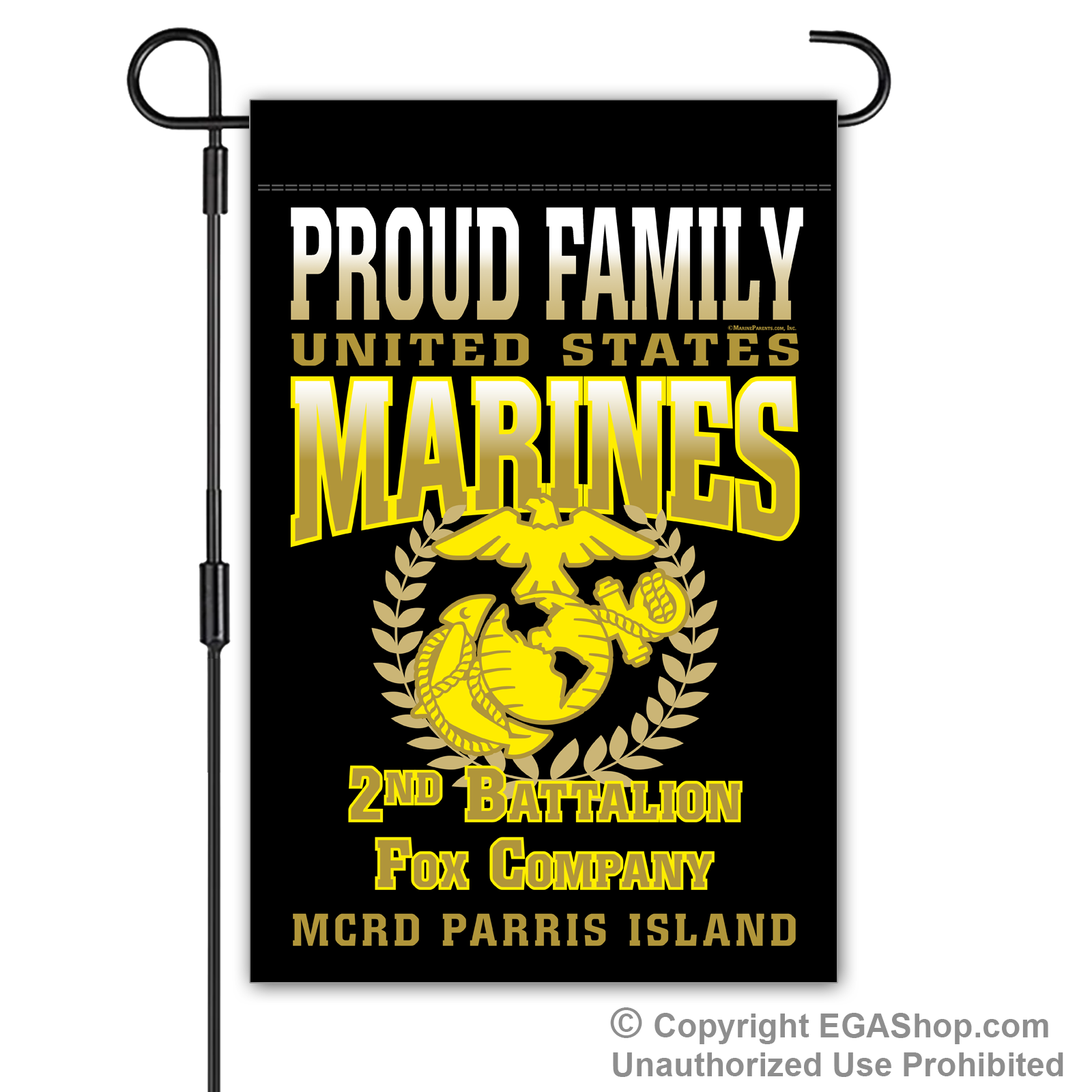 This garden flag represents 2nd Battalion PARRIS ISLAND FOX COMPANY and includes the Eagle, Globe, and Anchor (EGA). The garden flag is available in your choice of yellow or black with Proud Family at the top. Also available in black with Proud Mom or Proud Dad at the top.