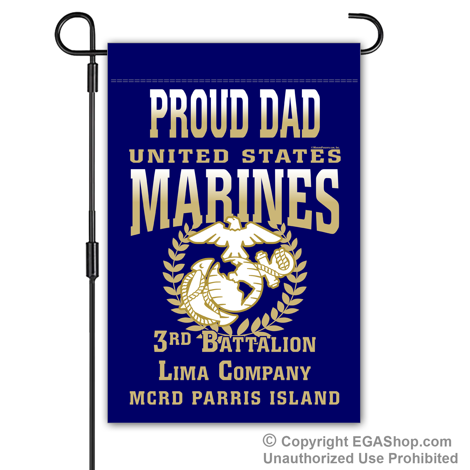 This garden flag represents 3rd Battalion PARRIS ISLAND LIMA COMPANY and includes the Eagle, Globe, and Anchor (EGA). The garden flag is available in your choice of family affiliations at the top: Proud Family, Proud Mom, or Proud Dad.