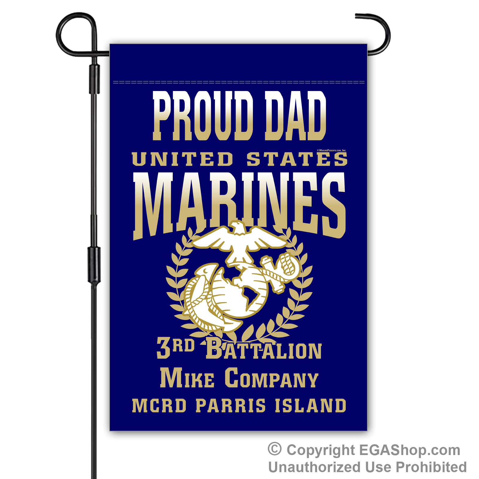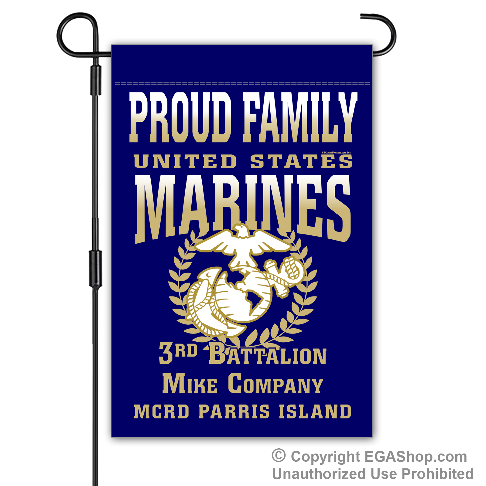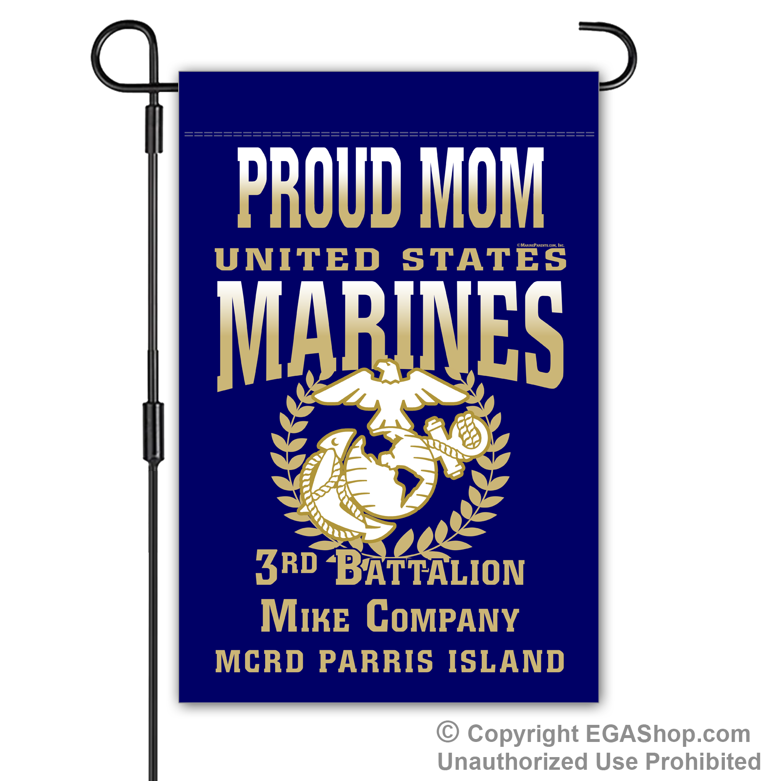 This garden flag represents 3rd Battalion PARRIS ISLAND MIKE COMPANY and includes the Eagle, Globe, and Anchor (EGA). The garden flag is available in your choice of family affiliations at the top: Proud Family, Proud Mom, or Proud Dad.