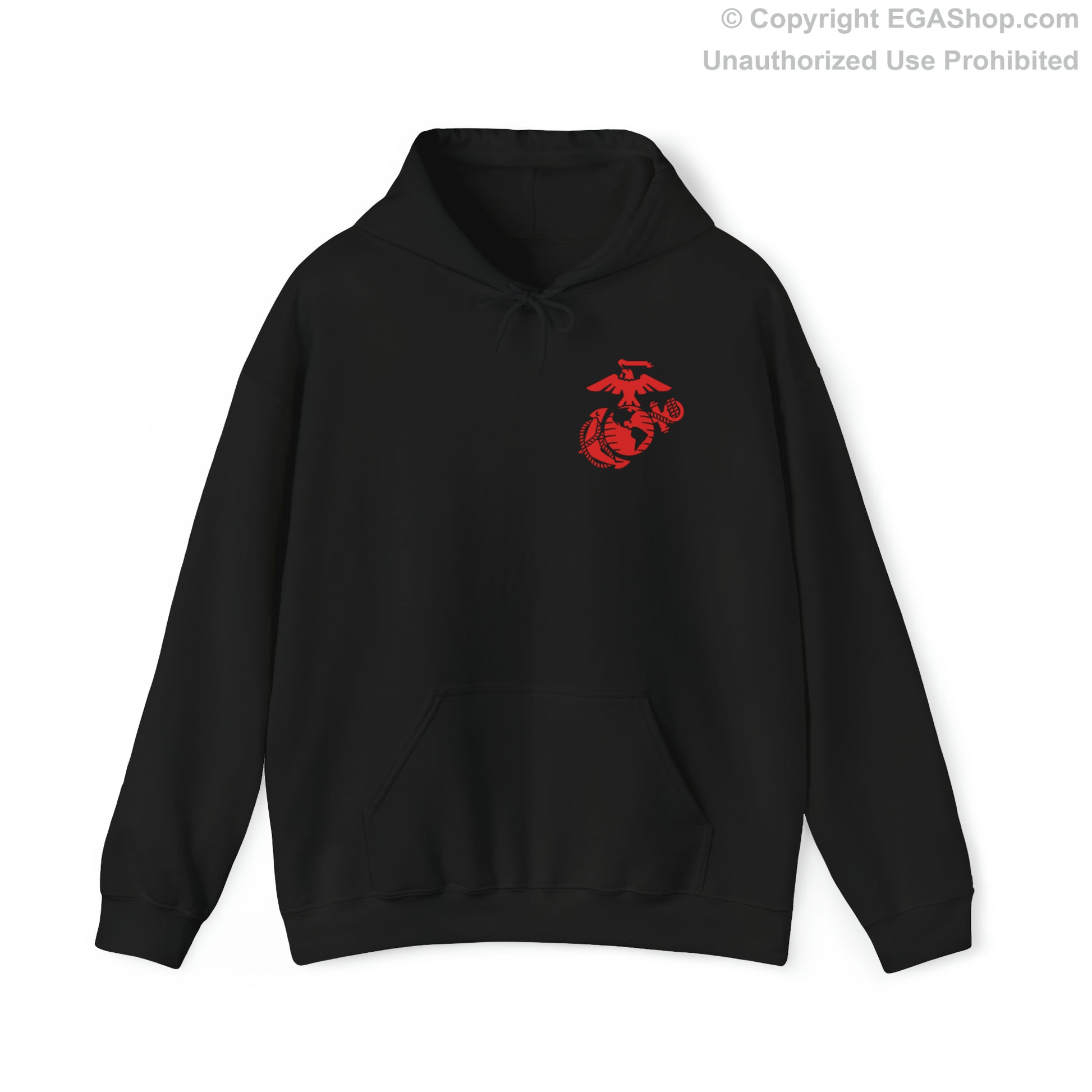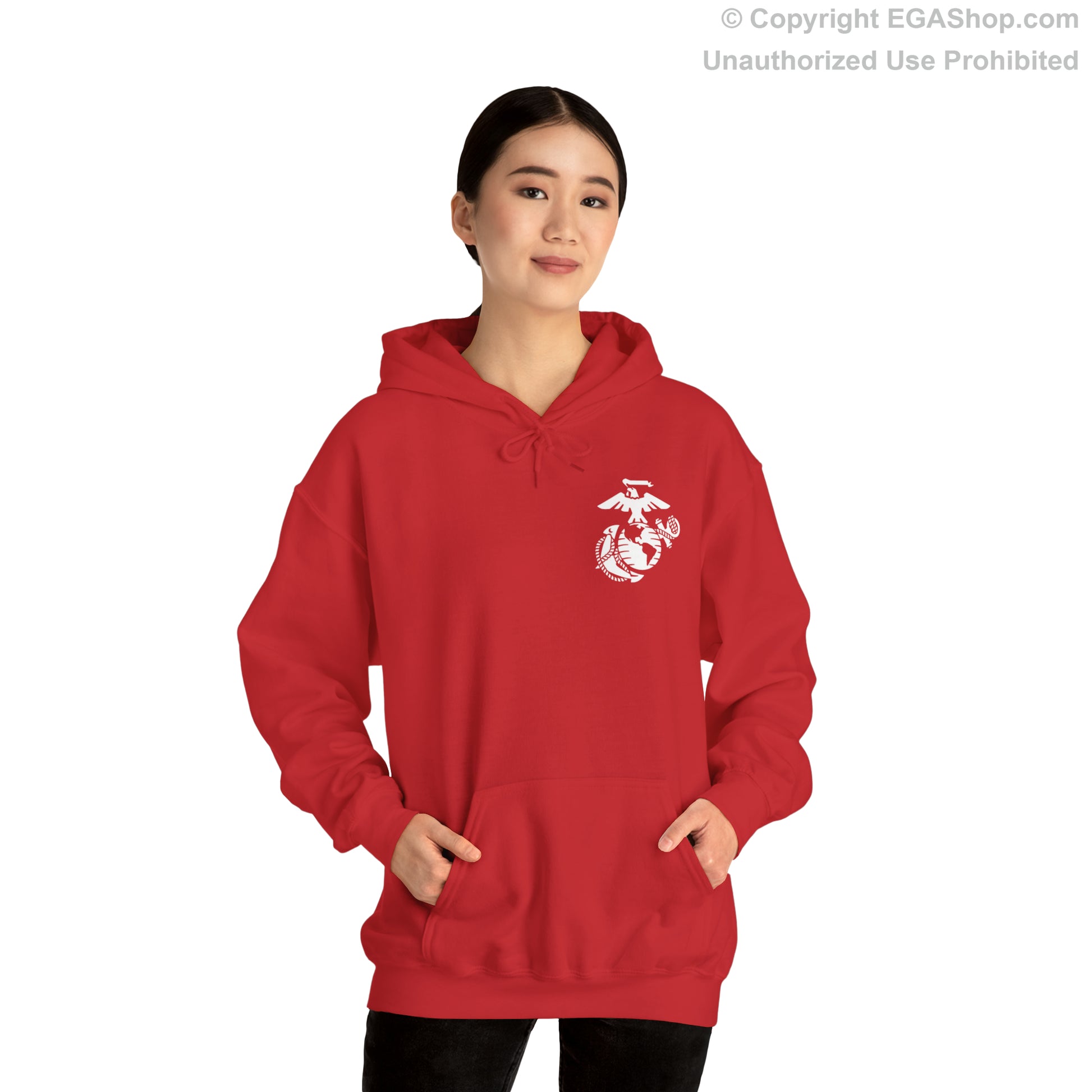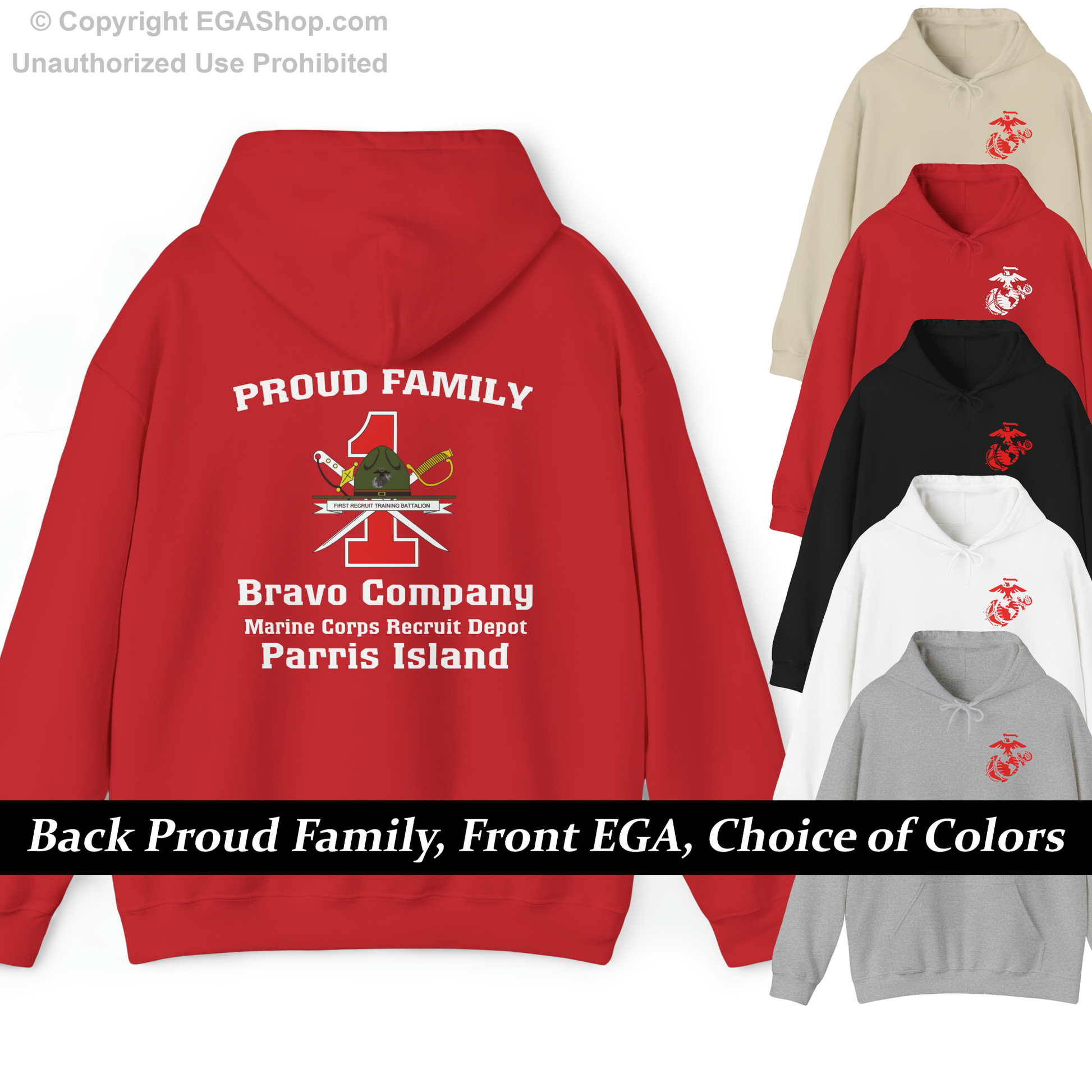 Our classic Marine Corps boot camp graduation design on a classic hoodie is available in your choice of colors. The 1st Battalion is typically represented with RED. The front of the hoodie has the Eagle, Globe, and Anchor (EGA) on the top left. The back includes the text Proud Family over the 1st Battalion Crest and Bravo Company Marine Corps Recruit Depot Parris Island.