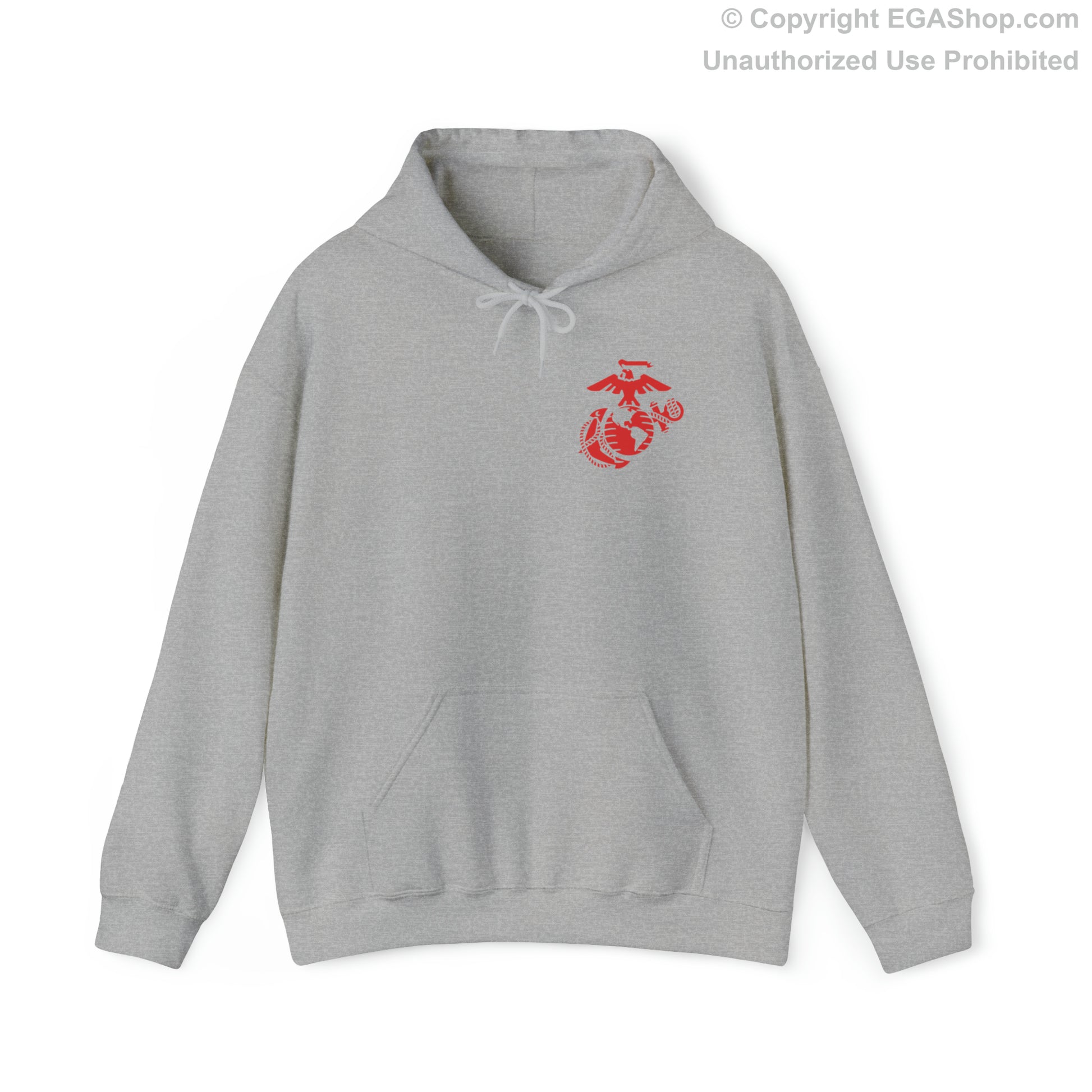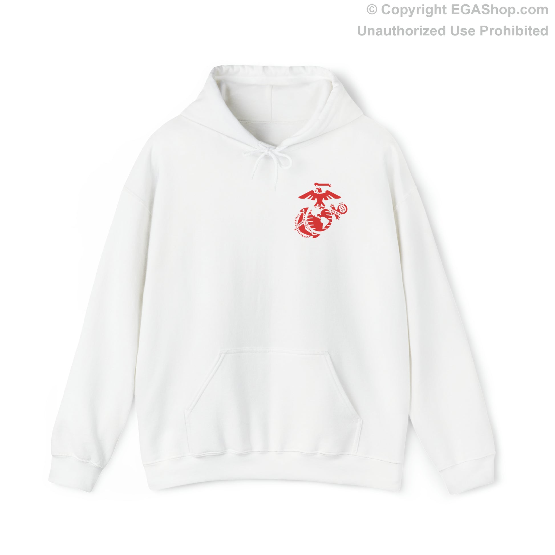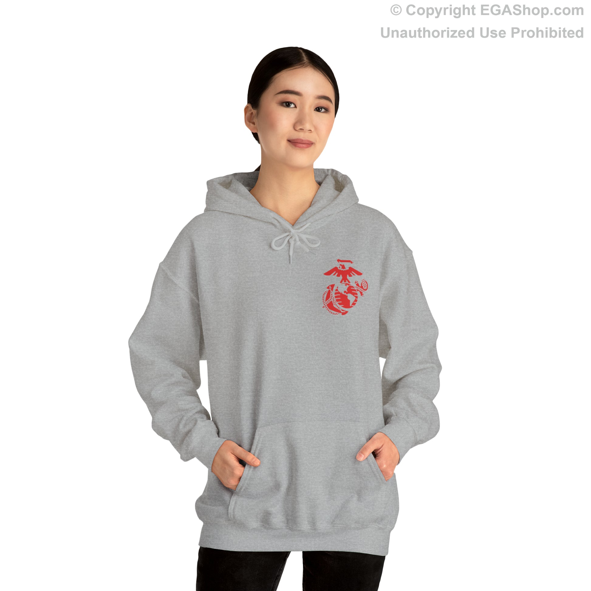 Our classic Marine Corps boot camp graduation design on a classic hoodie is available in your choice of colors. The 1st Battalion is typically represented with RED. The front of the hoodie has the Eagle, Globe, and Anchor (EGA) on the top left. The back includes the text Proud Family over the 1st Battalion Crest and Bravo Company Marine Corps Recruit Depot Parris Island.