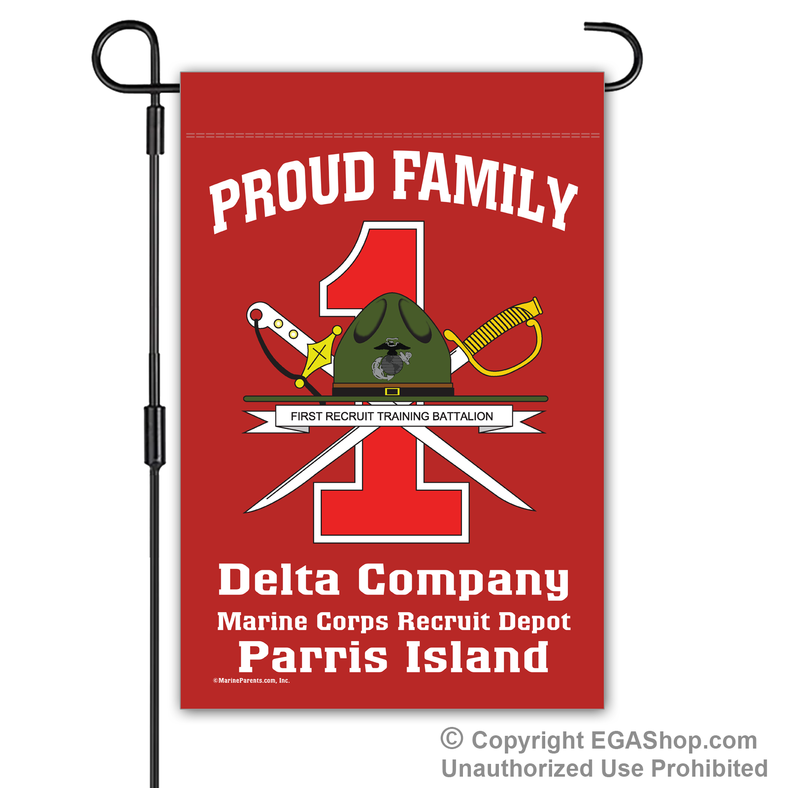 This garden flag represents 1st Battalion PARRIS ISLAND DELTA COMPANY and includes the 1st Recruit Training Battalion Crest with the text PROUD FAMILY at the top. Show your pride in your recruit for 13 weeks of boot camp!