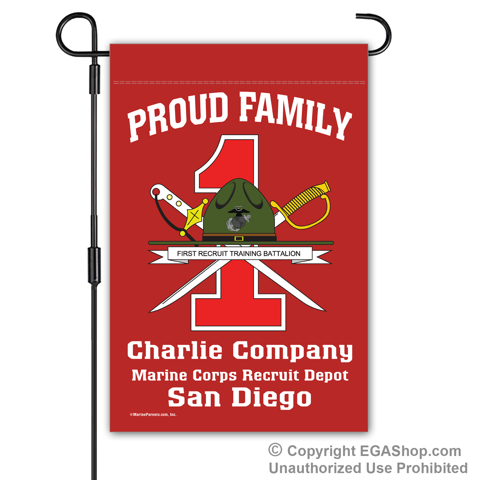 This garden flag represents 1st Battalion SAN DIEGO CHARLIE COMPANY and includes the 1st Recruit Training Battalion Crest with the text PROUD FAMILY at the top. Show your pride in your recruit for 13 weeks of boot camp!