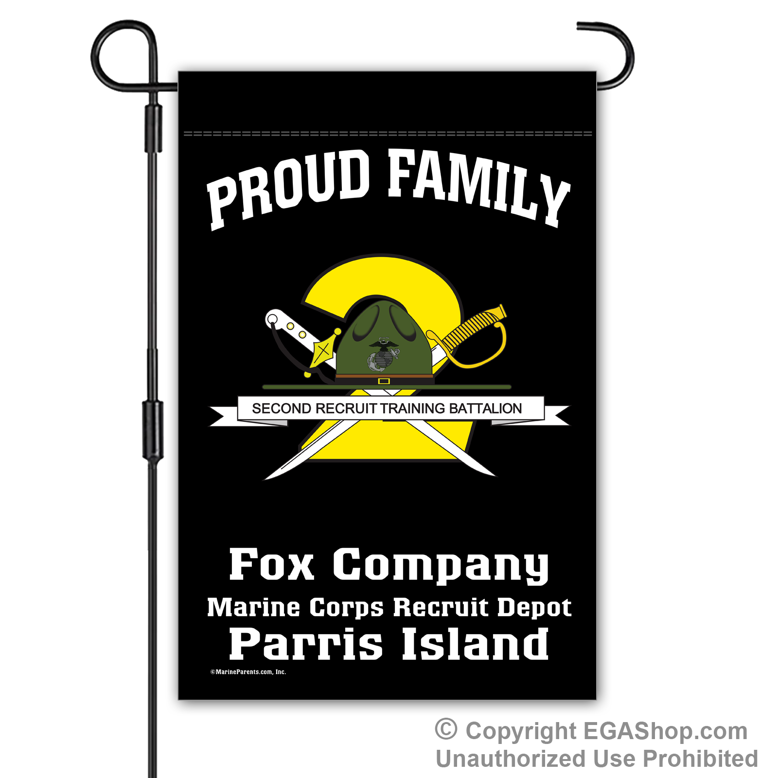 This garden flag represents 2nd Battalion PARRIS ISLAND FOX COMPANY and includes the 2nd Recruit Training Battalion Crest with the text PROUD FAMILY at the top. Choose a yellow or black background color. Show your pride in your recruit for 13 weeks of boot camp!