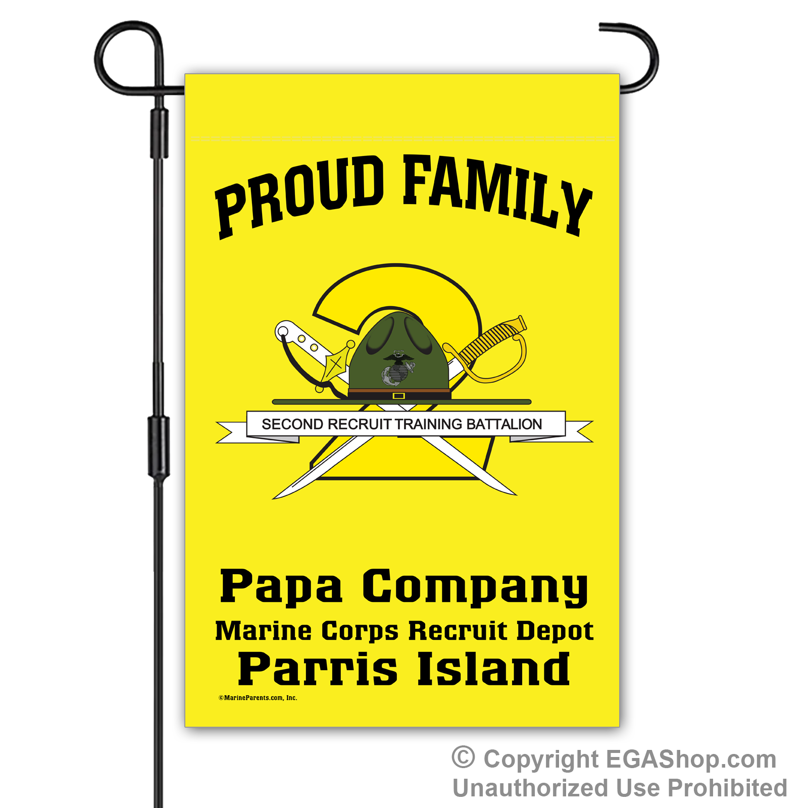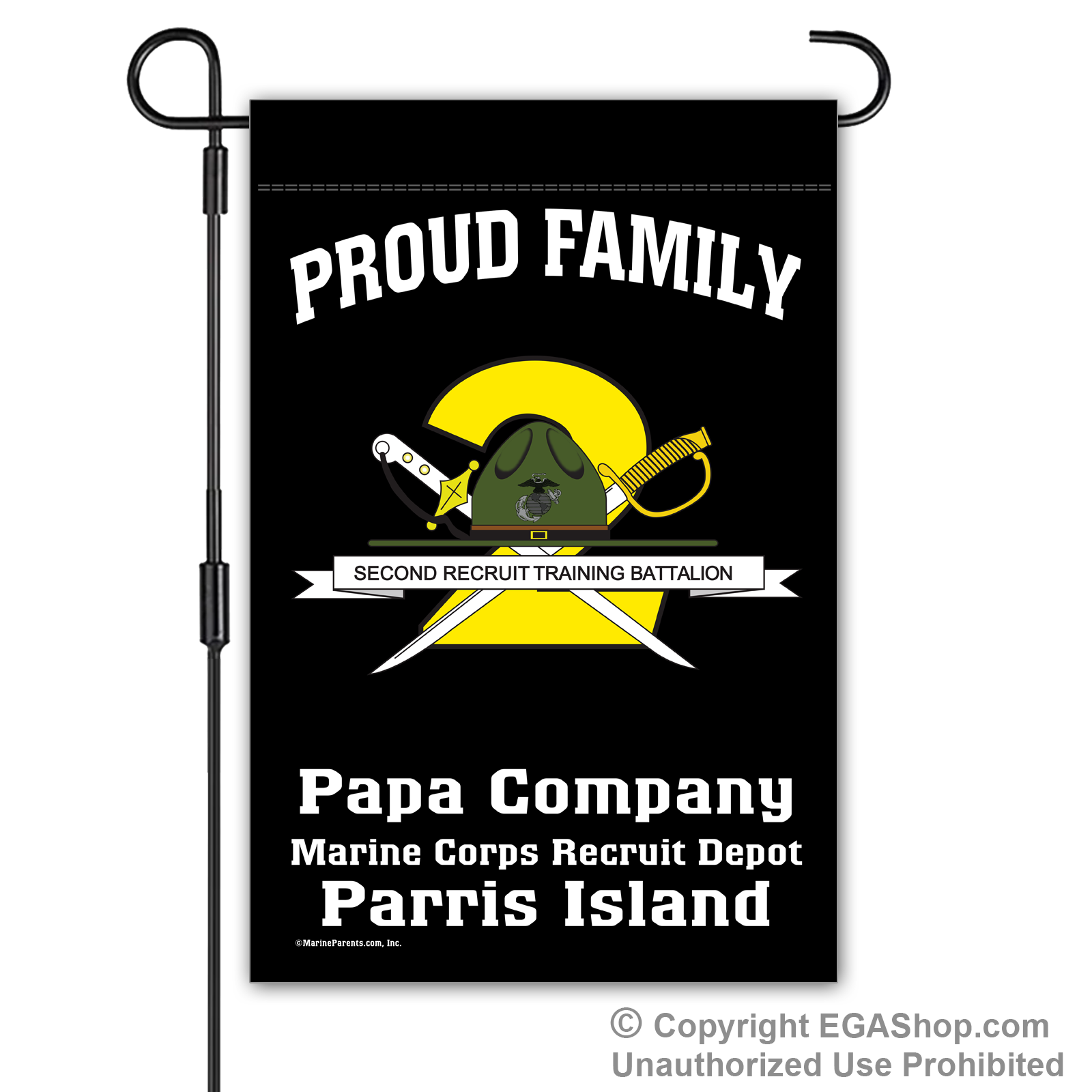 This garden flag represents 2nd Battalion PARRIS ISLAND PAPA COMPANY and includes the 2nd Recruit Training Battalion Crest with the text PROUD FAMILY at the top. Choose a yellow or black background color. Show your pride in your recruit for 13 weeks of boot camp!