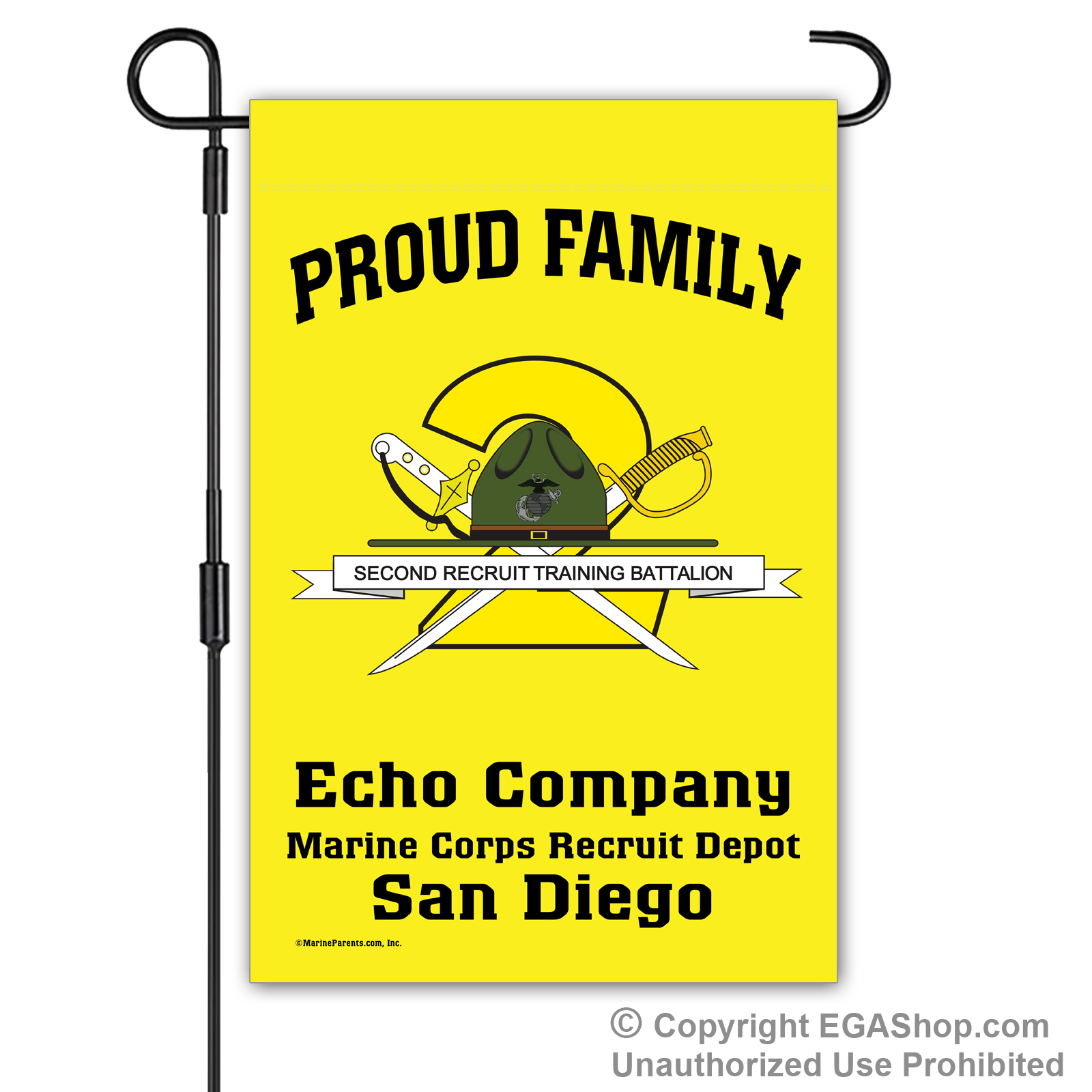 This garden flag represents 2nd Battalion SAN DIEGO ECHO COMPANY and includes the 2nd Recruit Training Battalion Crest with the text PROUD FAMILY at the top. Choose a yellow or black background color. Show your pride in your recruit for 13 weeks of boot camp!