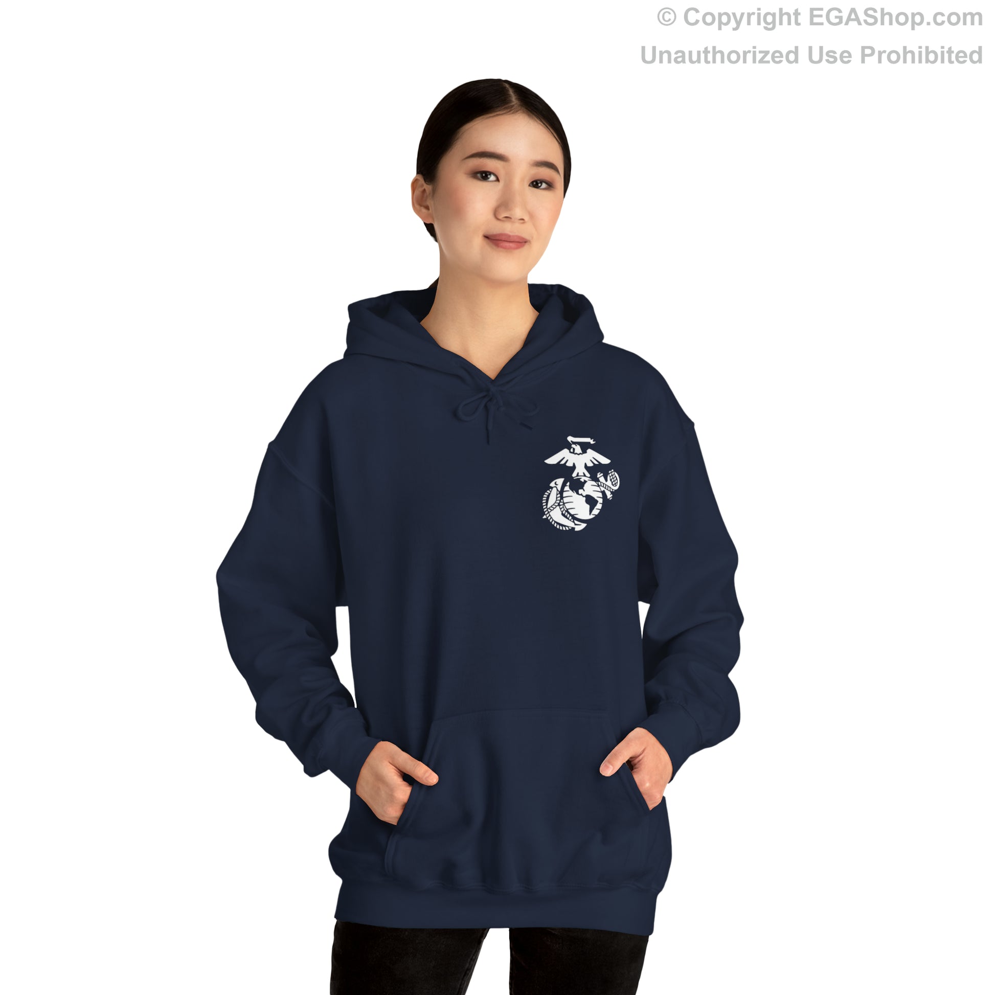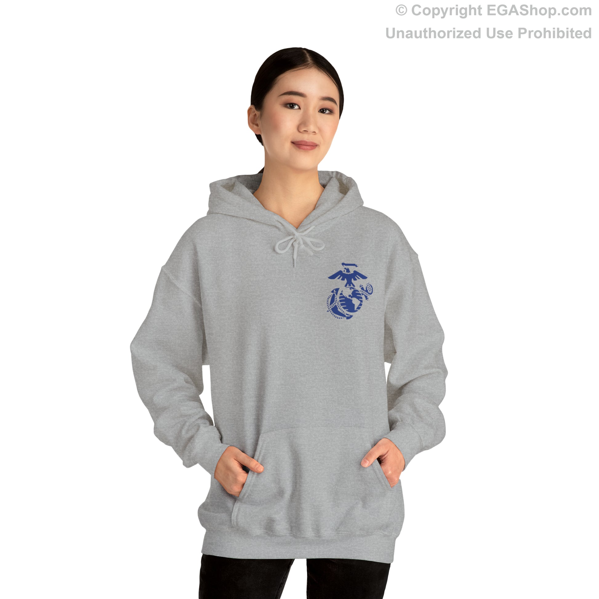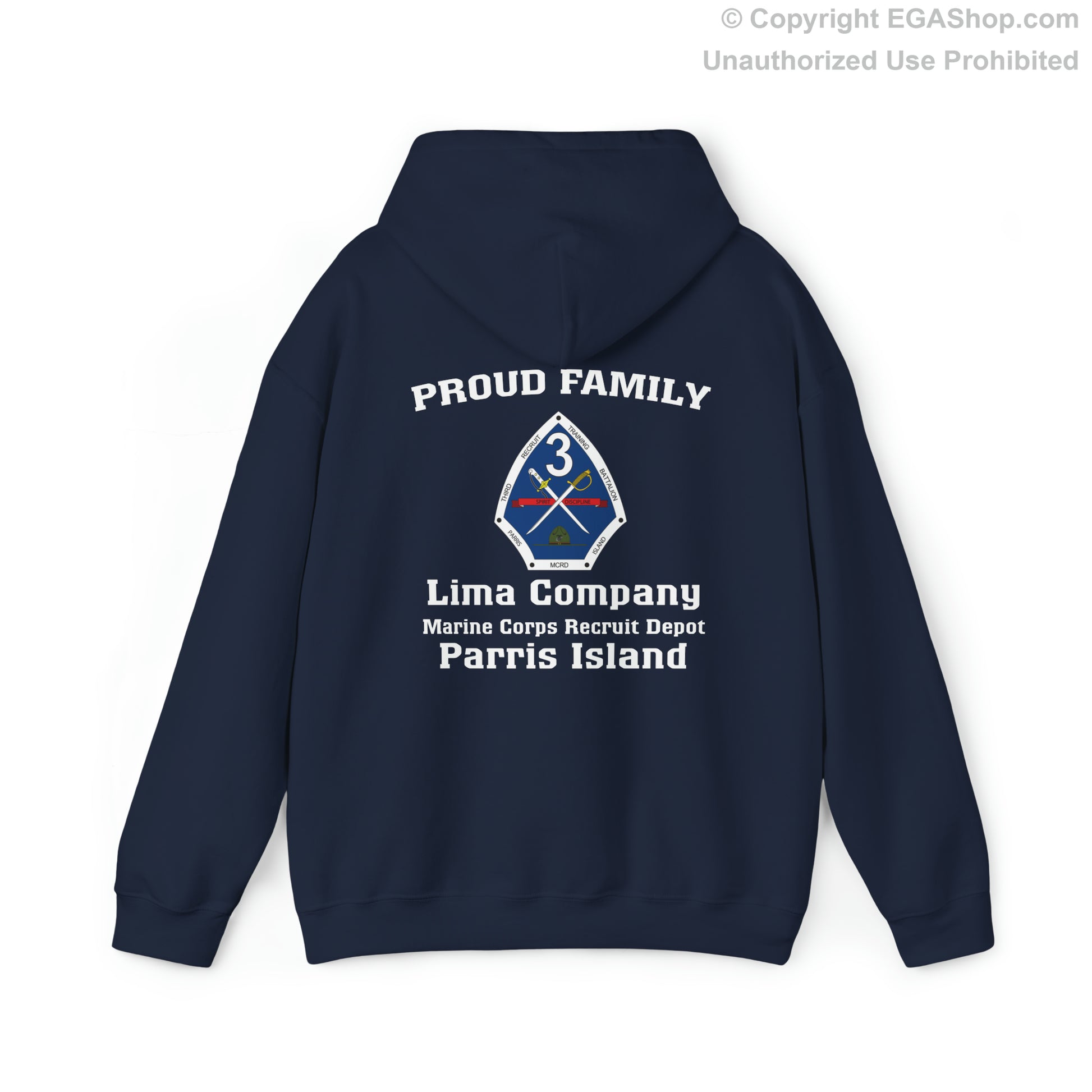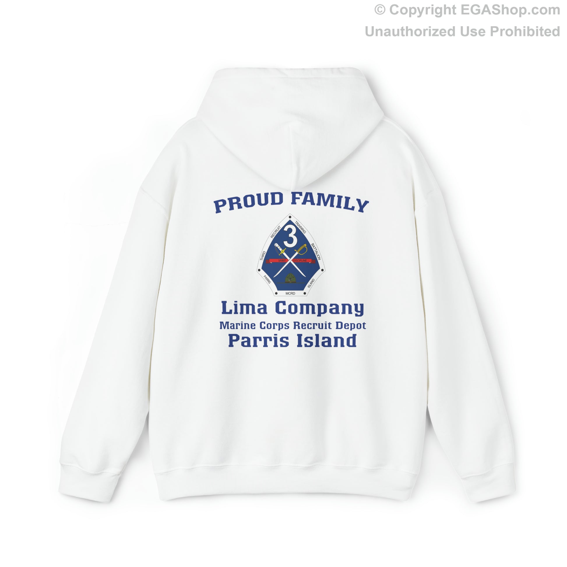 Our classic Marine Corps boot camp graduation design on a classic hoodie is available in a choice of colors. The 3rd Battalion is typically represented with BLUE. The front of the hoodie has the Eagle, Globe, and Anchor (EGA) on the top left. The back includes the text Proud Family over the 3rd Battalion Crest and Lima Company Marine Corps Recruit Depot Parris Island.
