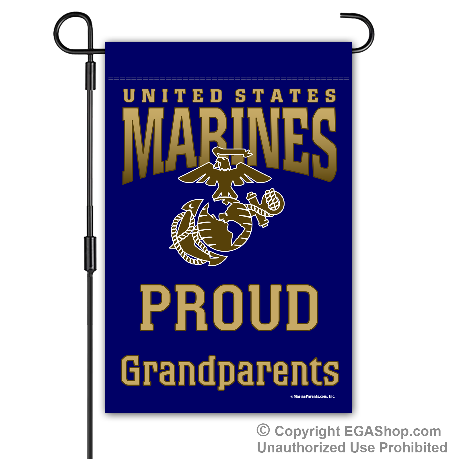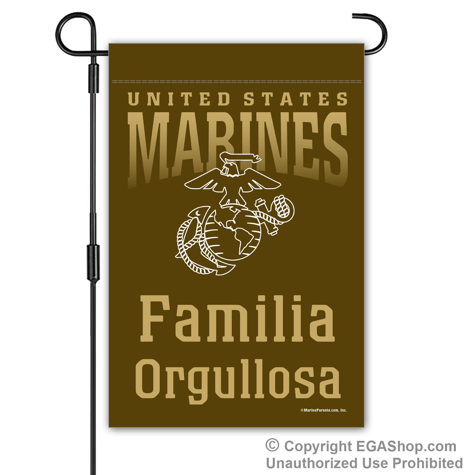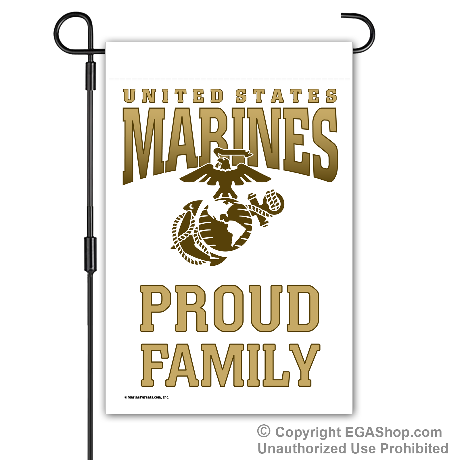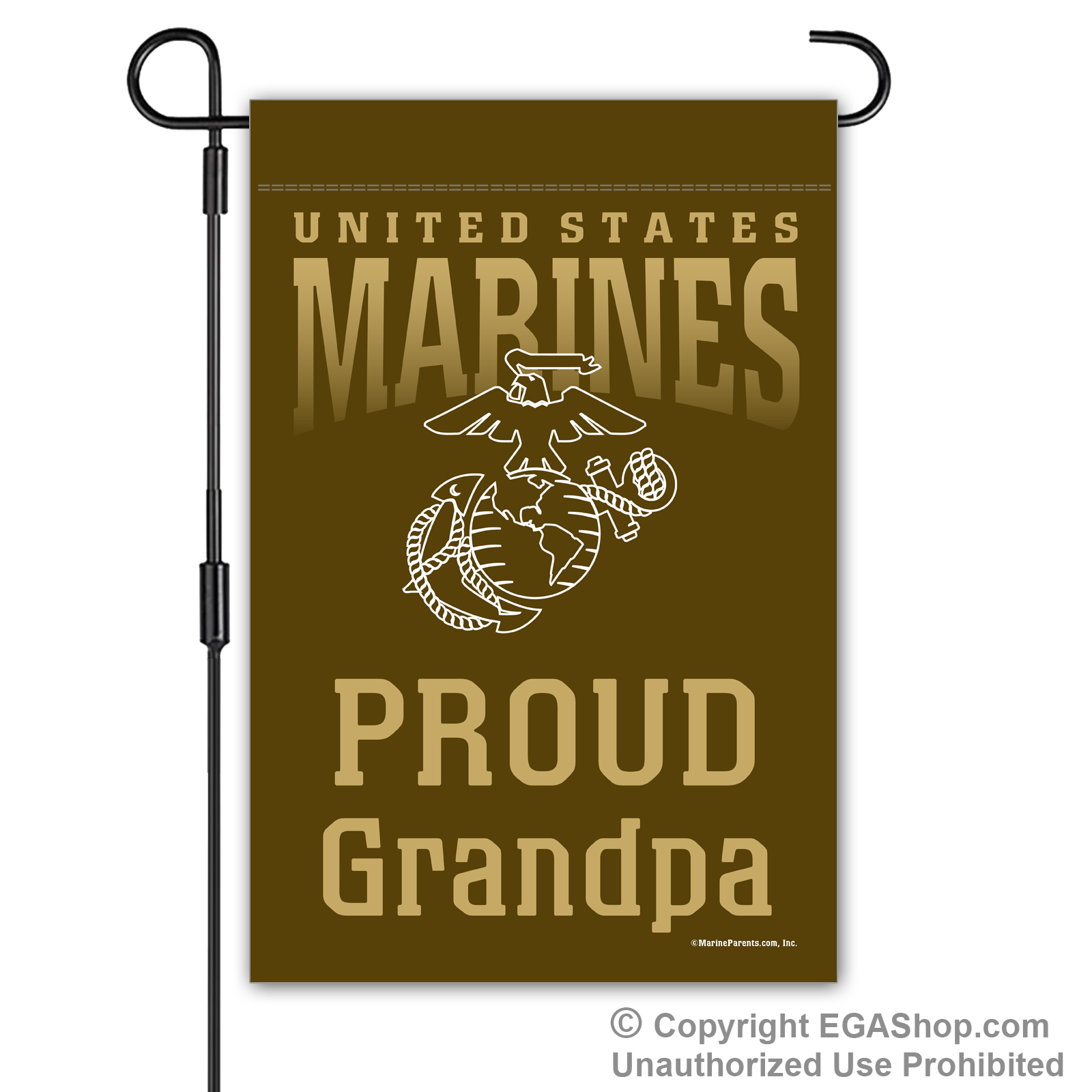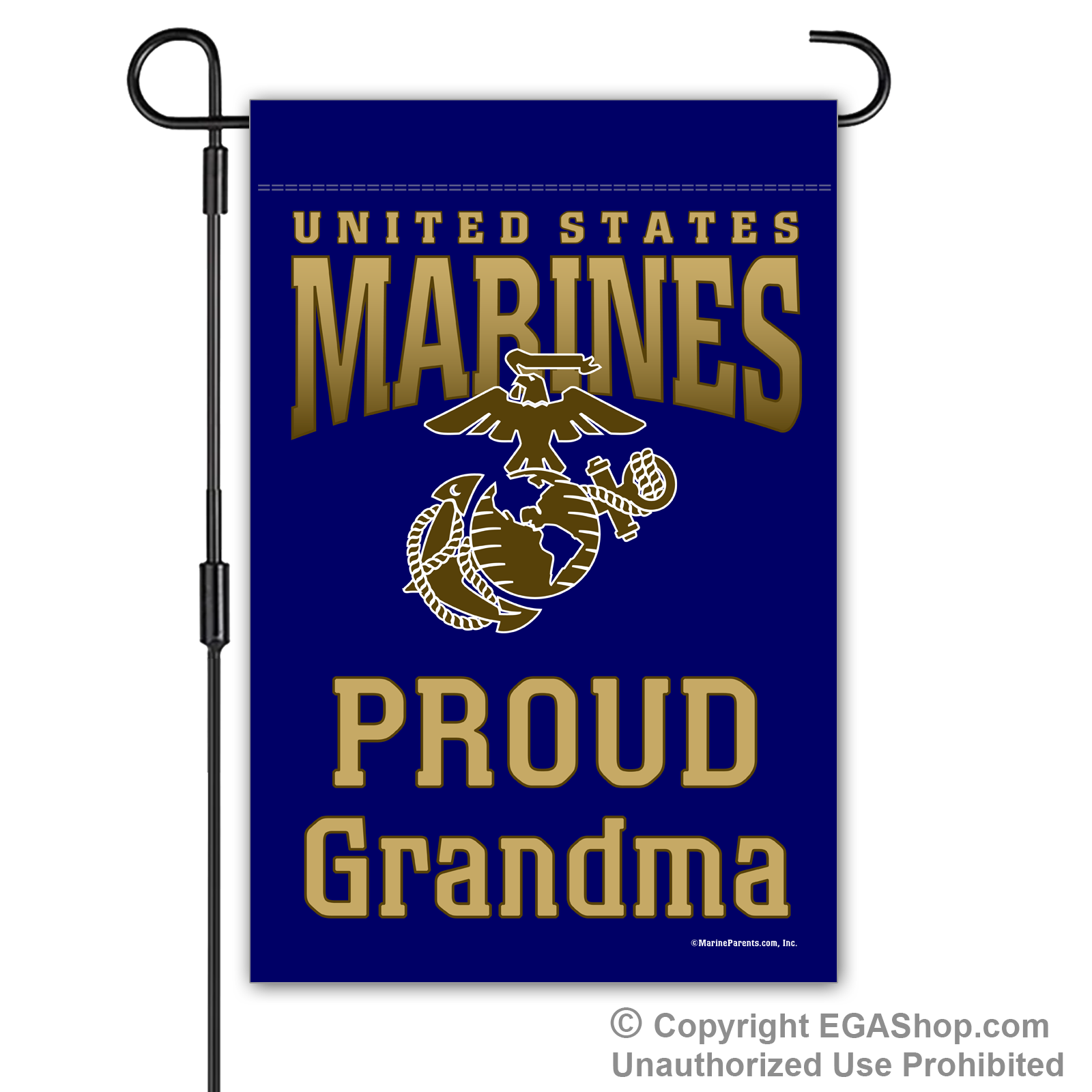 Our most popular Marine Family garden flag features United Sates Marines above the Eagle, Globe, and Anchor (EGA) with text reading "Proud ____" where you choose the affiliation. We offer it in a white, black, red, blue, or brown background. Choose Proud MoM, Dad, Family, Friends, Familia, Parents, Grandparents, Grandma, Grandpa, or Supporter.