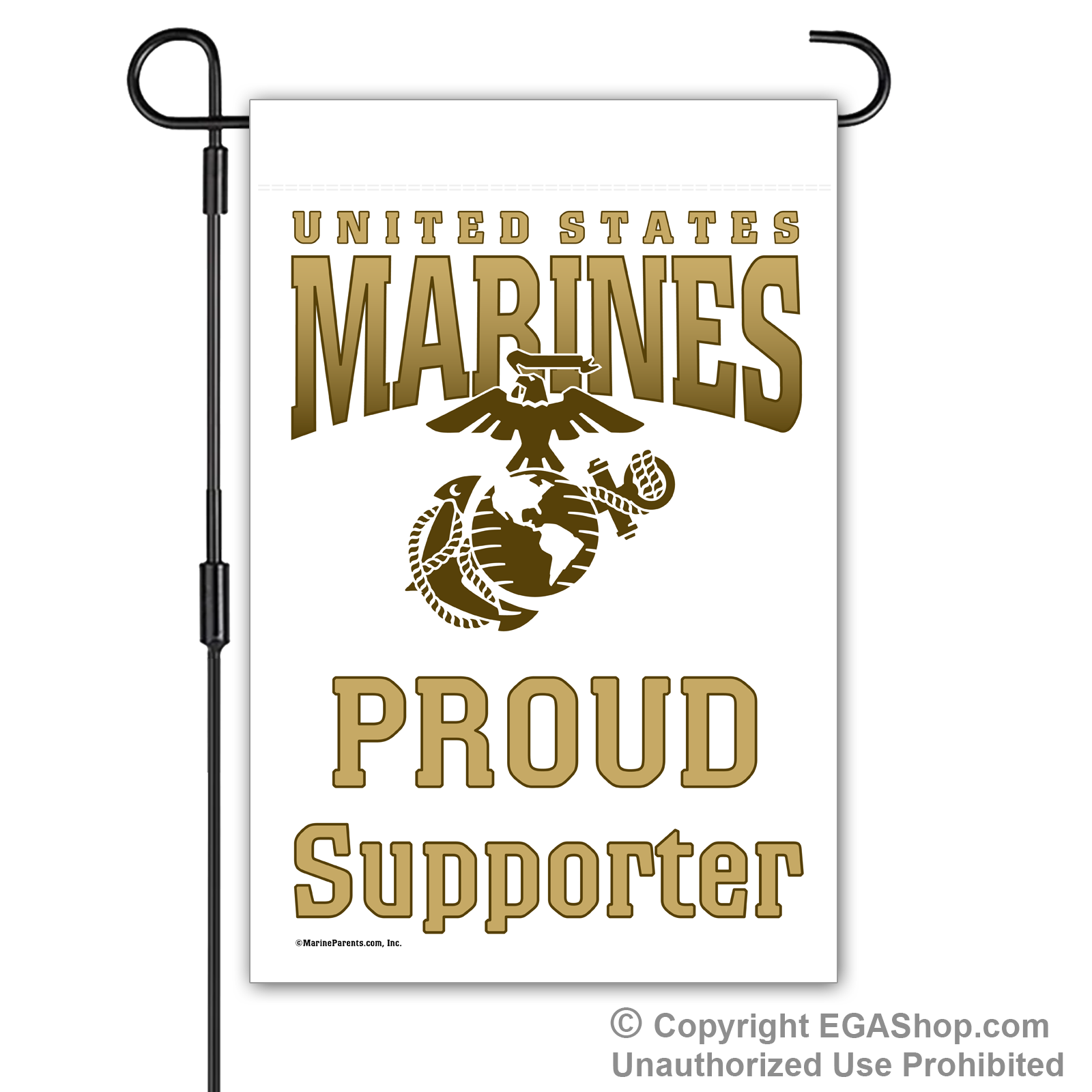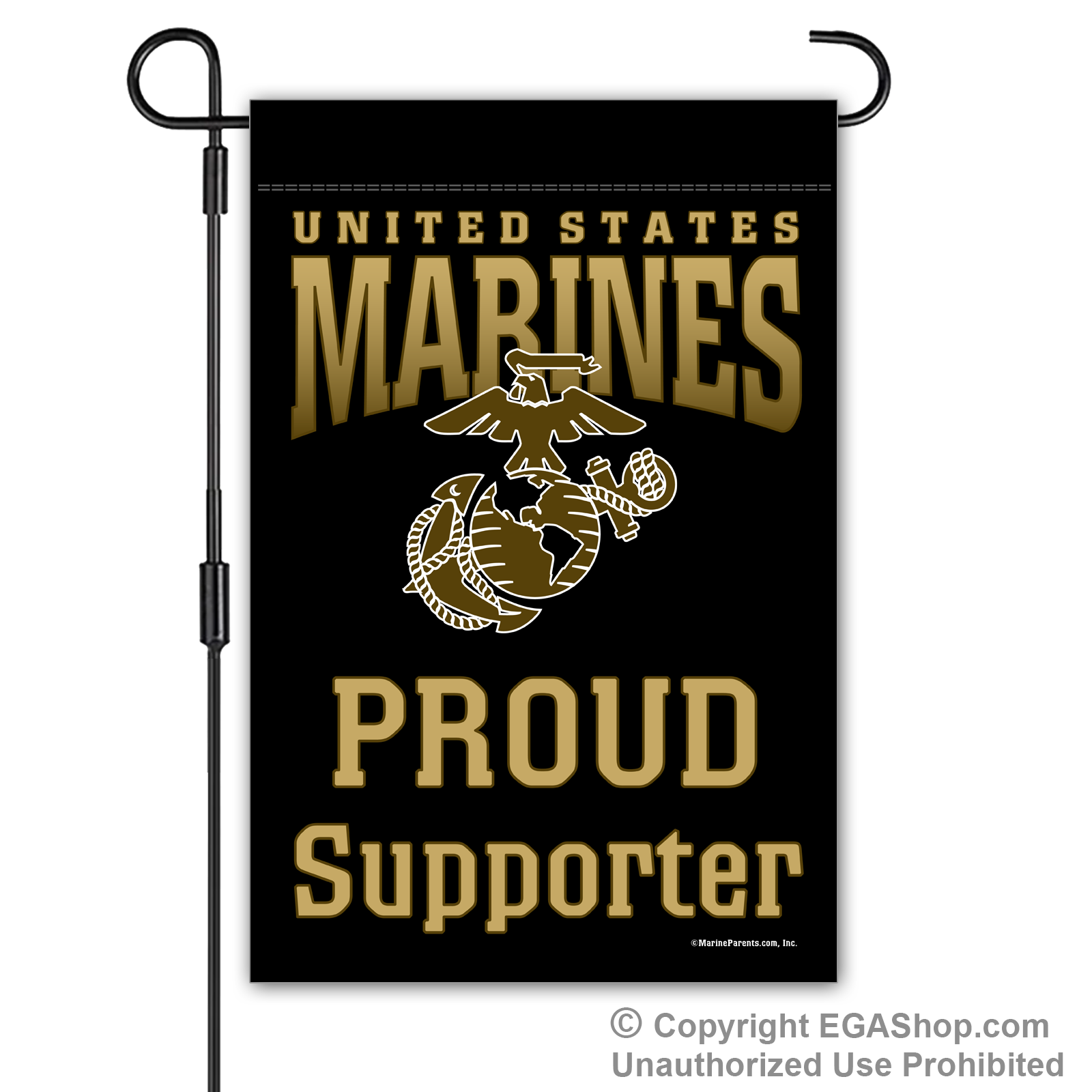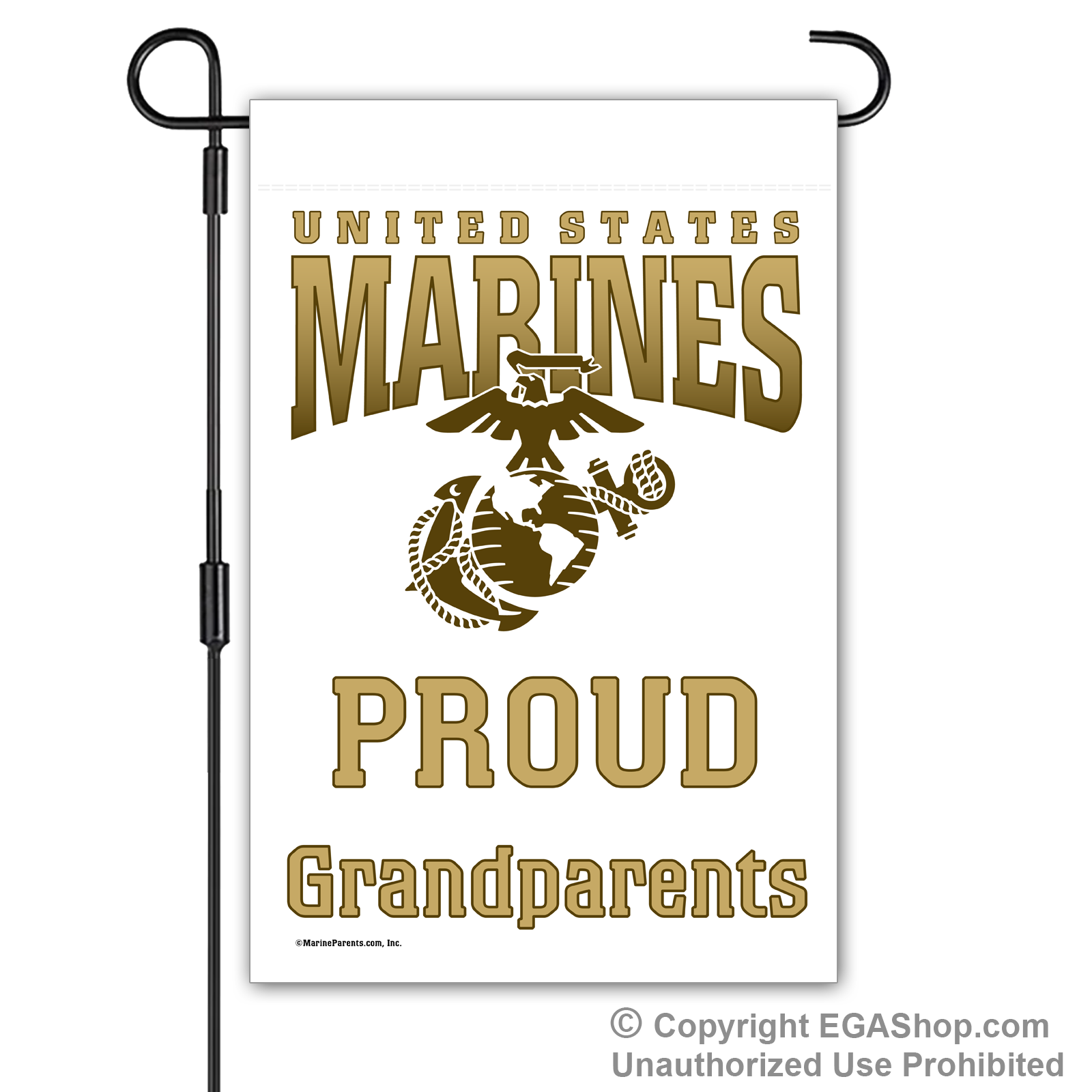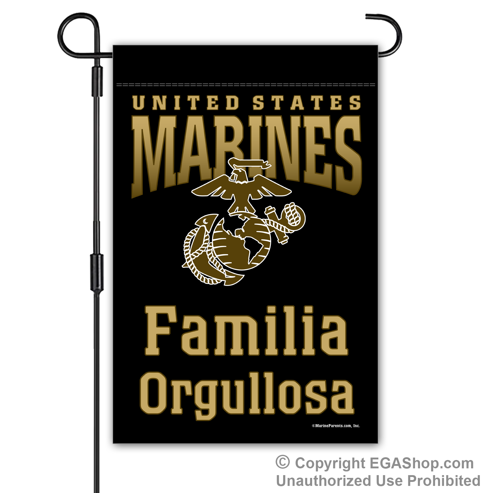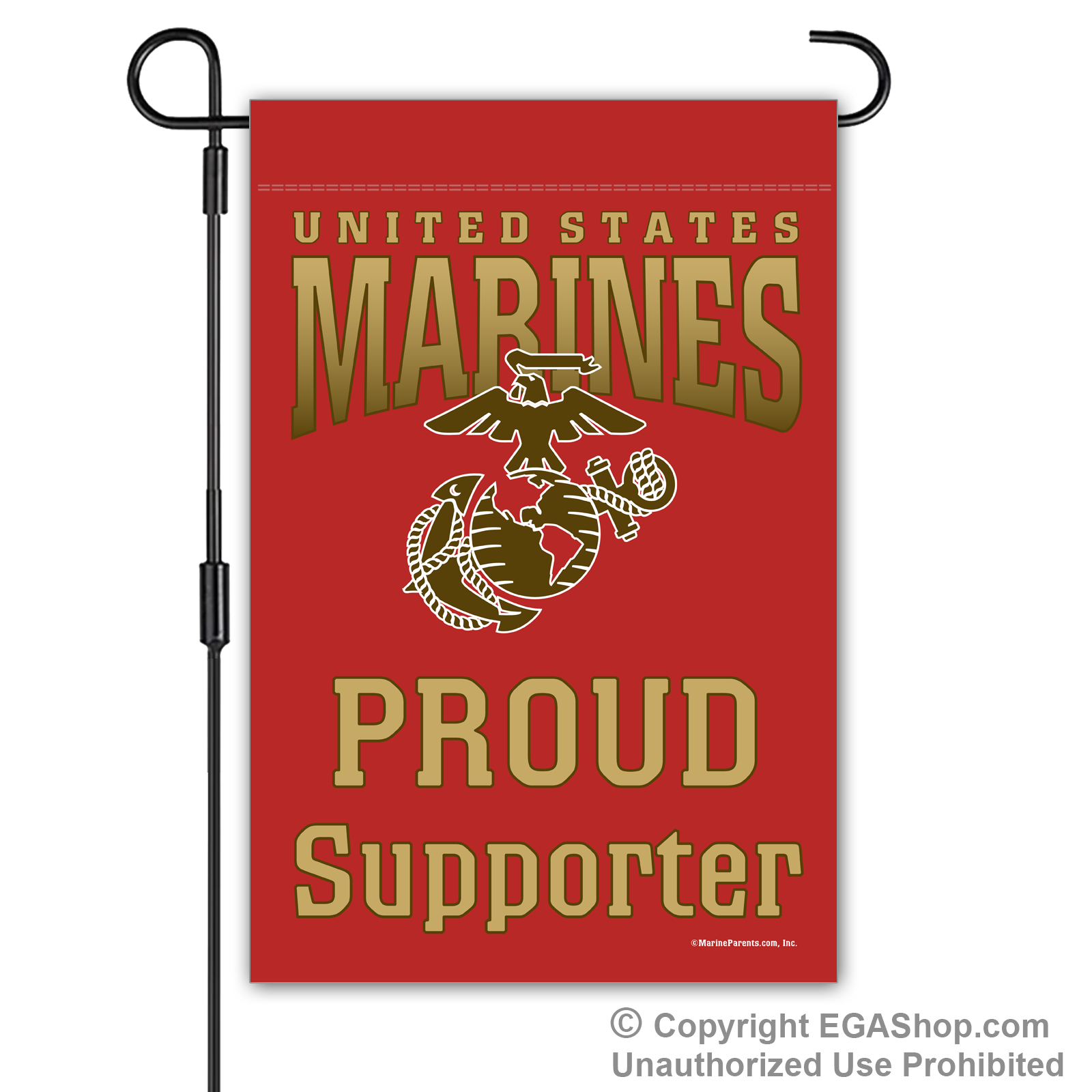 Our most popular Marine Family garden flag features United Sates Marines above the Eagle, Globe, and Anchor (EGA) with text reading "Proud ____" where you choose the affiliation. We offer it in a white, black, red, blue, or brown background. Choose Proud MoM, Dad, Family, Friends, Familia, Parents, Grandparents, Grandma, Grandpa, or Supporter.
