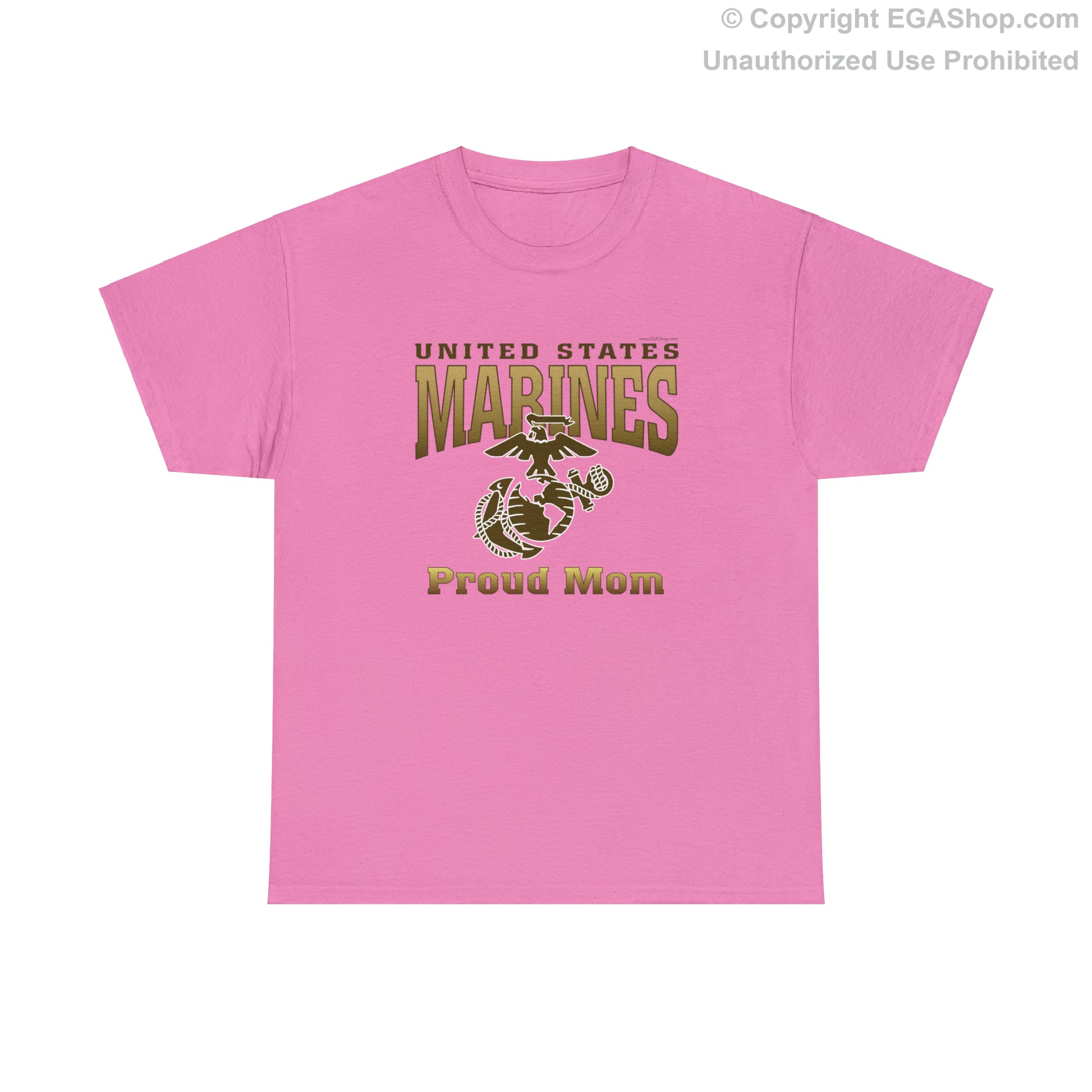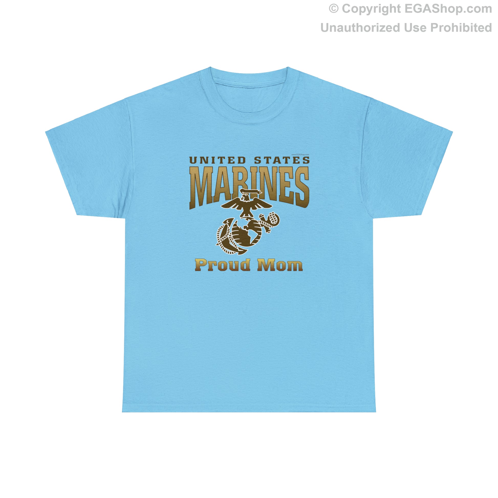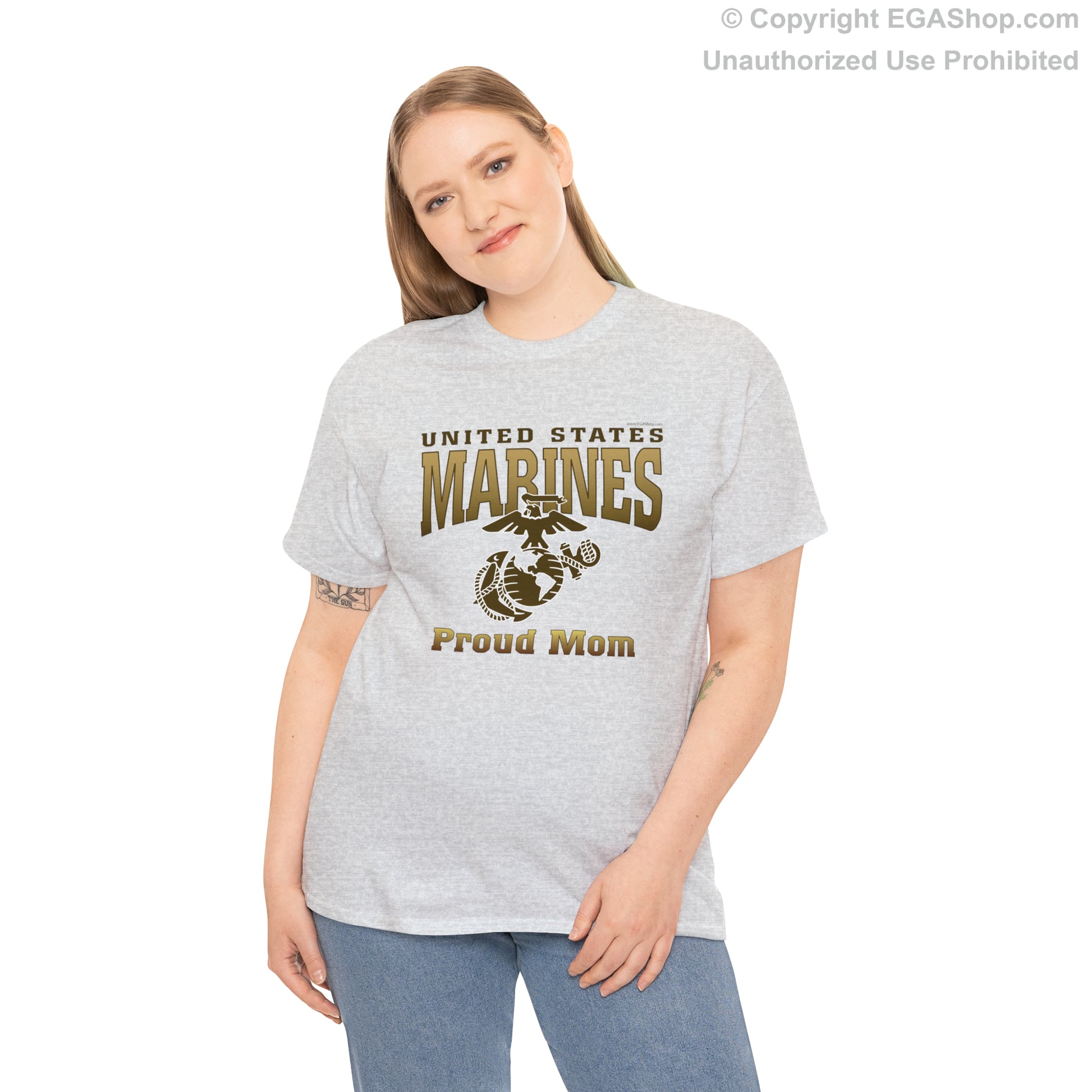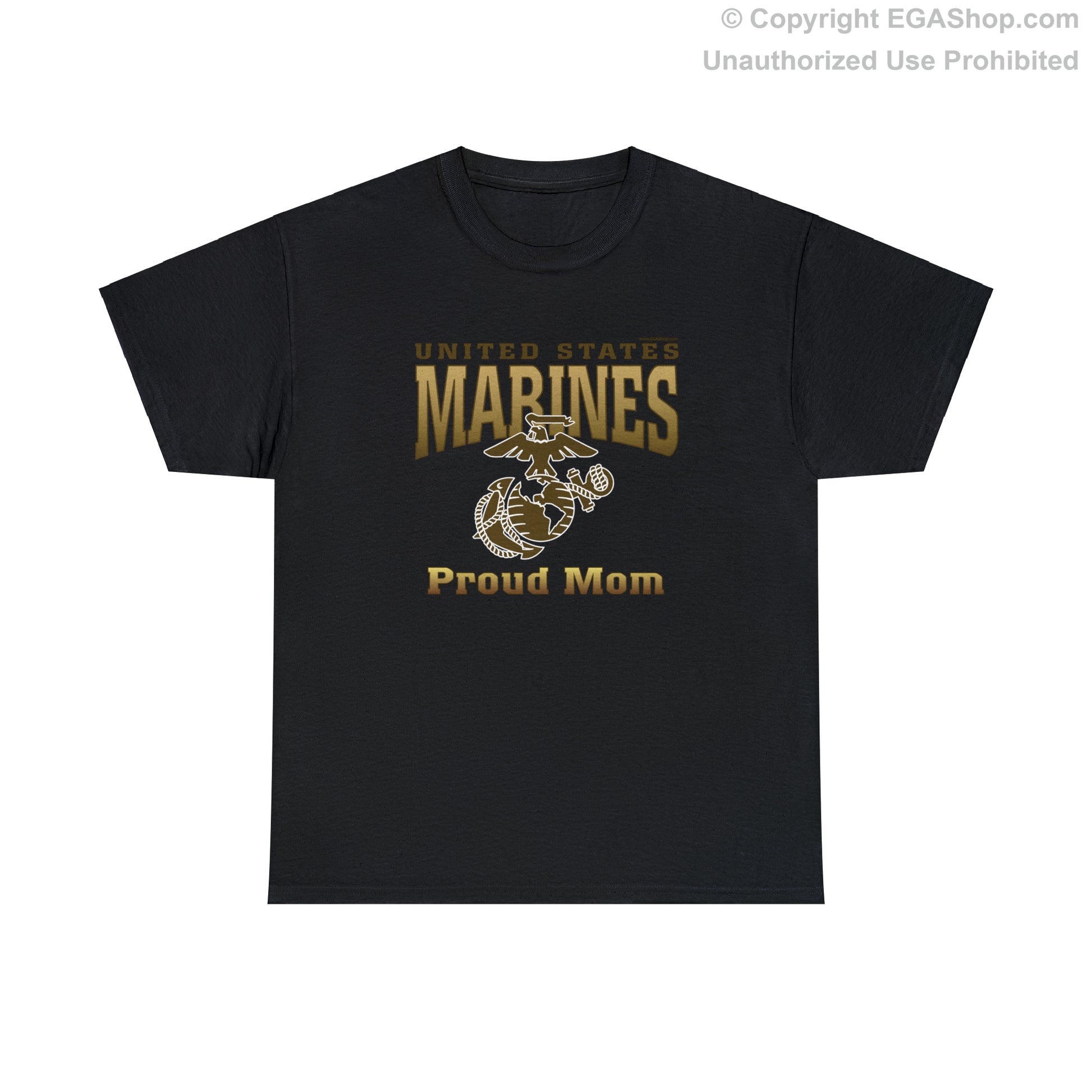 This design features United States Marines over the Eagle, Globe, and Anchor (EGA) and text below that reads PROUD MOM. The back is blank.