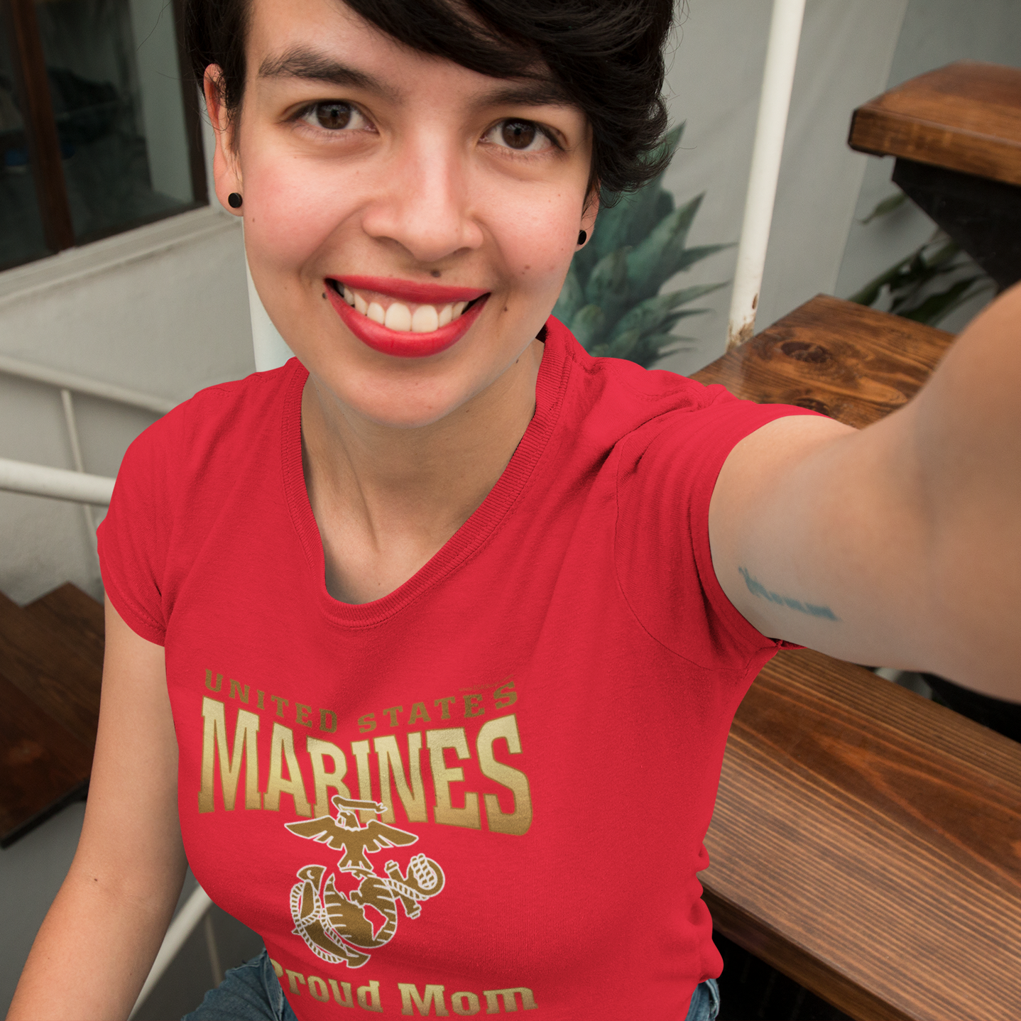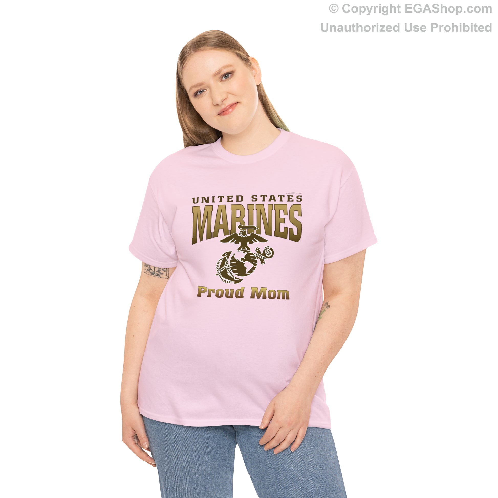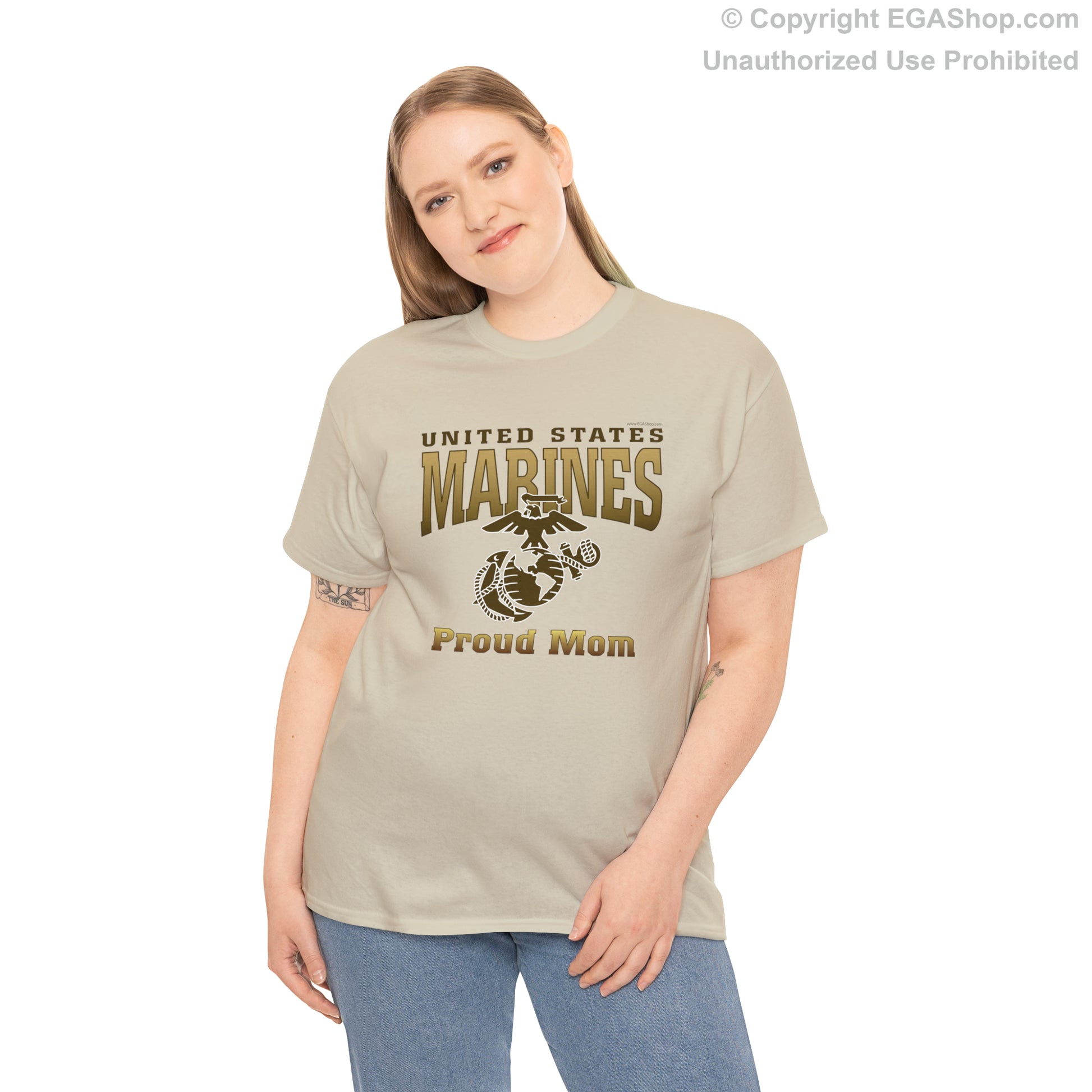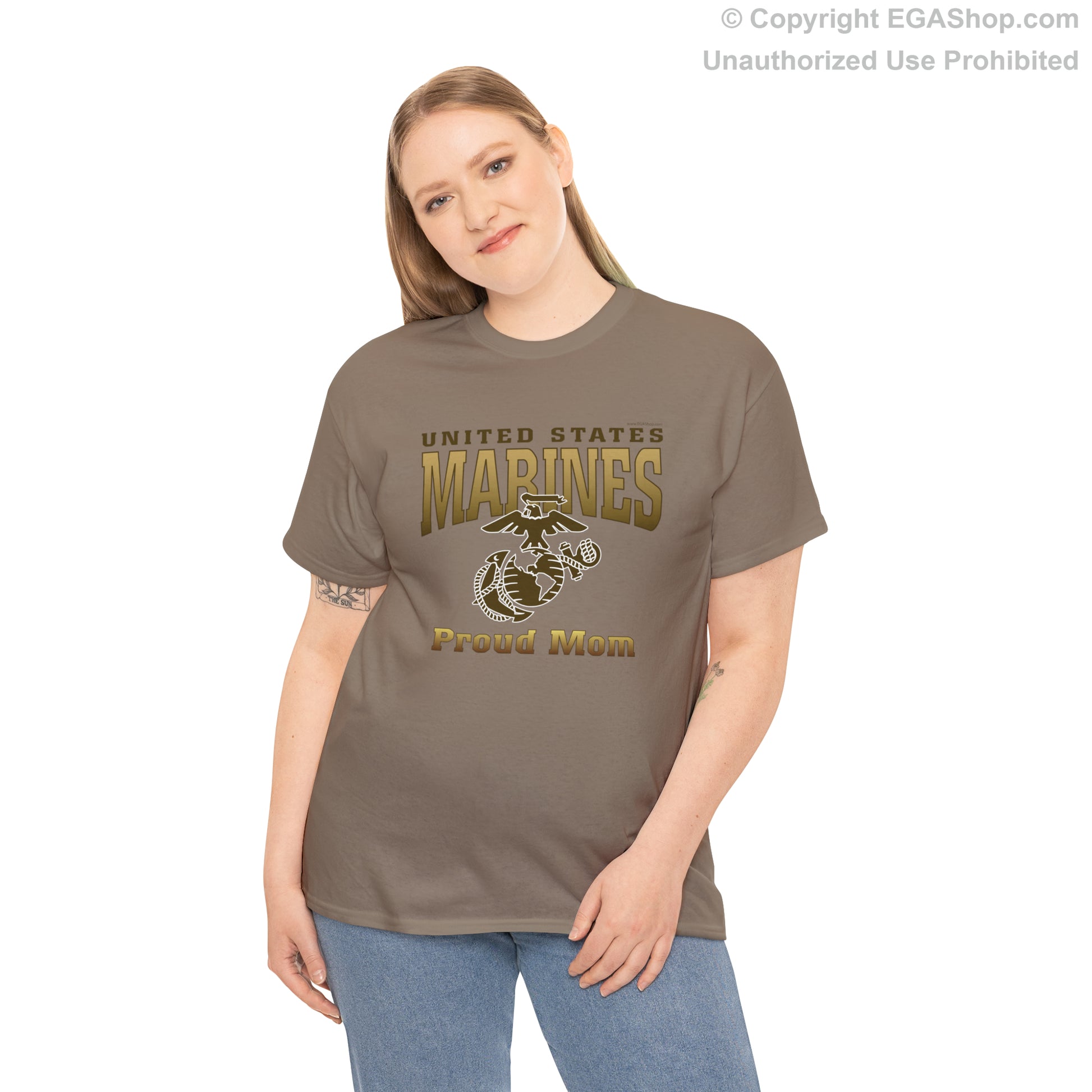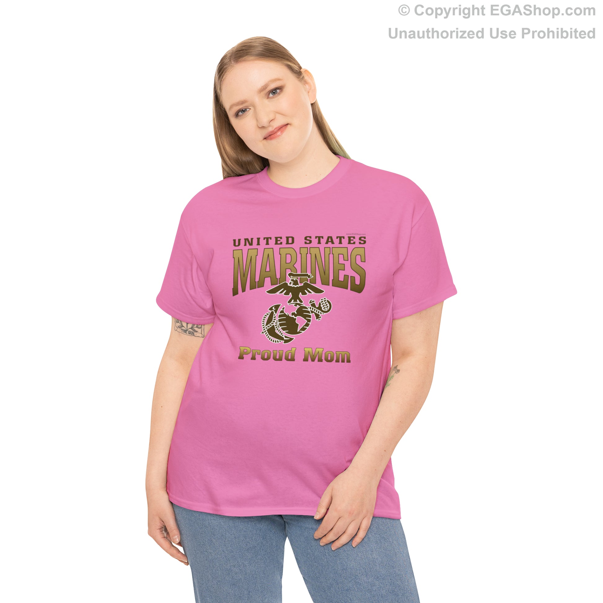 This design features United States Marines over the Eagle, Globe, and Anchor (EGA) and text below that reads PROUD MOM. The back is blank.