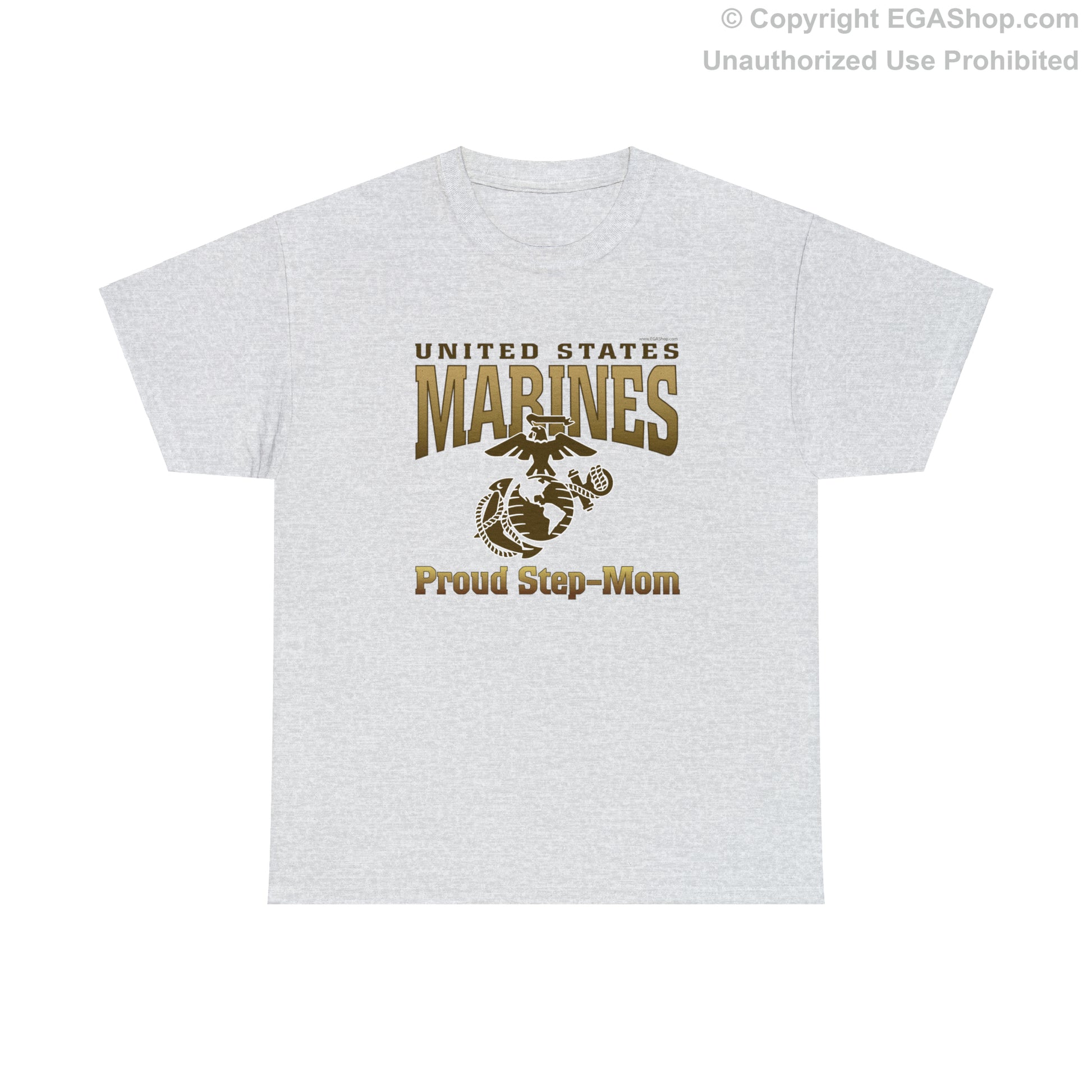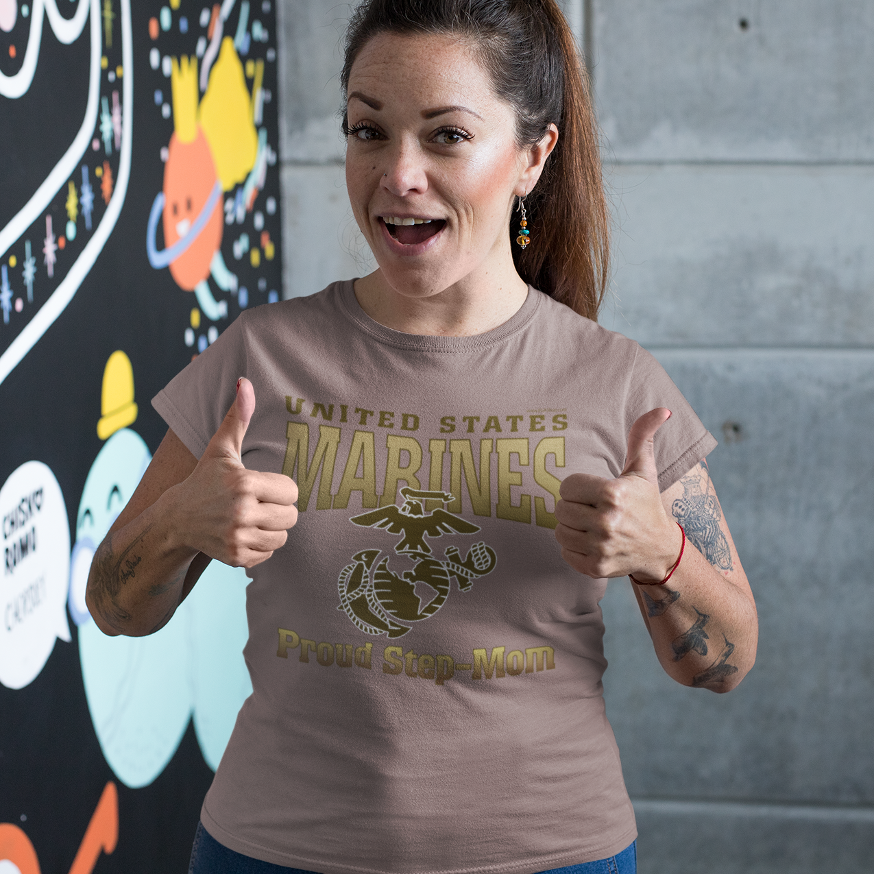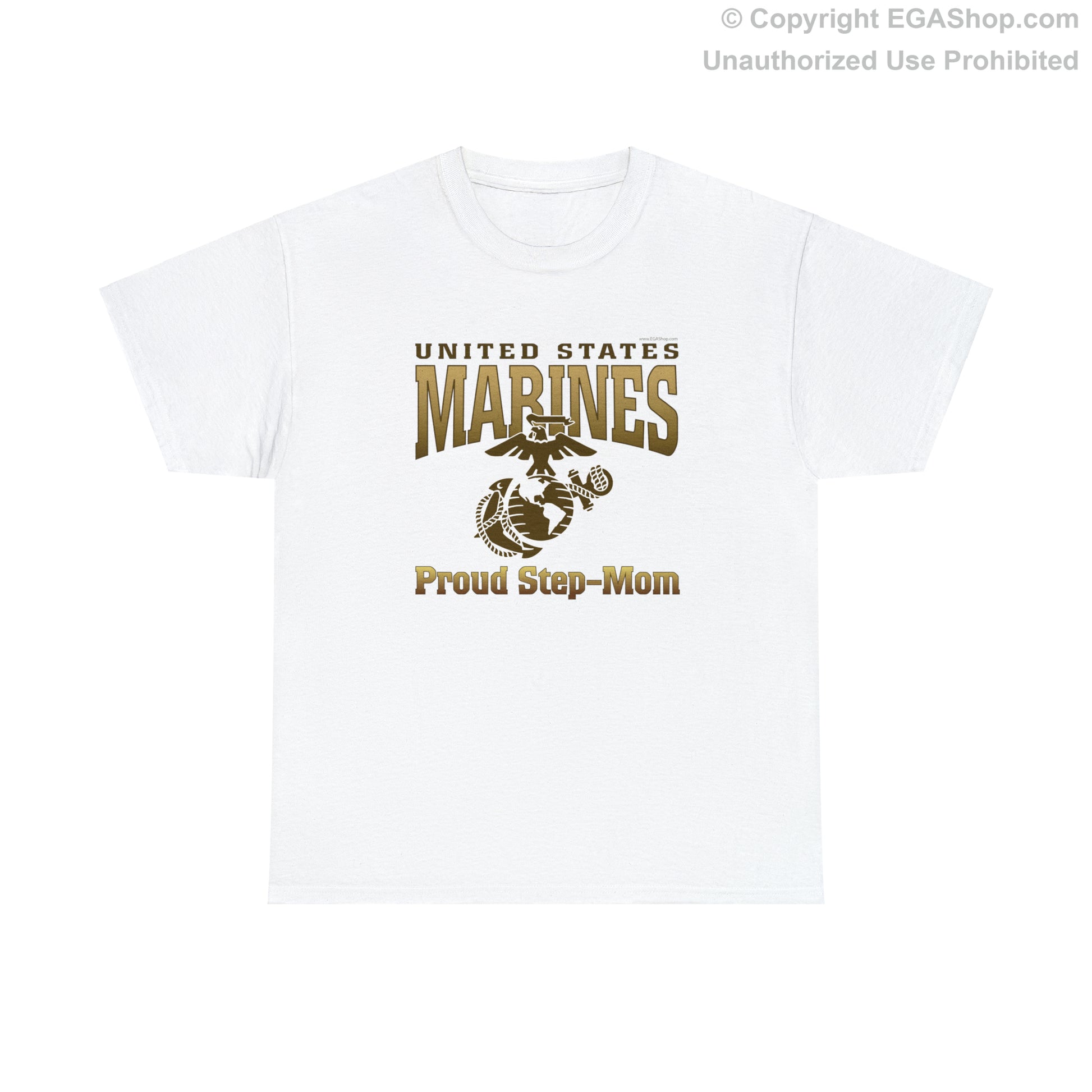 This design features United States Marines over the Eagle, Globe, and Anchor (EGA) and text below that reads Proud Step-Mom. The back is blank.
