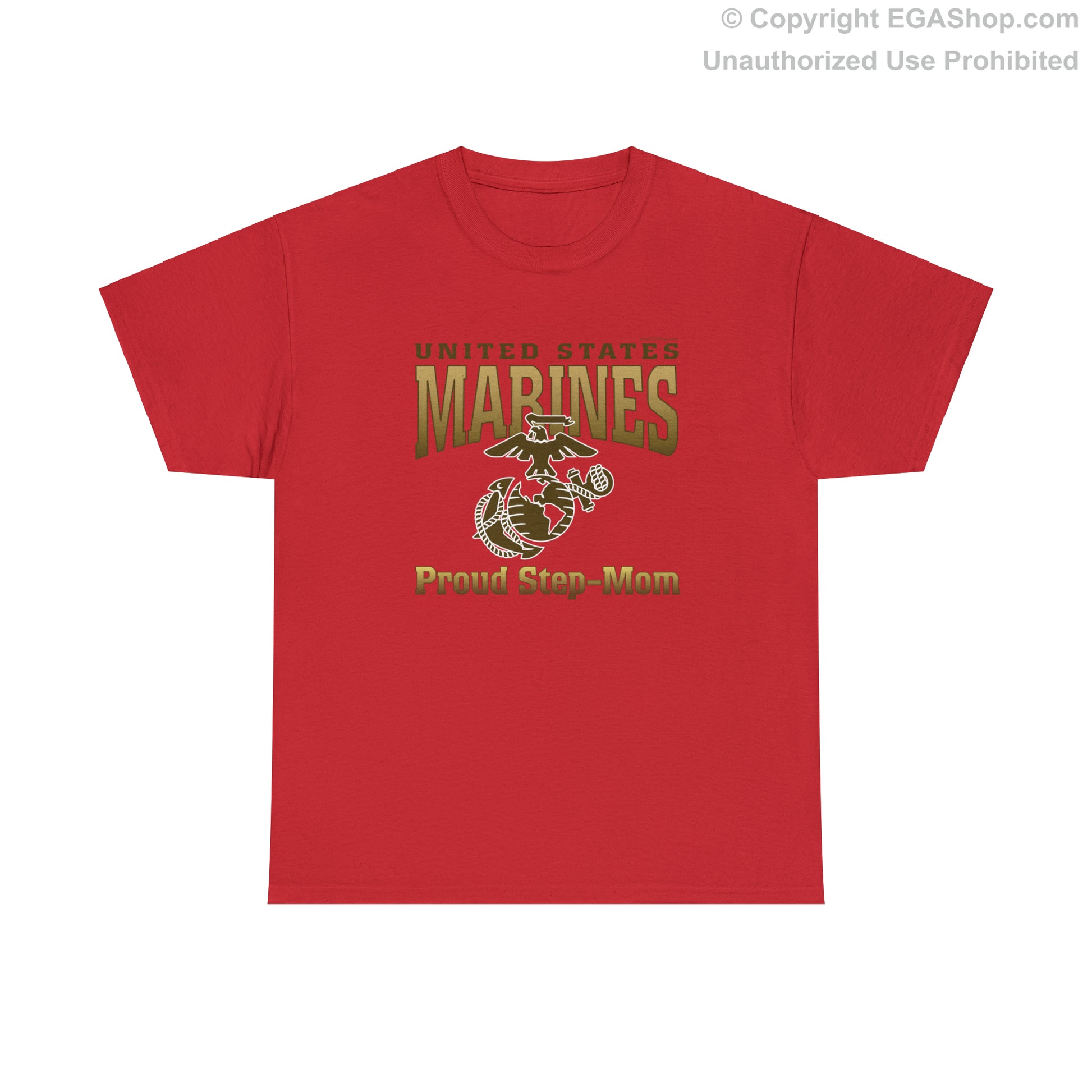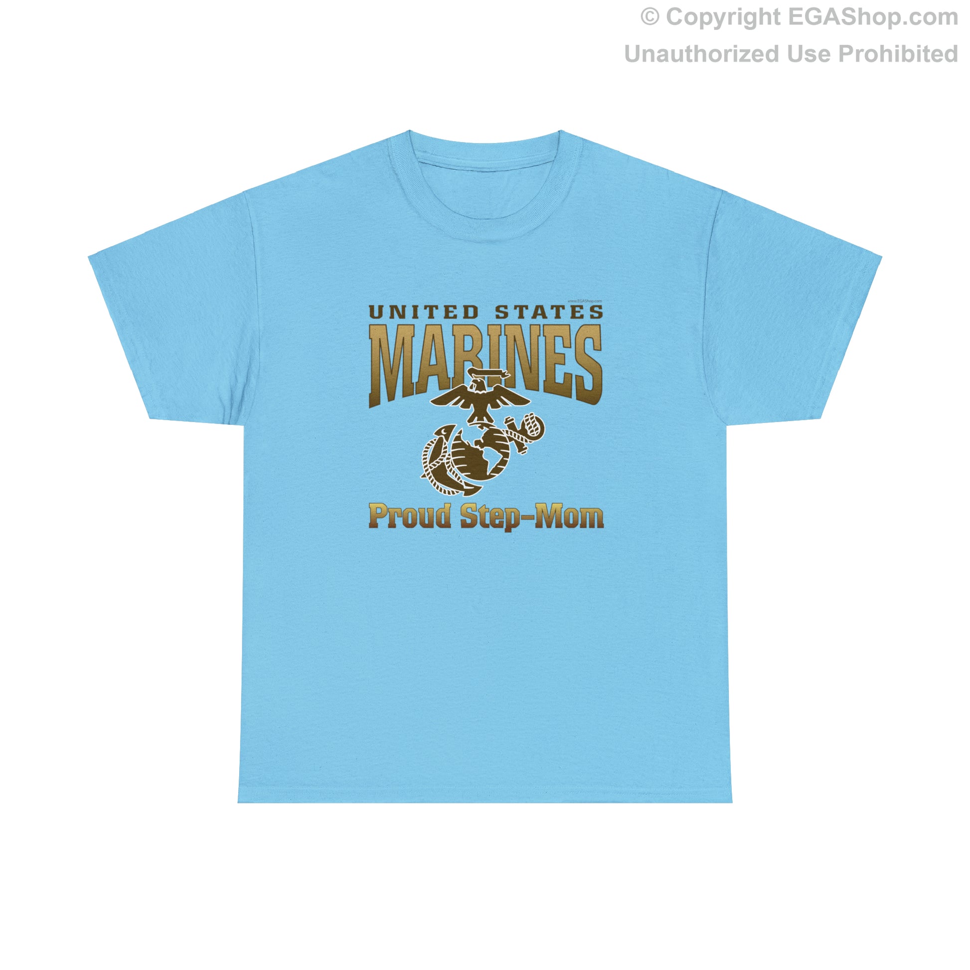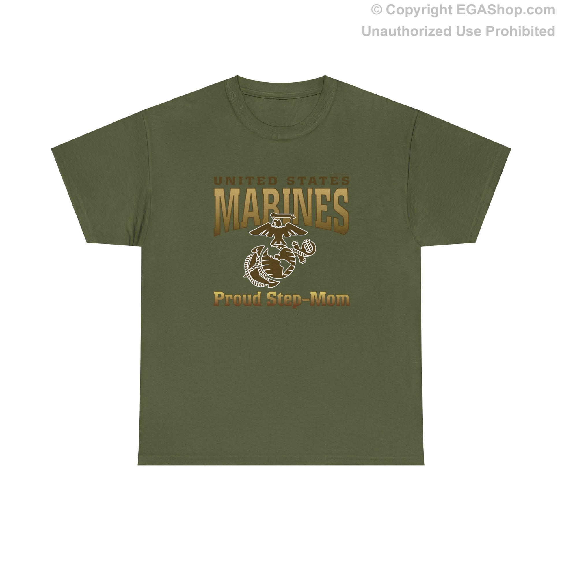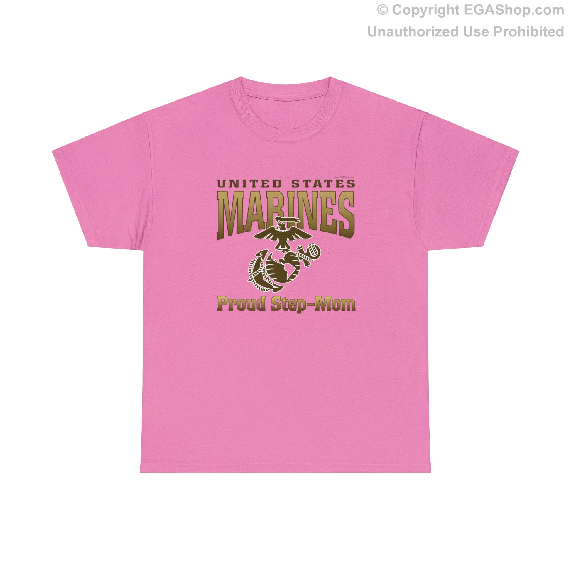 This design features United States Marines over the Eagle, Globe, and Anchor (EGA) and text below that reads Proud Step-Mom. The back is blank.