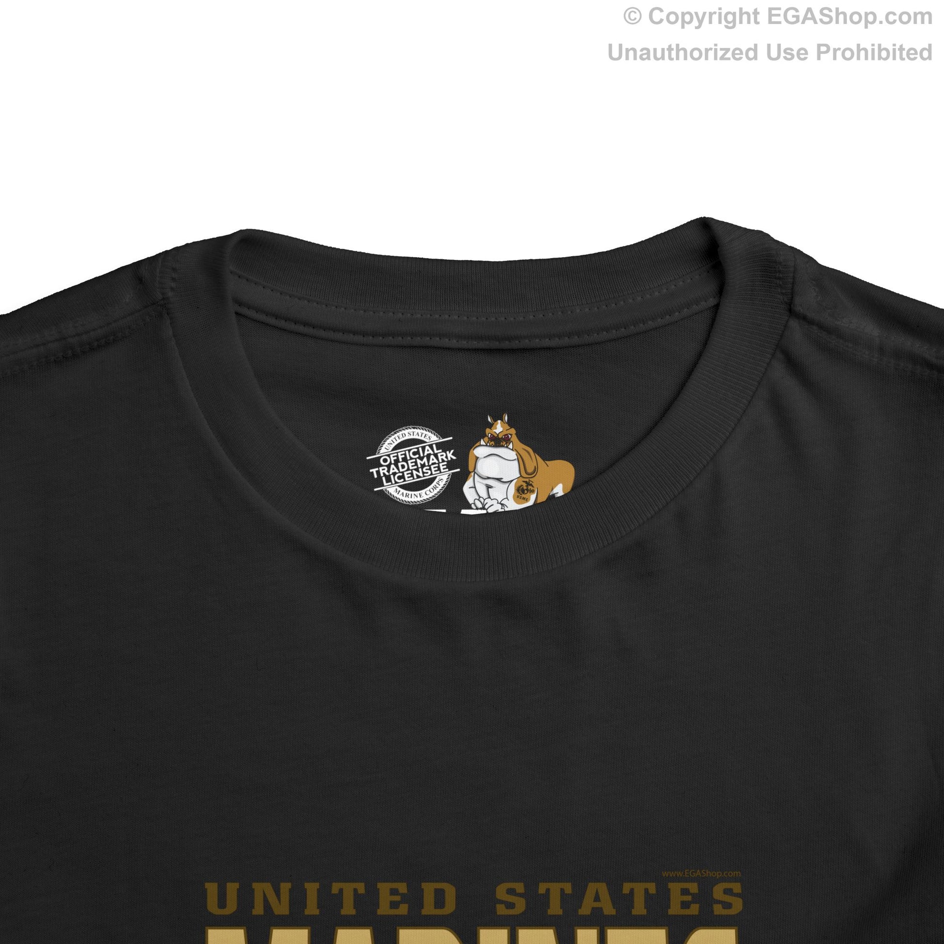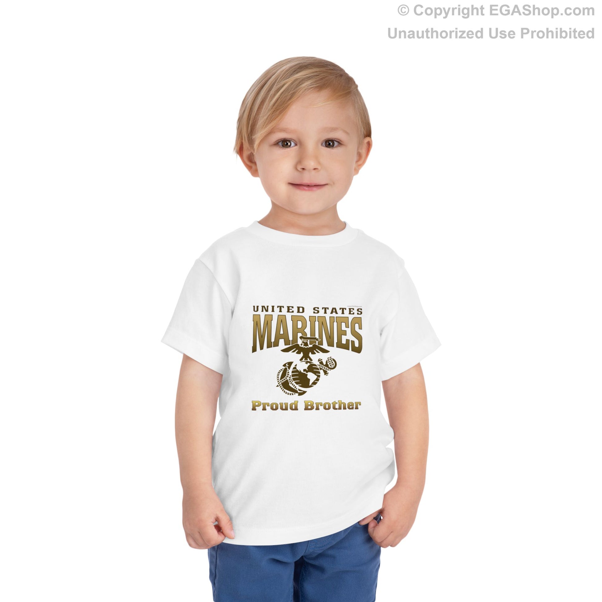 TODDLER SIZE. Uplift any child's wardrobe with this Marine Corps Toddler Shirt. The design on the front is US Marine Corps Proud Brother and the Marine Corps Eagle, Globe, and Anchor. The back of the shirt is blank. Available in TODDLER sizes 2T-5T.