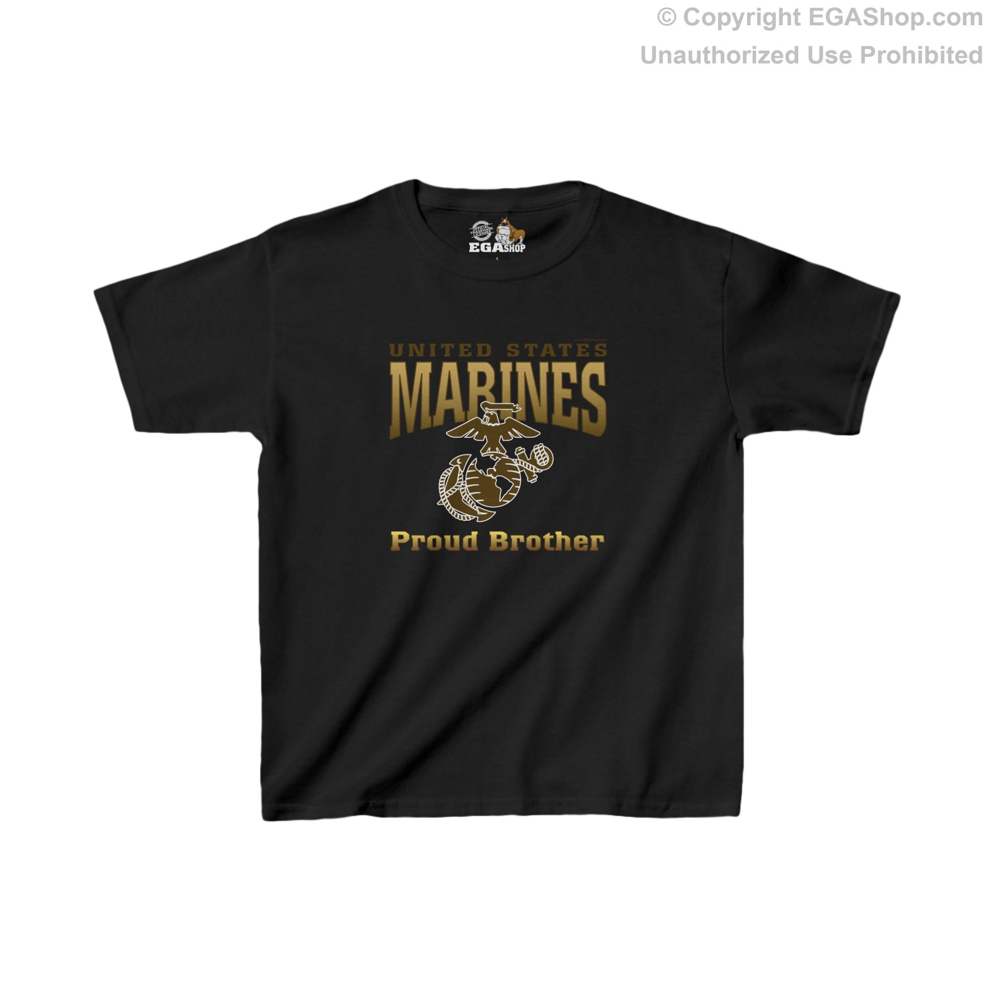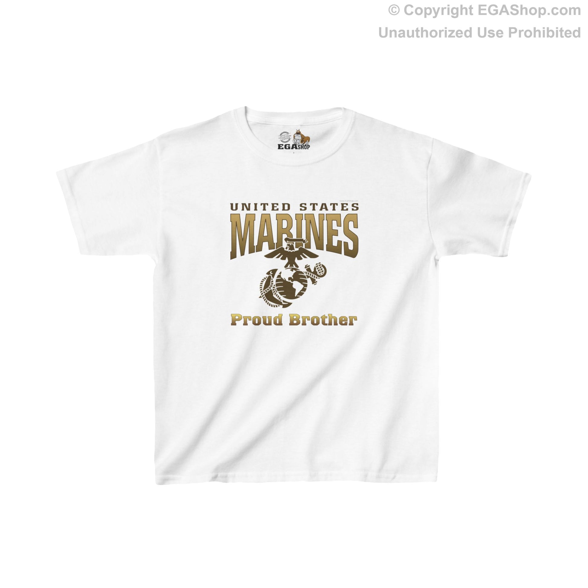 YOUTH SIZE. The kid's heavy cotton tee is perfect for everyday use. The design is US Marine Proud Brother and the Marine Corps Eagle, Globe, and Anchor on the front. The back is blank. Available in YOUTH sizes XS through XL.