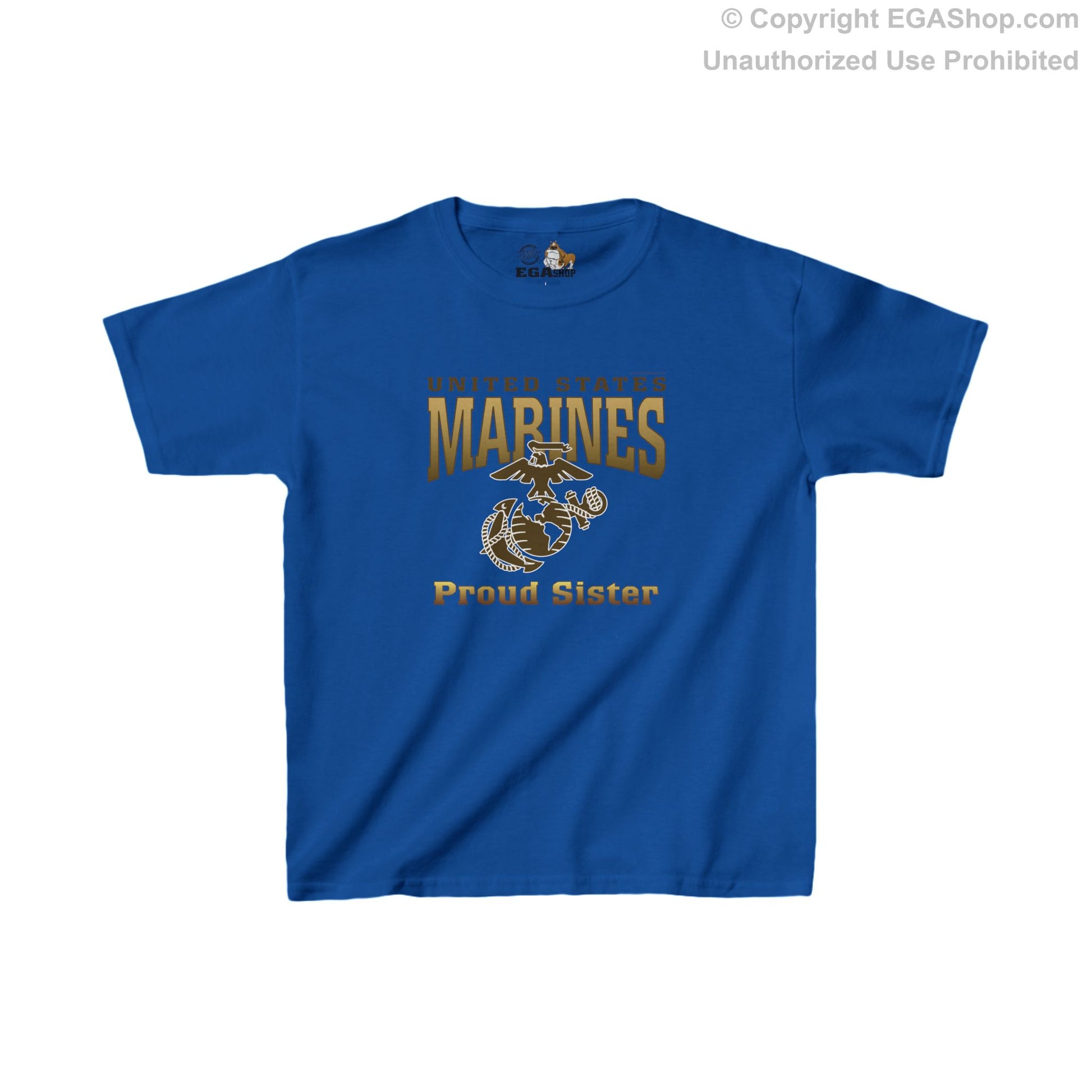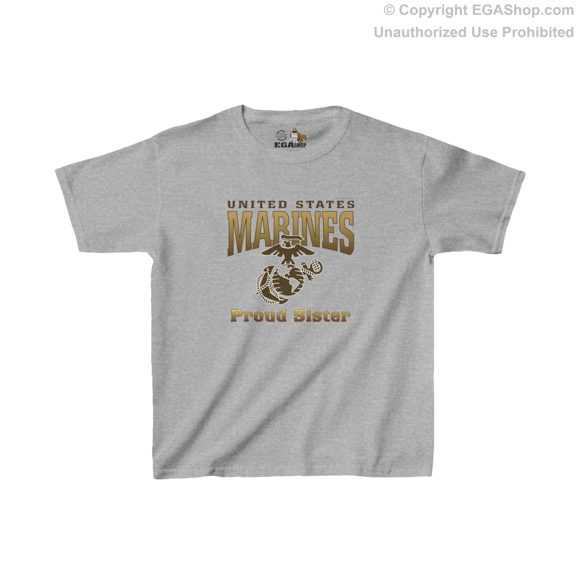 YOUTH SIZE. The kid's heavy cotton tee is perfect for everyday use. The design is US Marine Proud Sister and the Marine Corps Eagle, Globe, and Anchor on the front. The back is blank. Available in YOUTH sizes XS through XL.