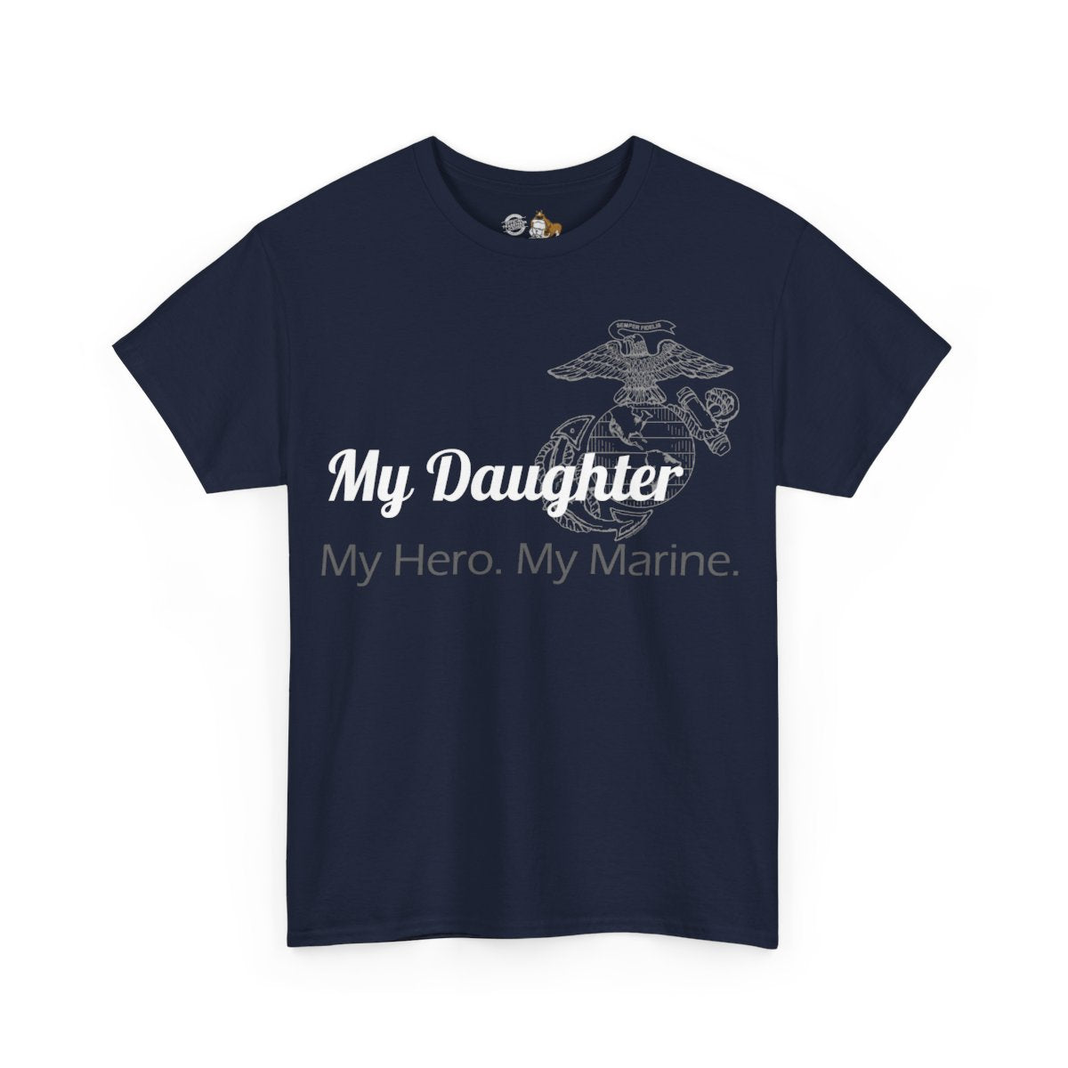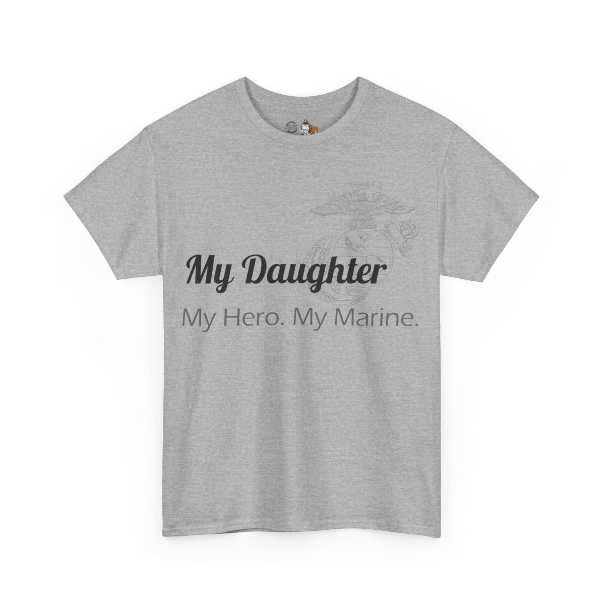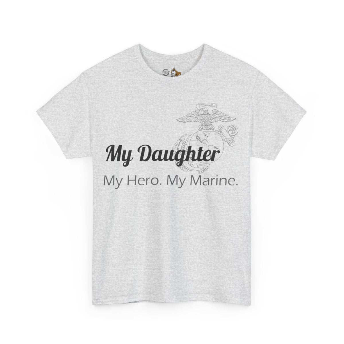 If your Marine is your hero, this is the shirt for you! My _____. My Hero. My Marine. You choose the affiliation that describes your Marine. Behind the text is a light grey line-drawn Eagle, Globe, and Anchor. The light grey color is intentionally muted on certain color shirts. See images. The back is blank. This is printed on a Gildan brand unisex heavy cotton T-shirt.