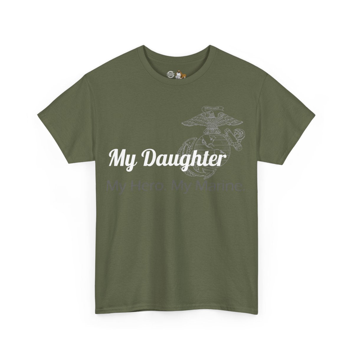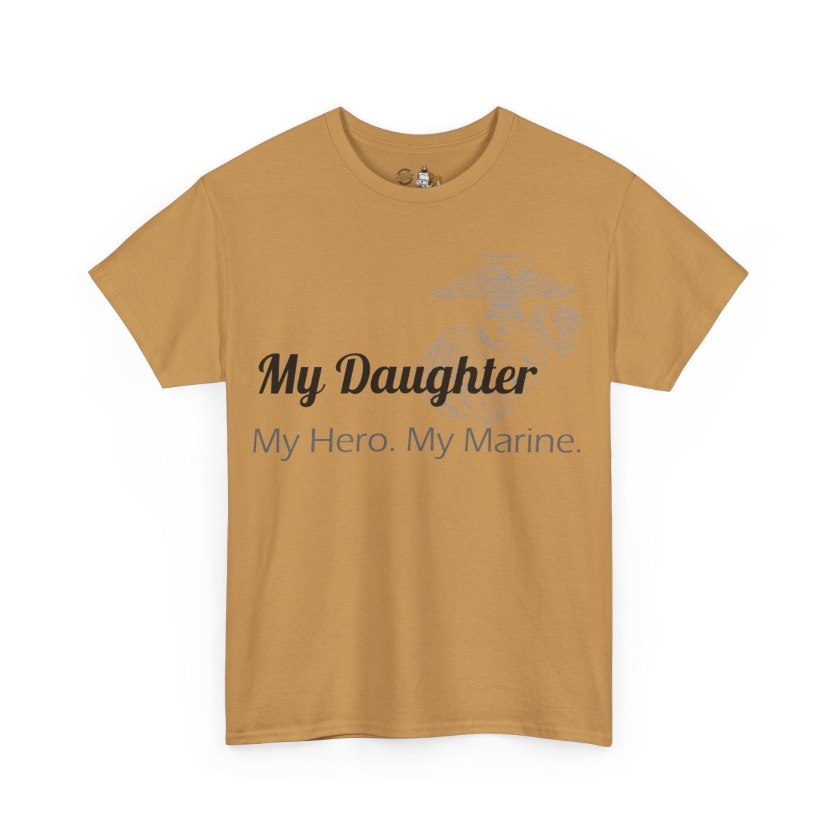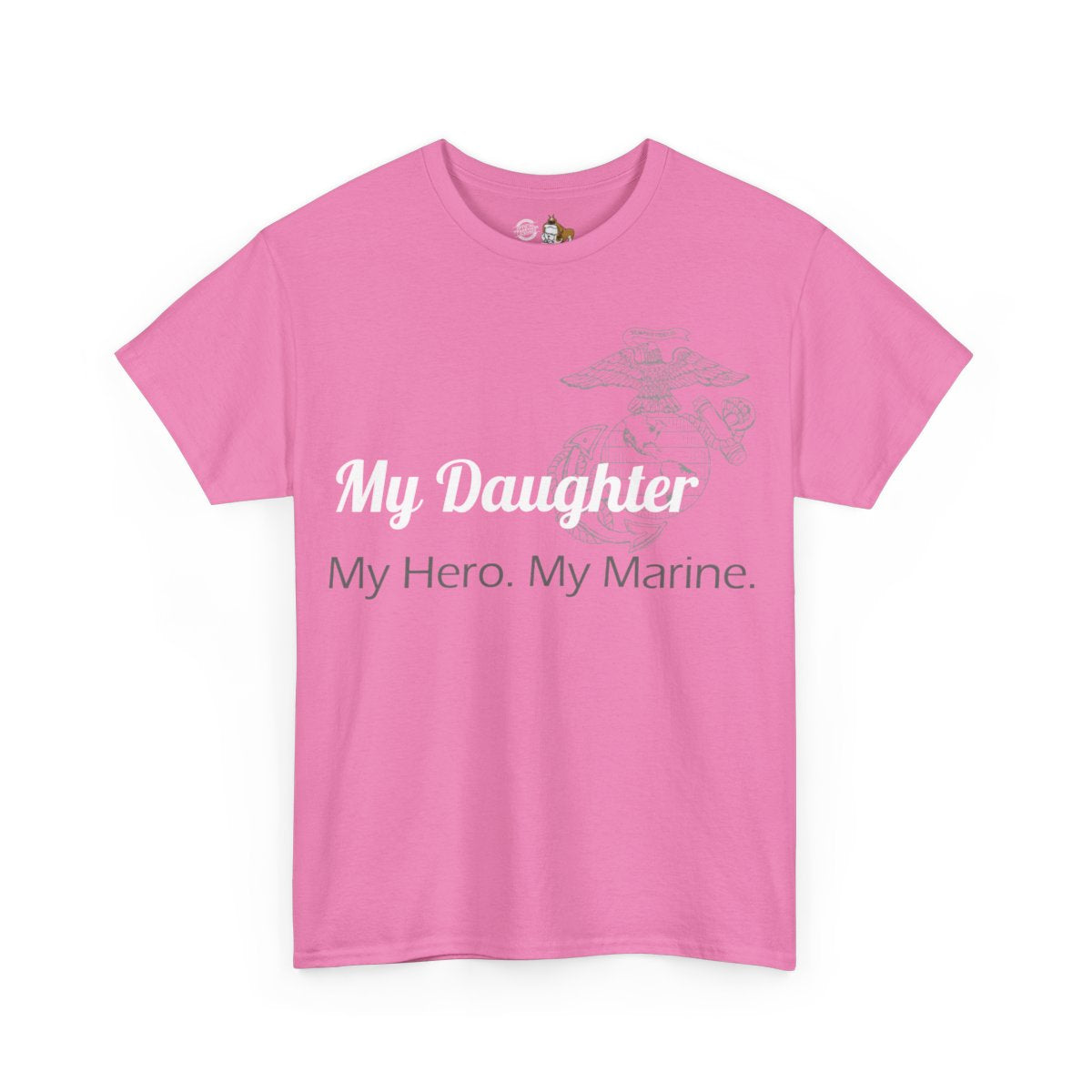 If your Marine is your hero, this is the shirt for you! My _____. My Hero. My Marine. You choose the affiliation that describes your Marine. Behind the text is a light grey line-drawn Eagle, Globe, and Anchor. The light grey color is intentionally muted on certain color shirts. See images. The back is blank. This is printed on a Gildan brand unisex heavy cotton T-shirt.