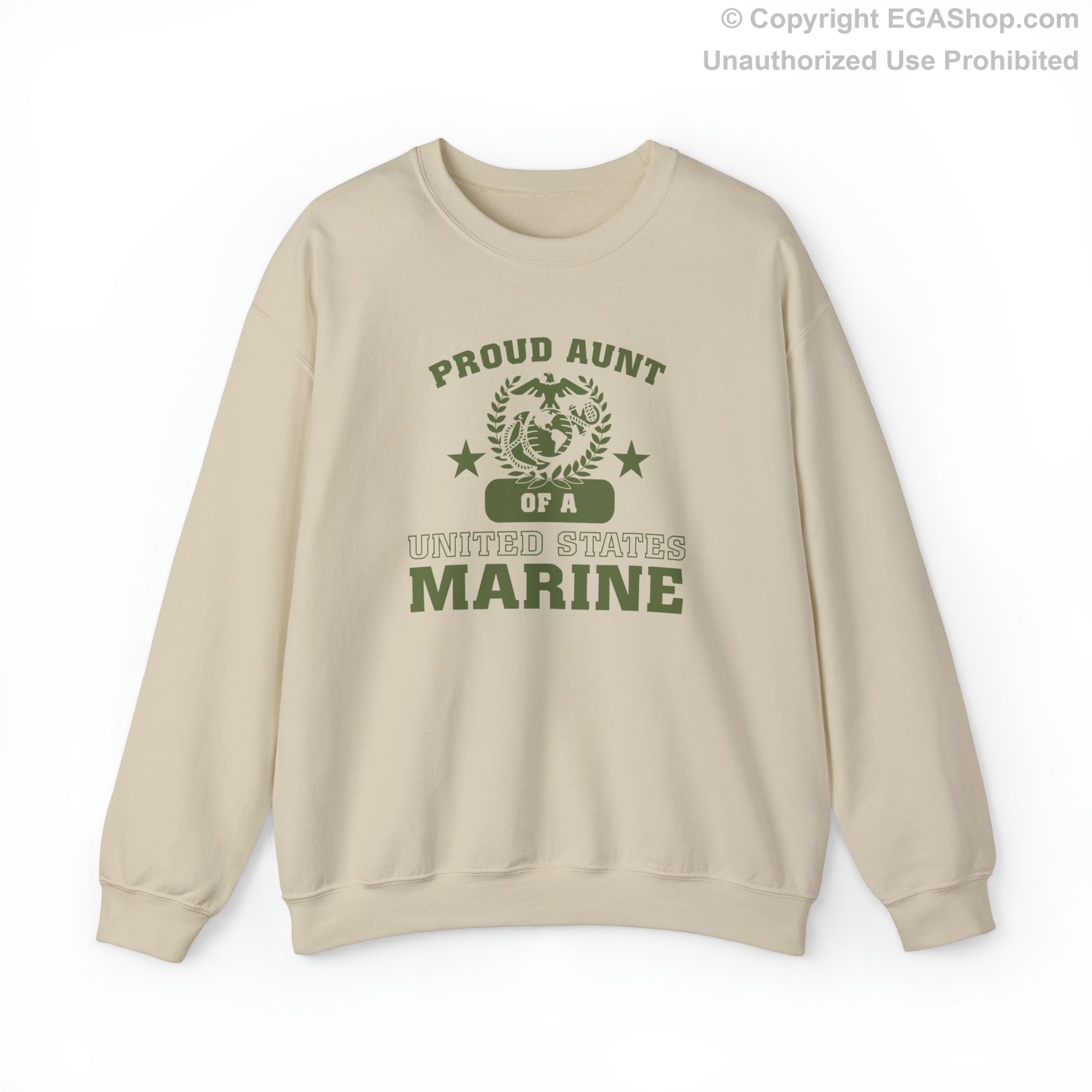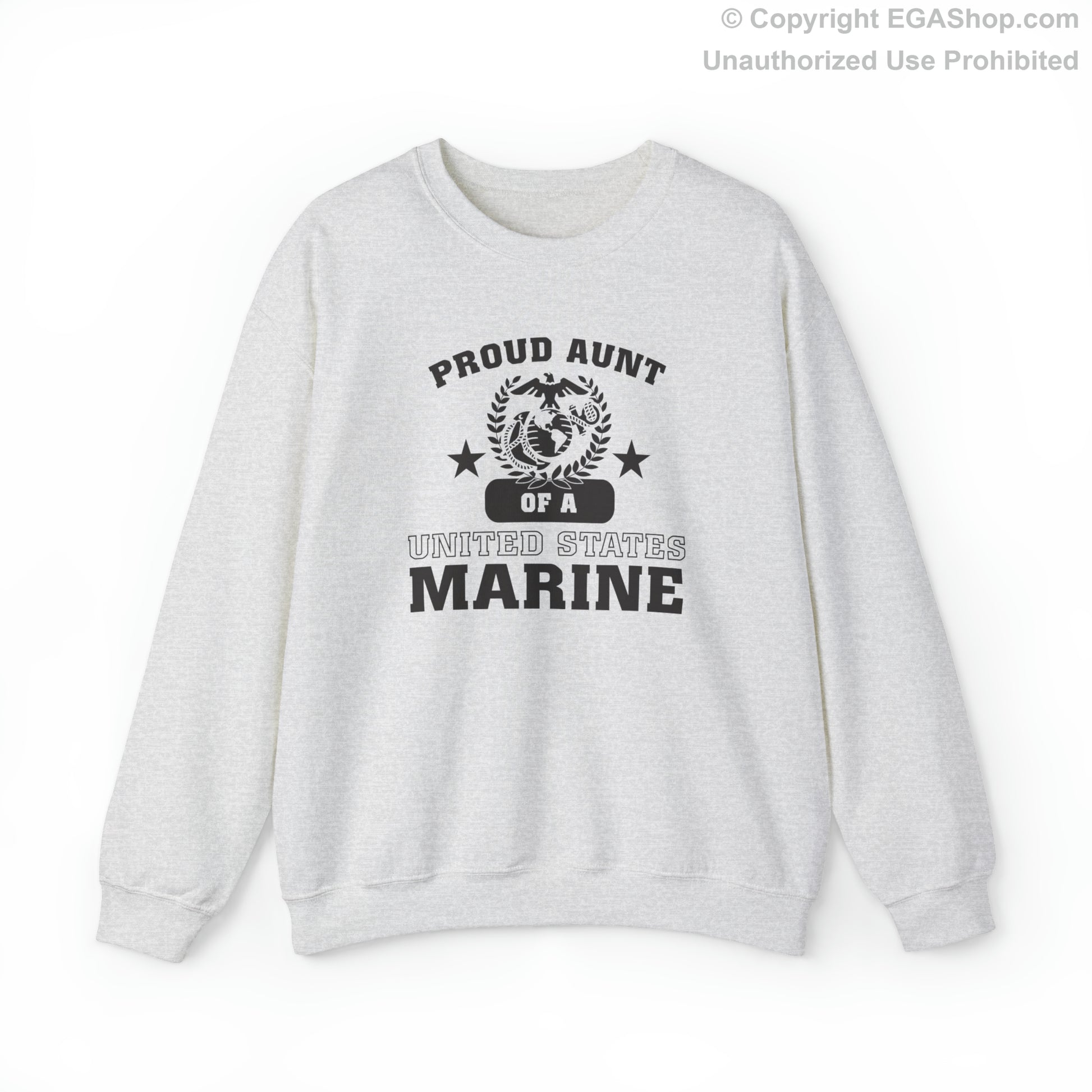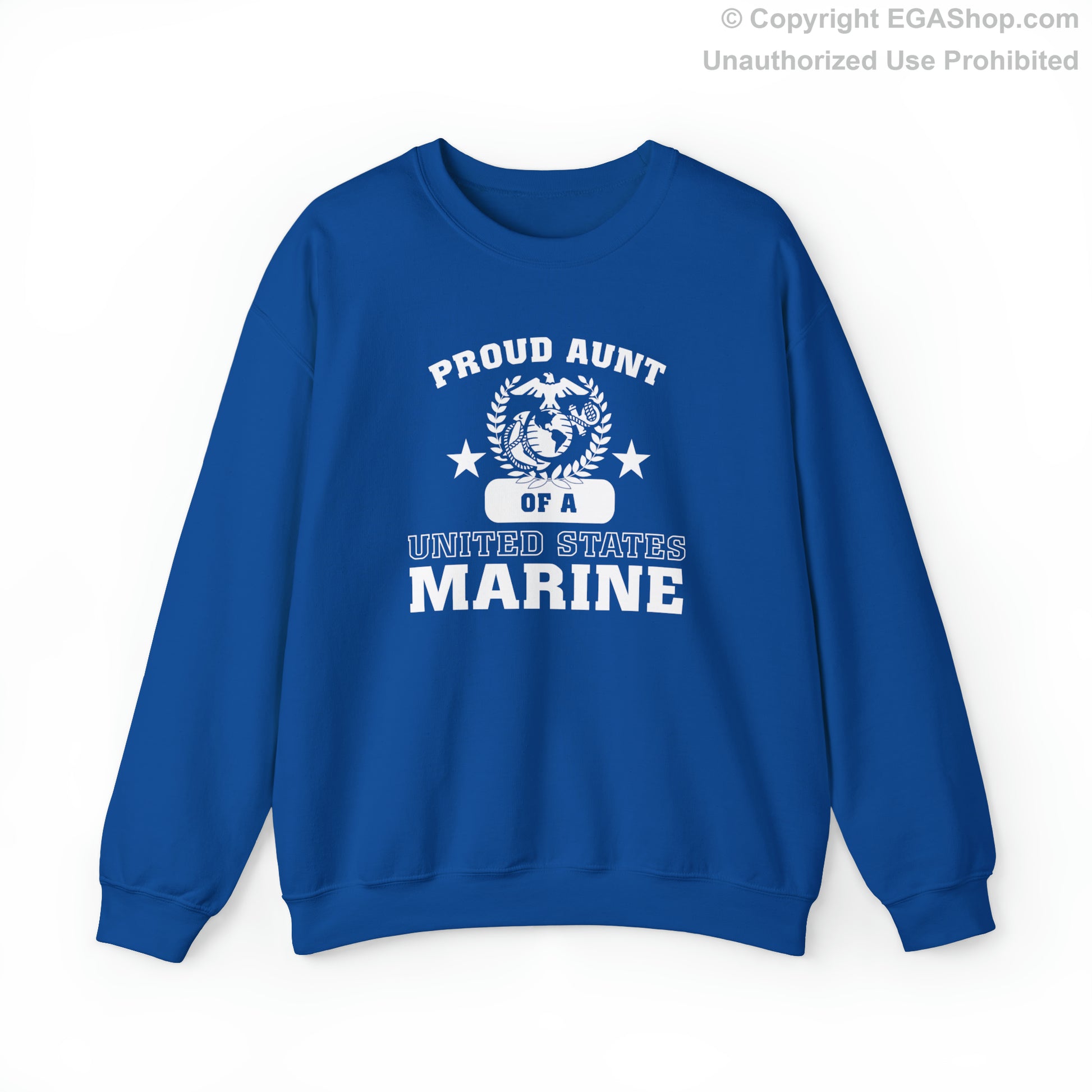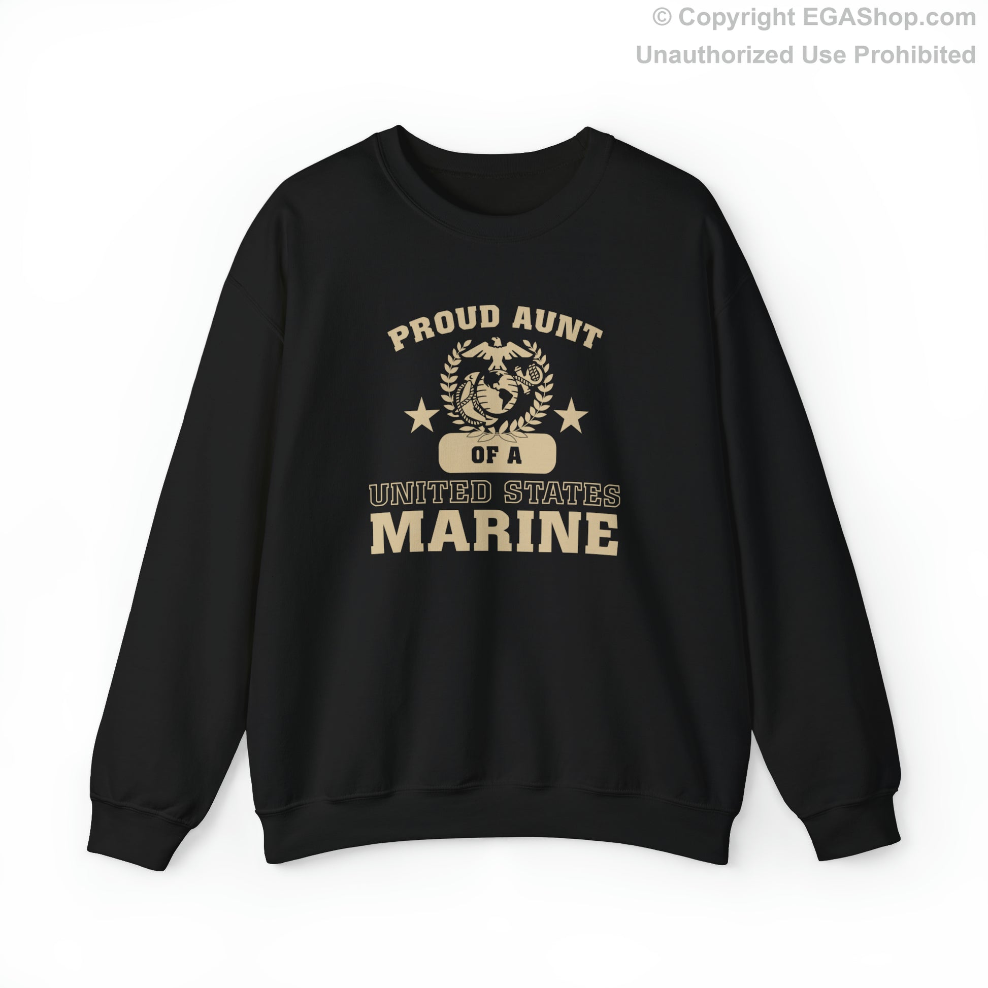 Our varsity Marine Family sweatshirt features the Marine Corps Eagle, Globe, and Anchor (EGA) in a laurel leaf with stars on either side. The text reads, "Proud Aunt of a United States Marine." The back is blank.