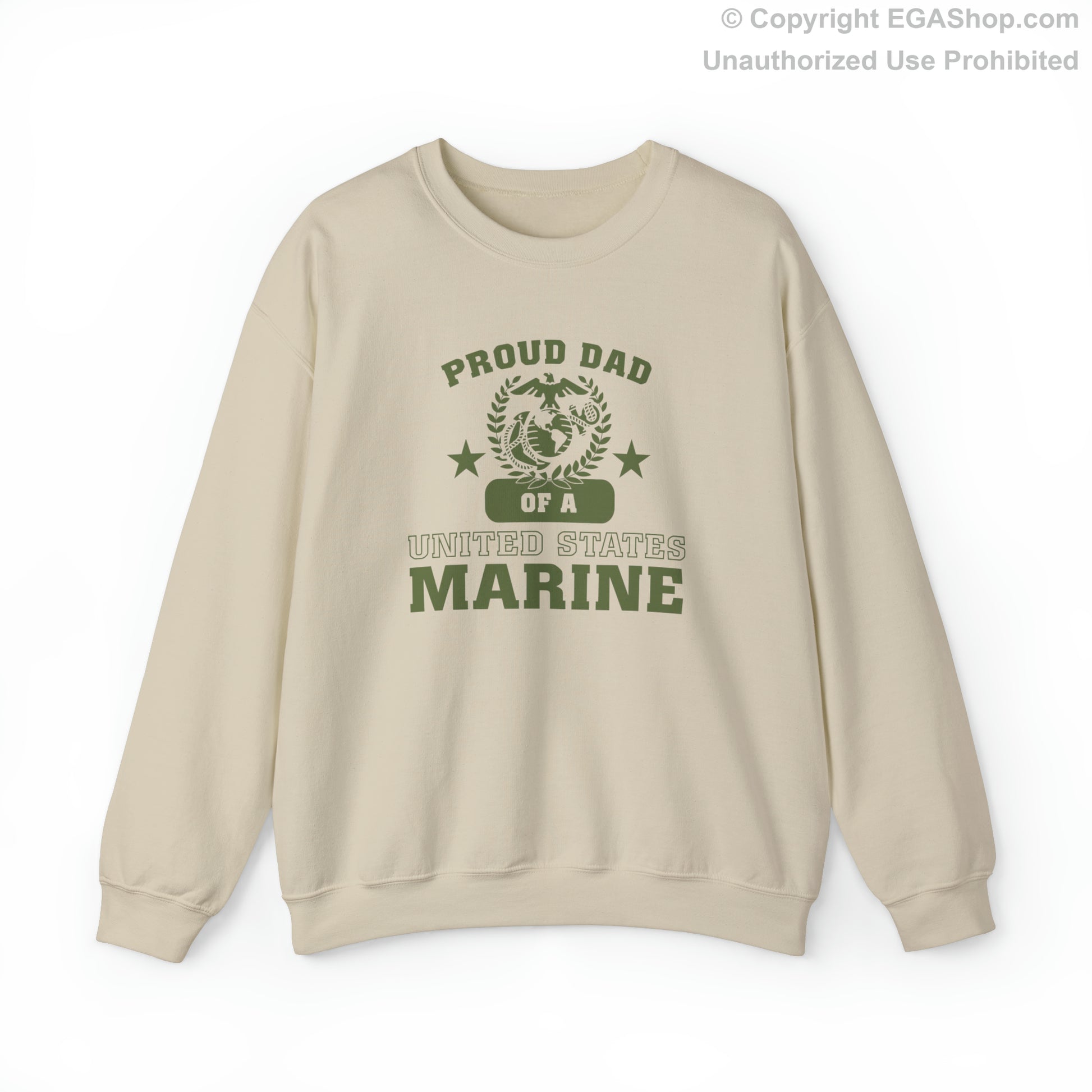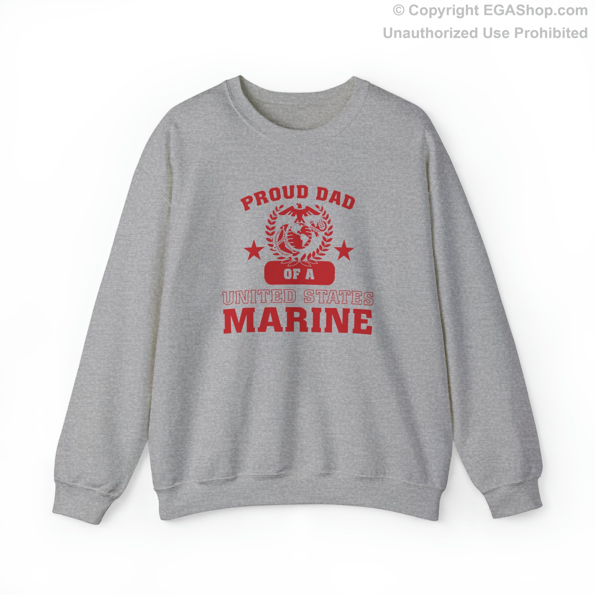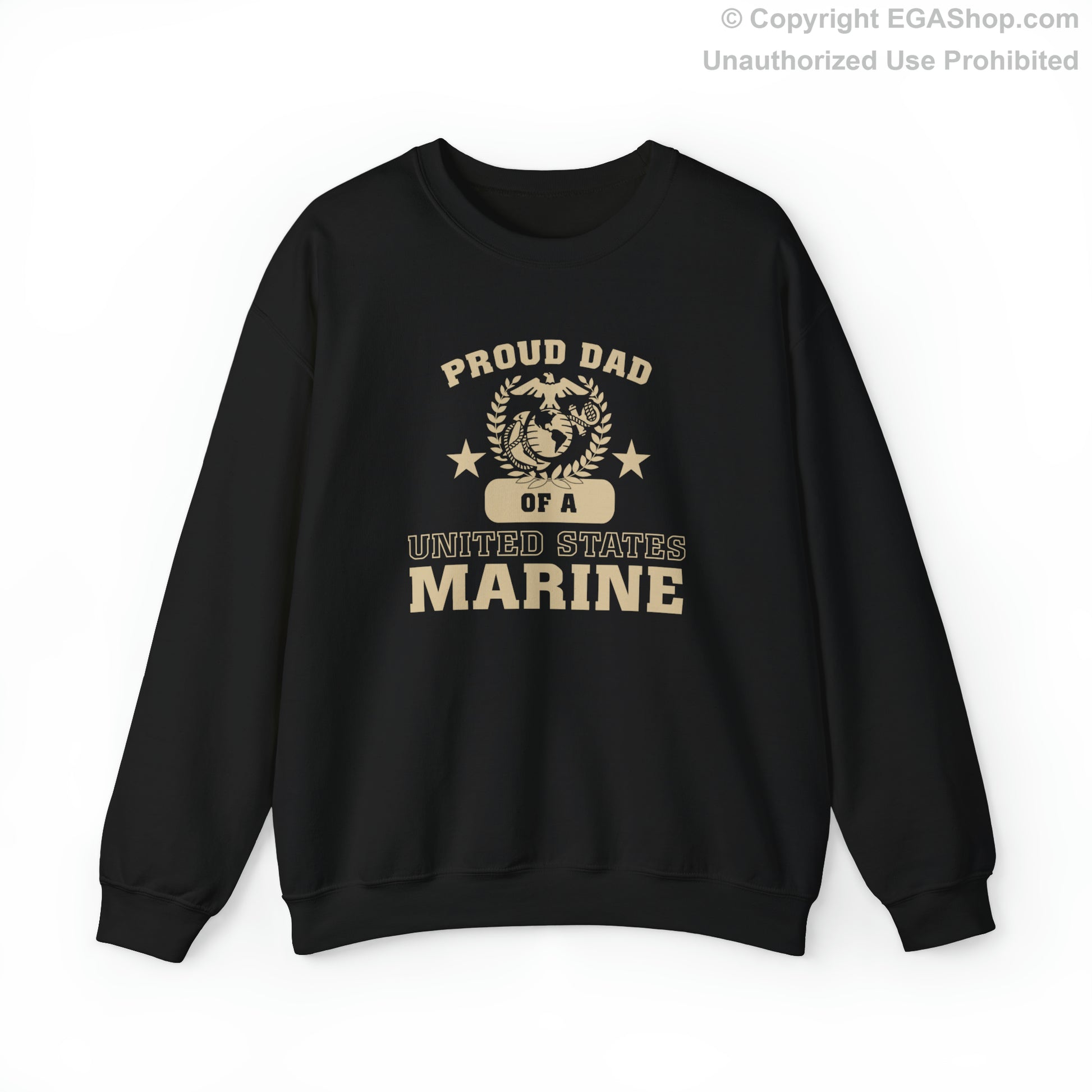 Our varsity Marine Family sweatshirt features the Marine Corps Eagle, Globe, and Anchor (EGA) in a laurel leaf with stars on either side. The text reads, "Proud DAD of a United States Marine." The back is blank.