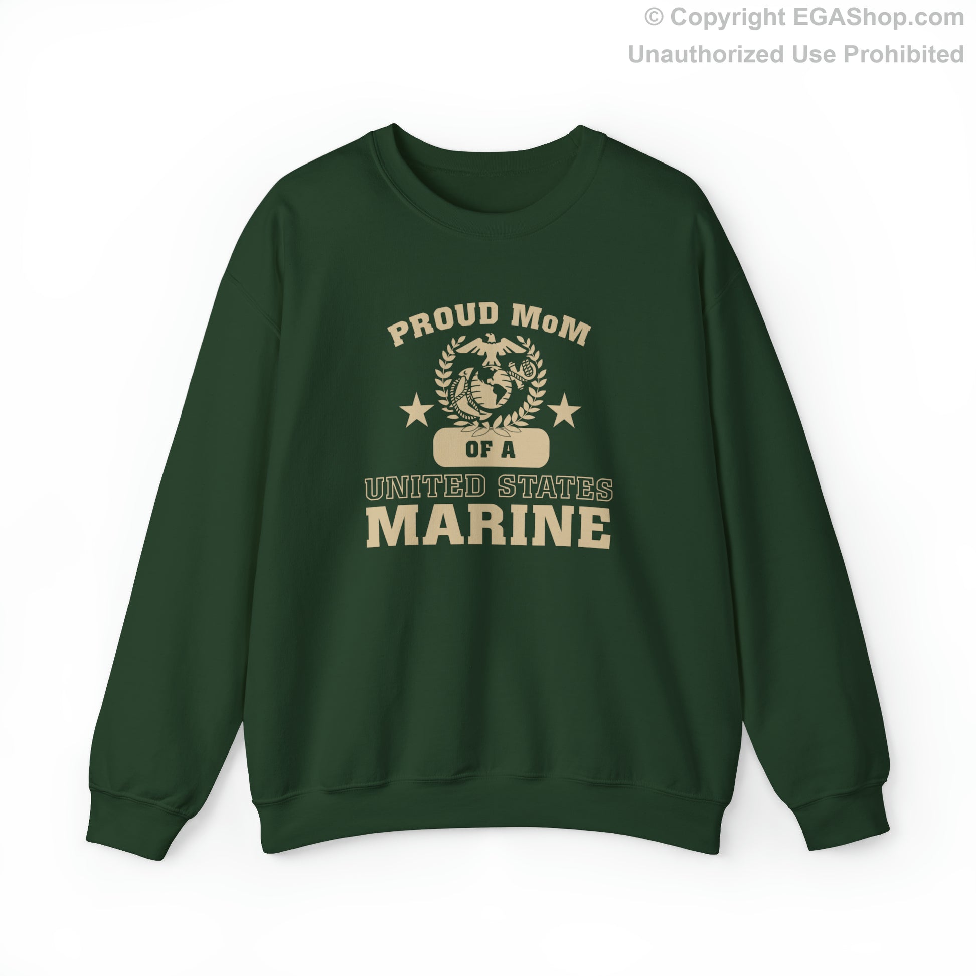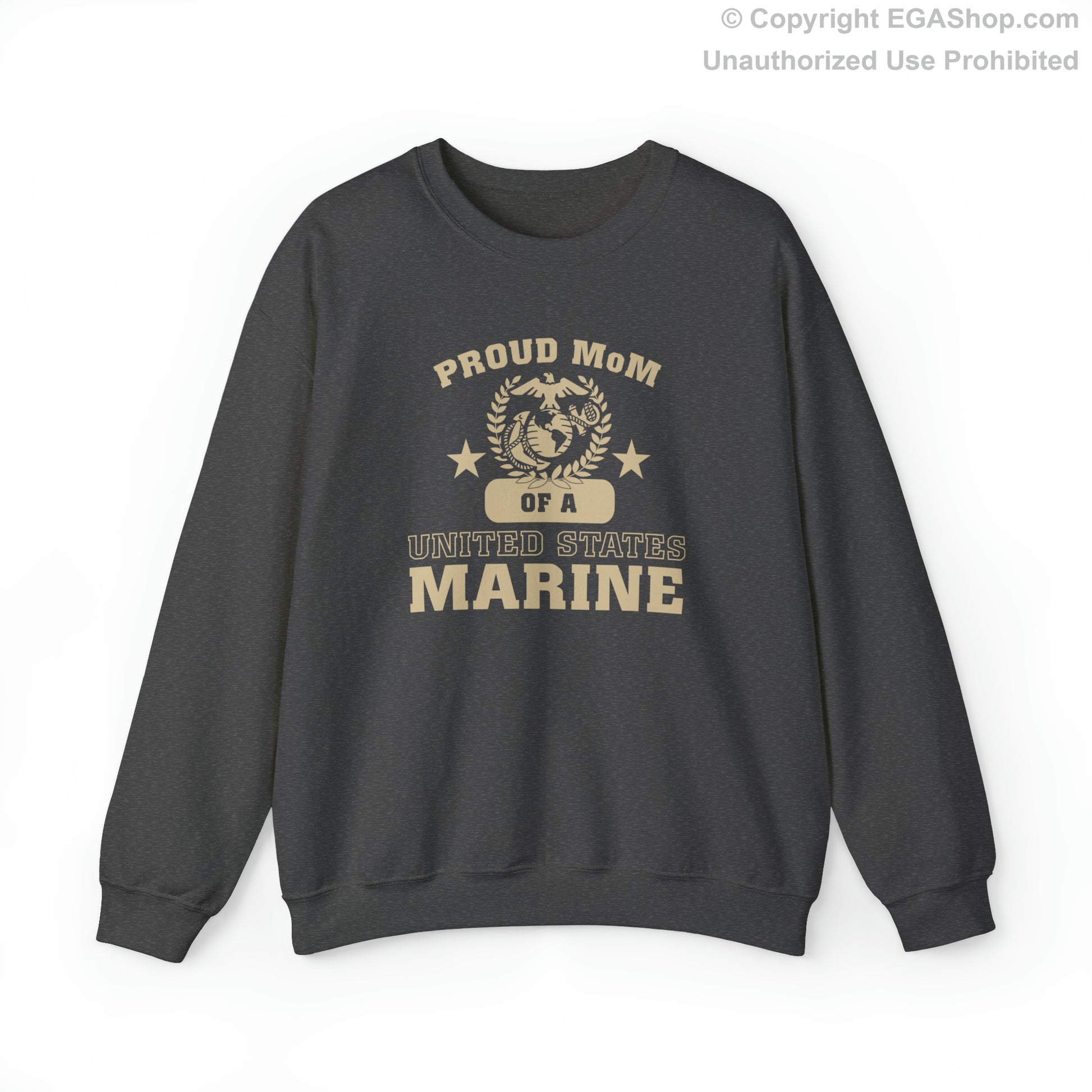 Our varsity Marine Family sweatshirt features the Marine Corps Eagle, Globe, and Anchor (EGA) in a laurel leaf with stars on either side. The text reads, "Proud MoM of a United States Marine." The back is blank.